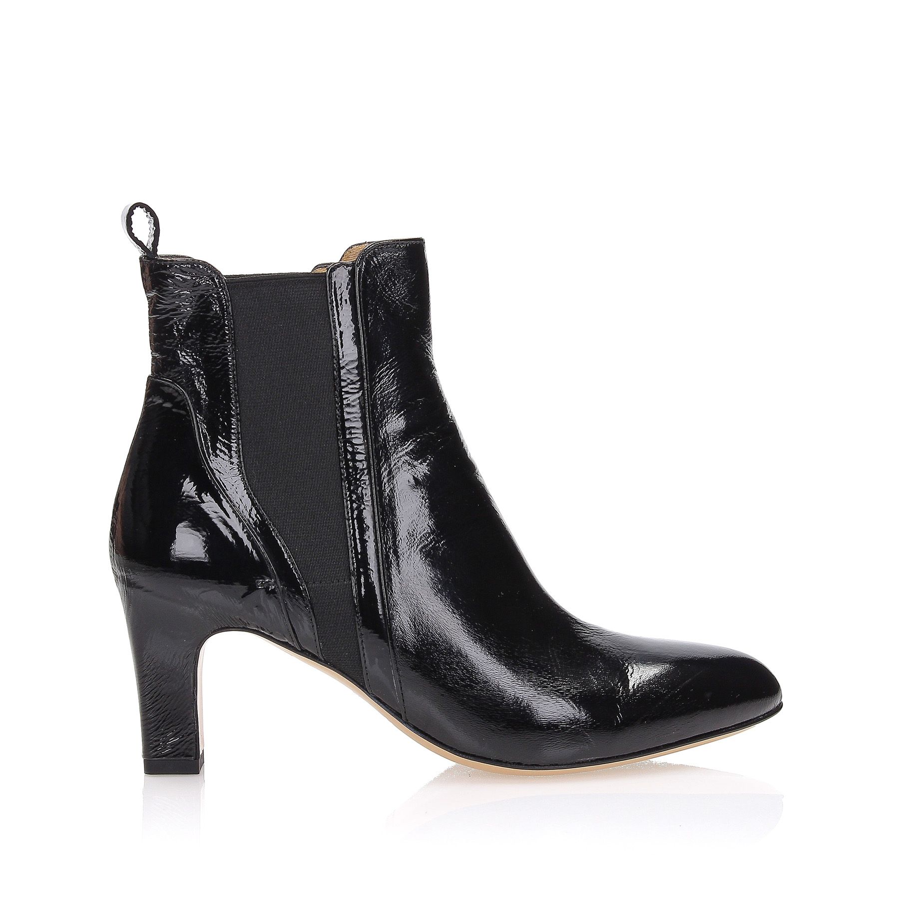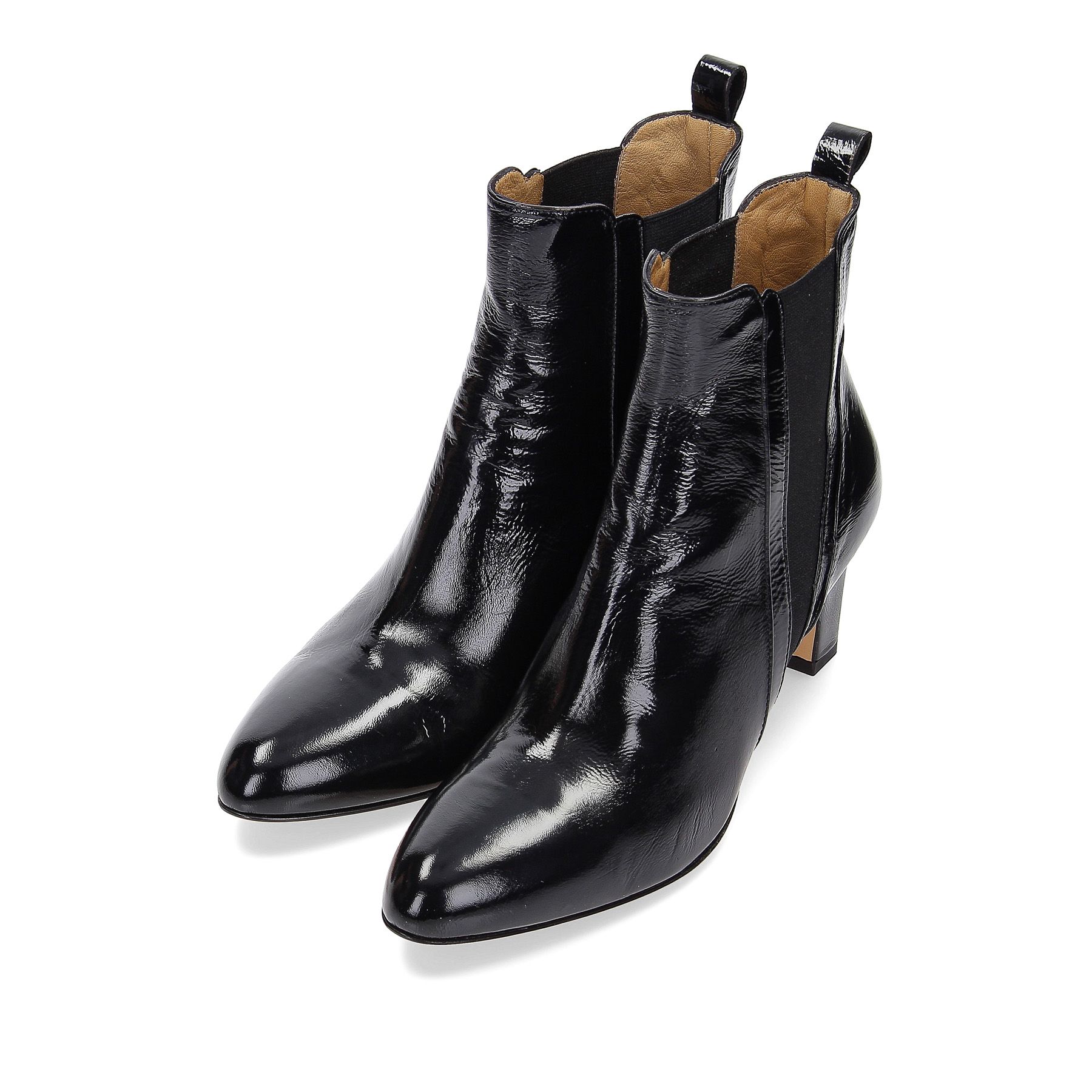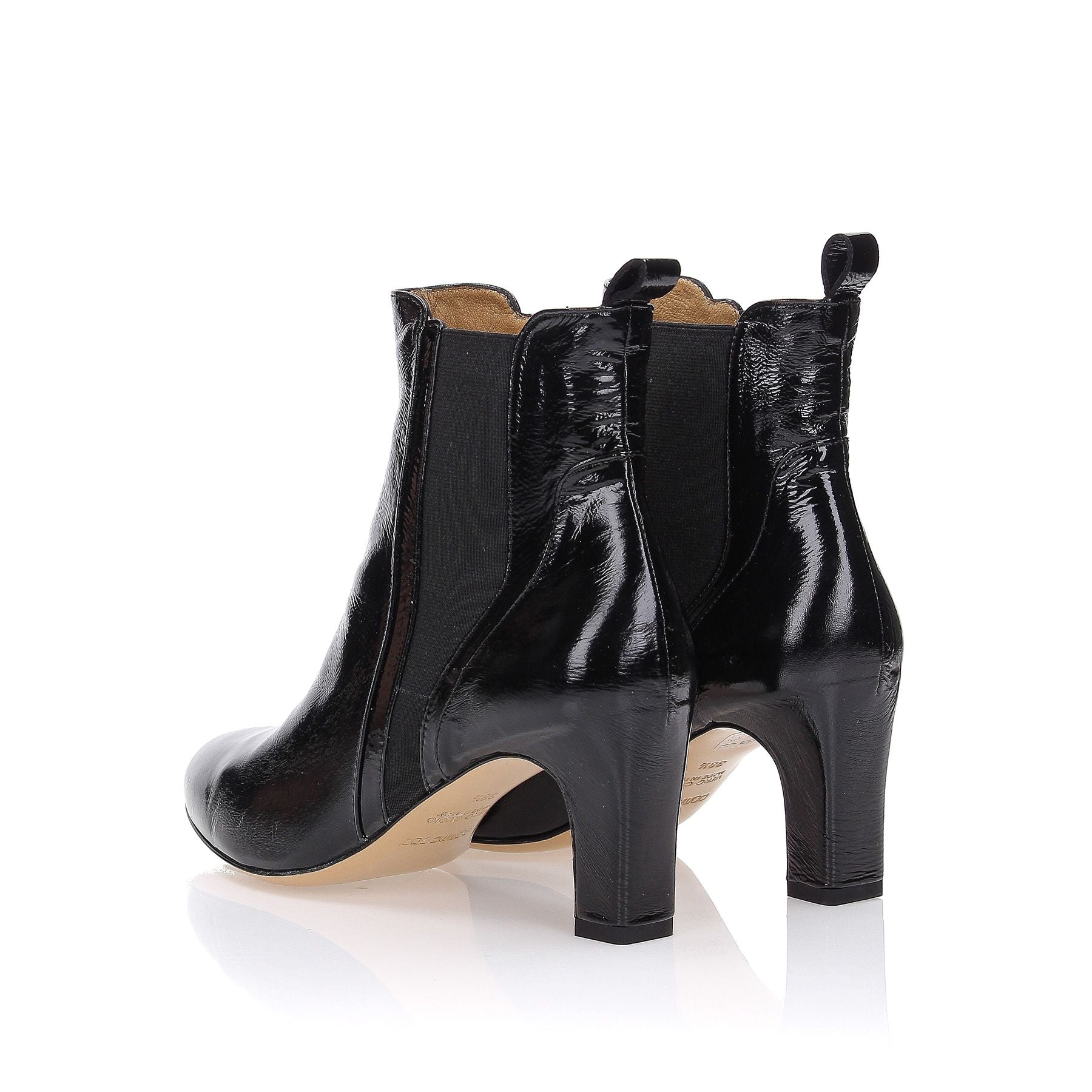 Beatles in schwarzem Naplack mit Taschenverarbeitung, 70-cm-Absatz, Leder- und Gummisohle.