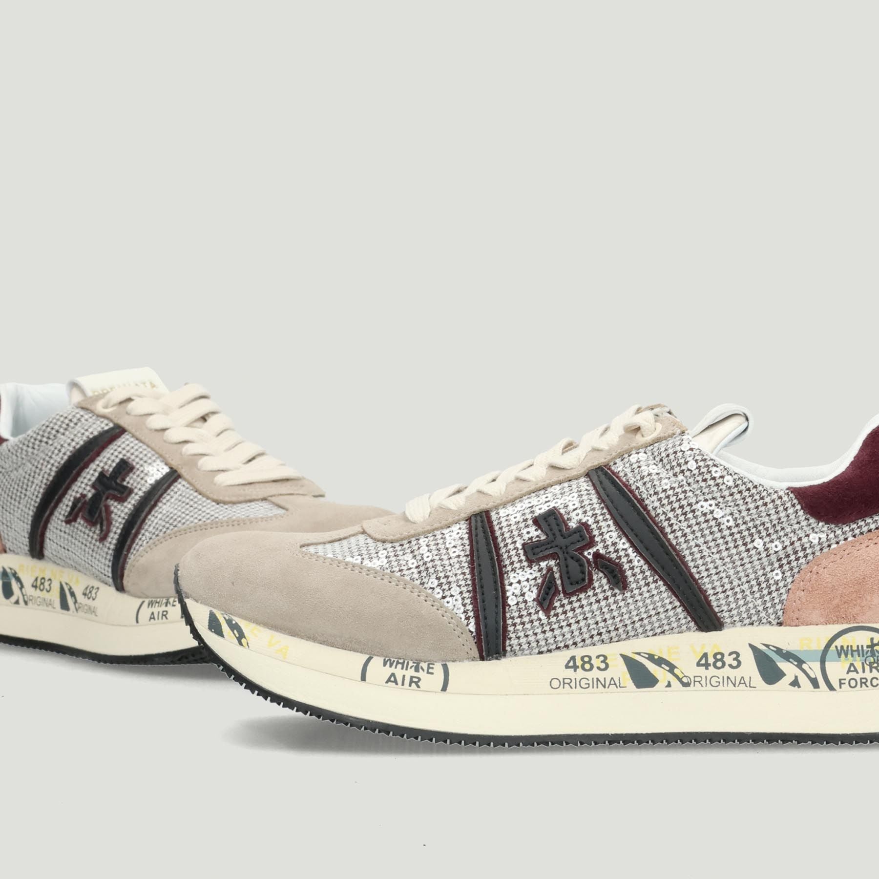 Premiata Conny Sneaker mit Obermaterial aus taubengrauem und bordeauxrotem Wildleder und paillettenbesetztem Hahnentrittmuster. Ecrufarbener Schnürverschluss. Logo auf der Zunge und an der Ferse. Lederfutter mit herausnehmbarer Innensohle. 4 cm hohe Gummisohle. Premiata Damenkollektion.