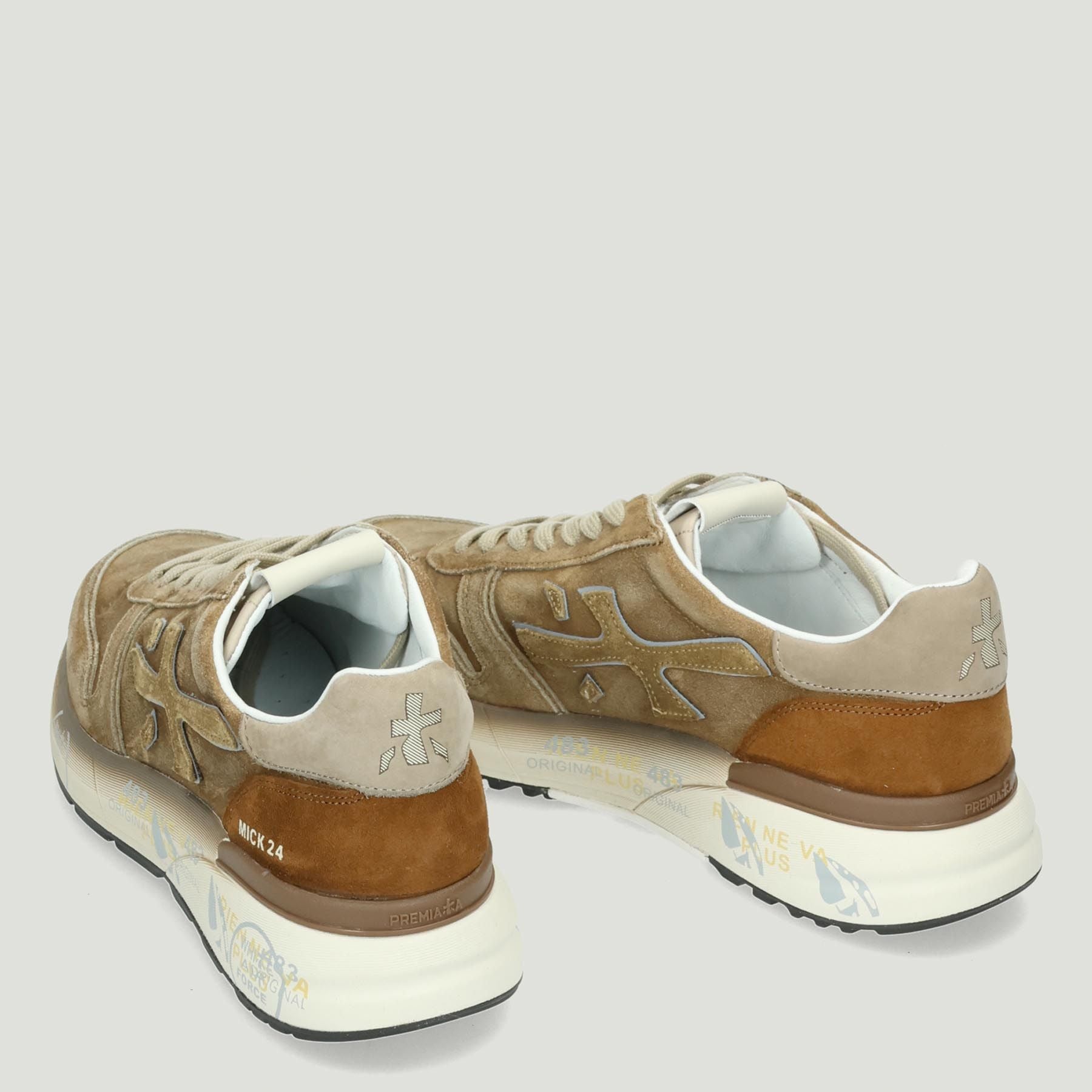 Premiata Mick Sneaker aus gealtertem Walnuss-Wildleder und Leder. Beige Schnürverschluss. Logo auf der Zunge. Logo auf der Fersenlasche. Herausnehmbare Lederinnensohle. 4 cm hohe Gummisohle. Premiata Herrenkollektion.