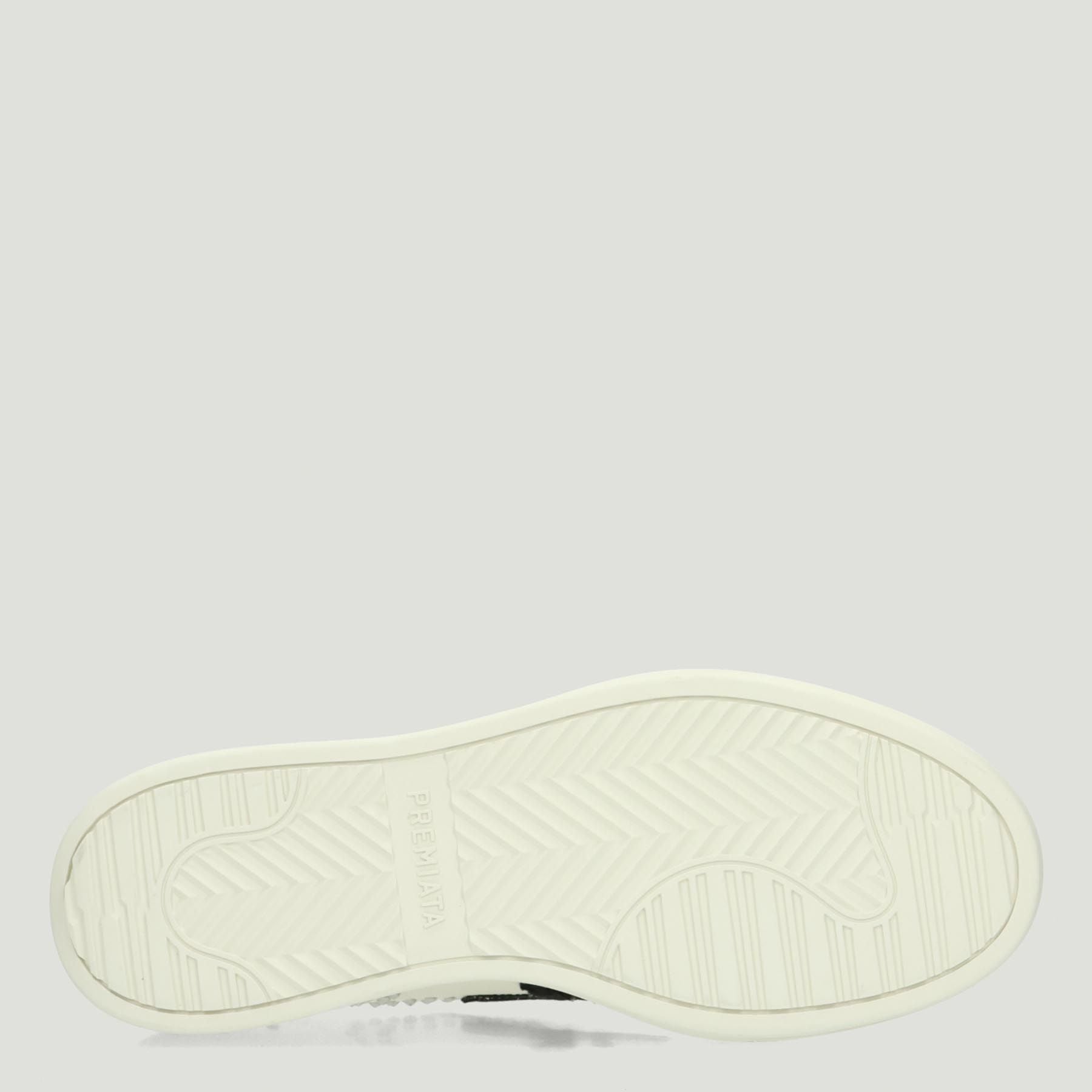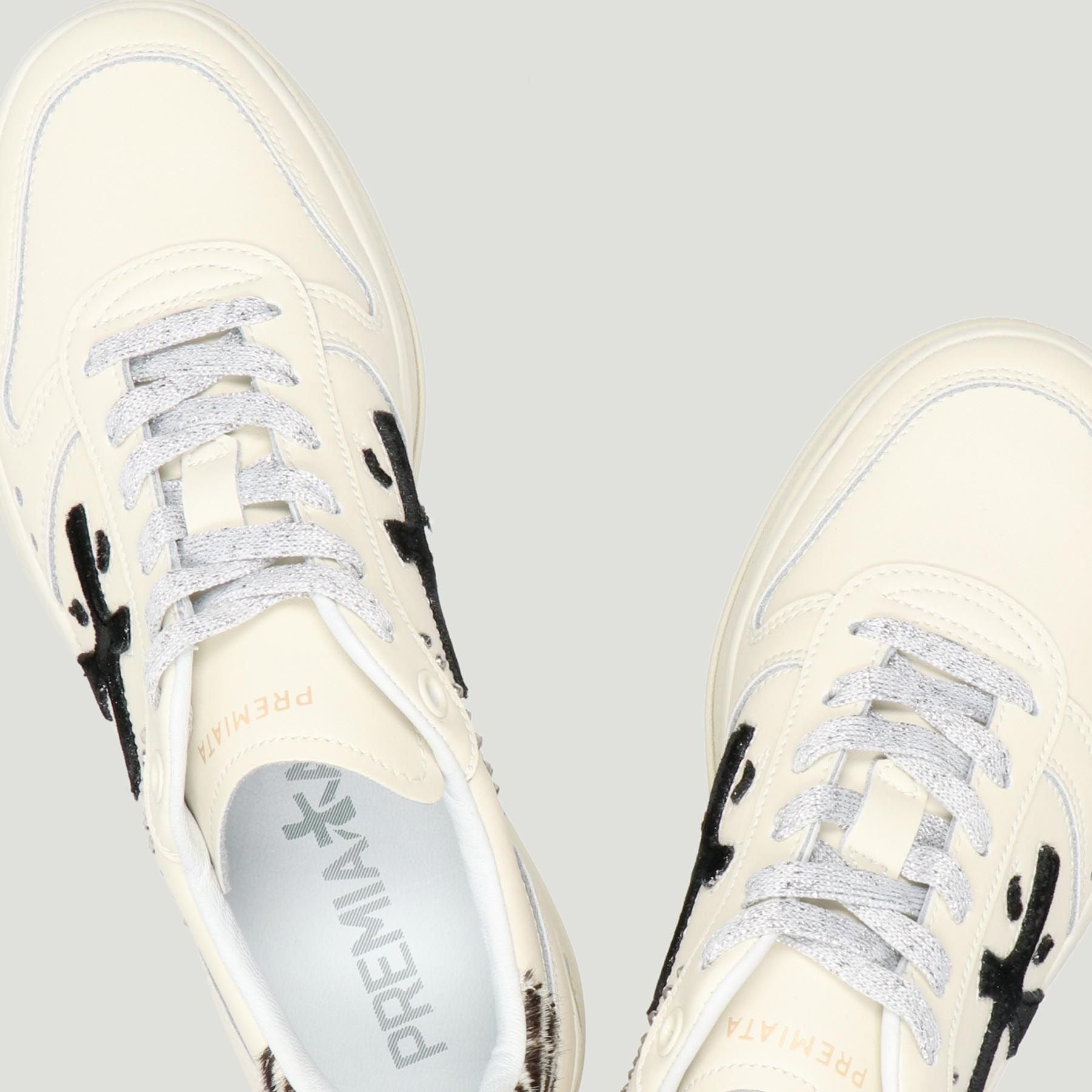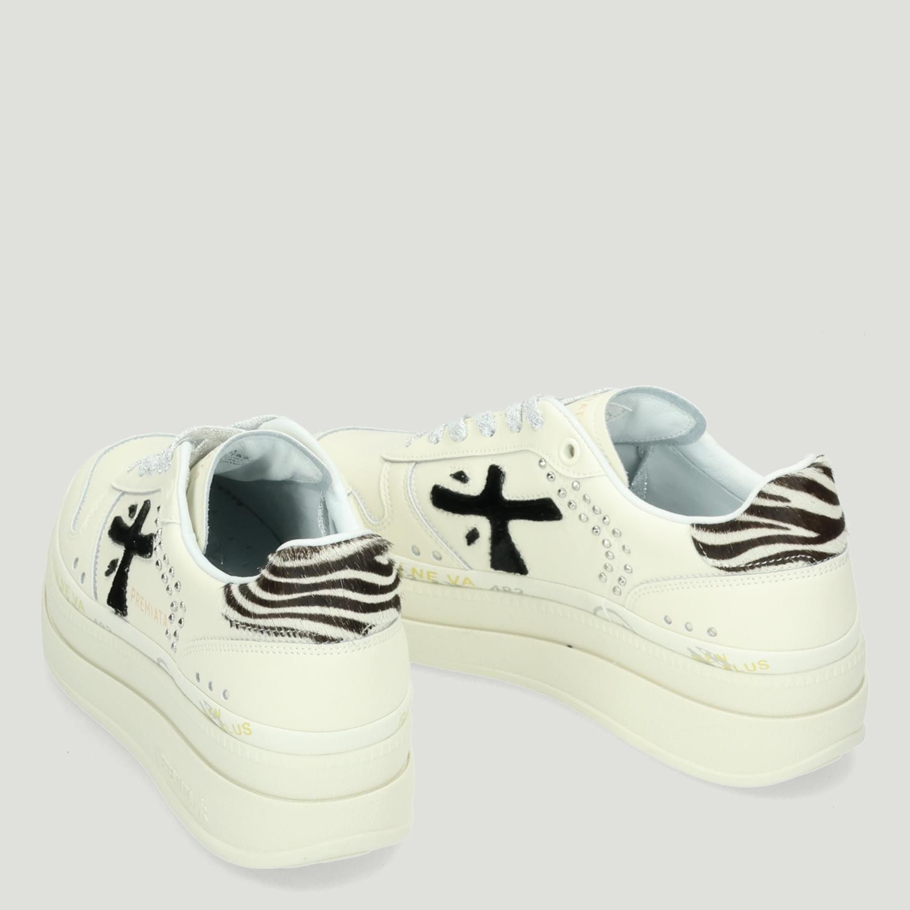 Premiata Micol Sneaker mit elfenbeinfarbenem Leder-Obermaterial. Silberne Glitzerschnürsenkel. Blaues Samt-Logo an der Seite und silberne Nieten. Fersenlasche aus Ponyfell mit Zebramuster. Lederfutter mit herausnehmbarer Innensohle. Gummisohle mit 4 cm Plateau. Premiata Damenkollektion.
