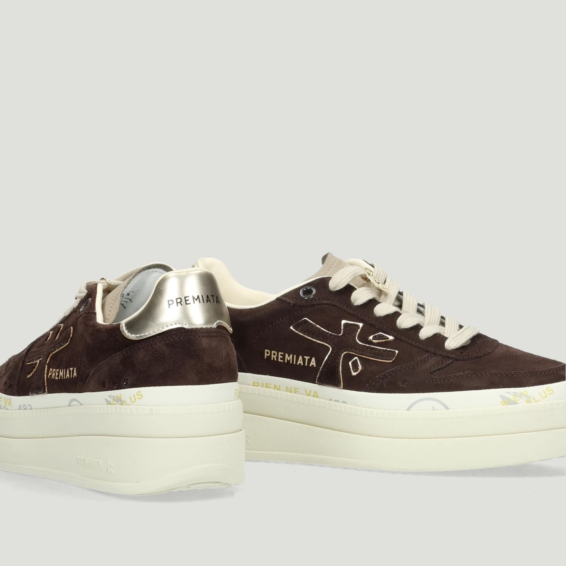 Premiata Micol Sneaker mit Obermaterial aus schokoladenbraunem Wildleder. Ecrufarbener Schnürverschluss. Goldene Leder-Fersenlasche. Lederfutter mit herausnehmbarer Innensohle. Gummisohle mit 4 cm Plateau. Premiata Damenkollektion.