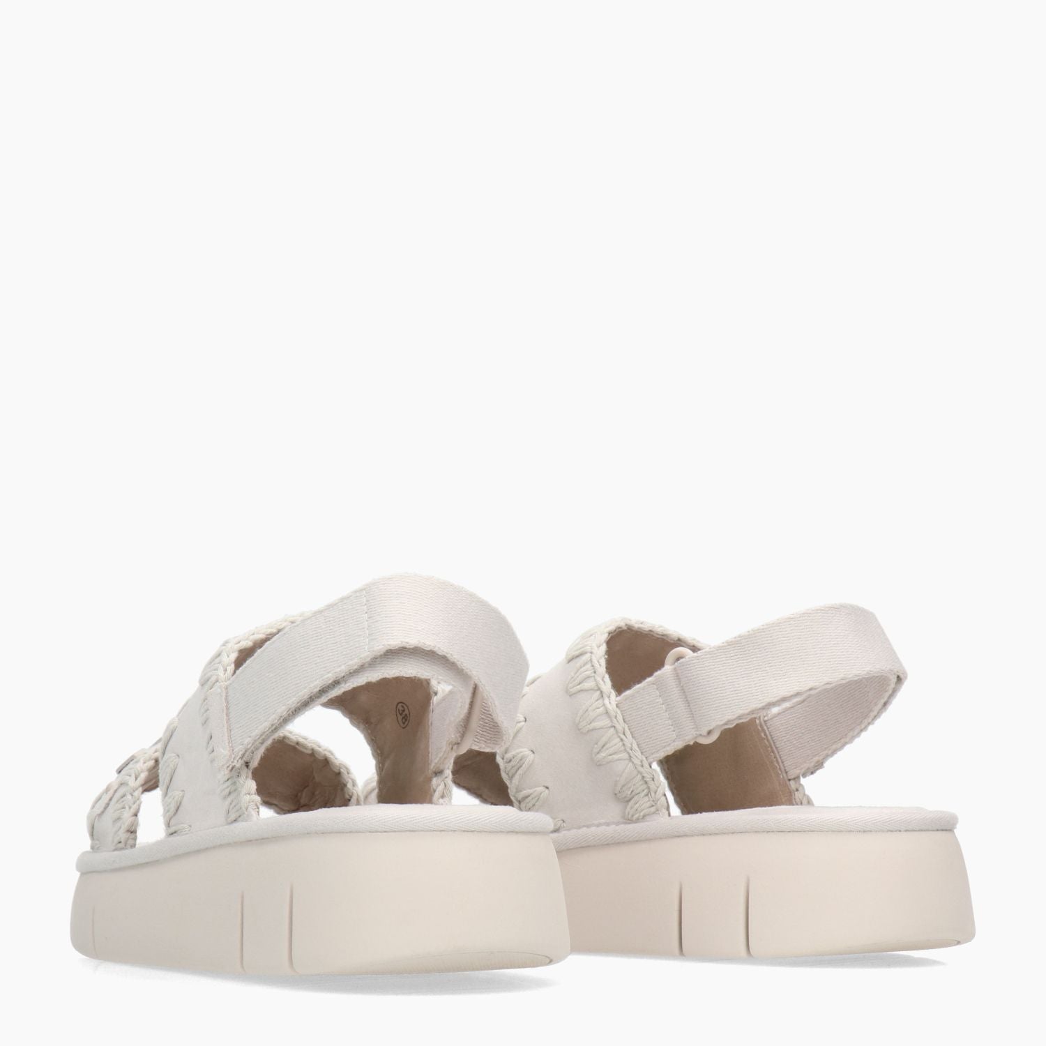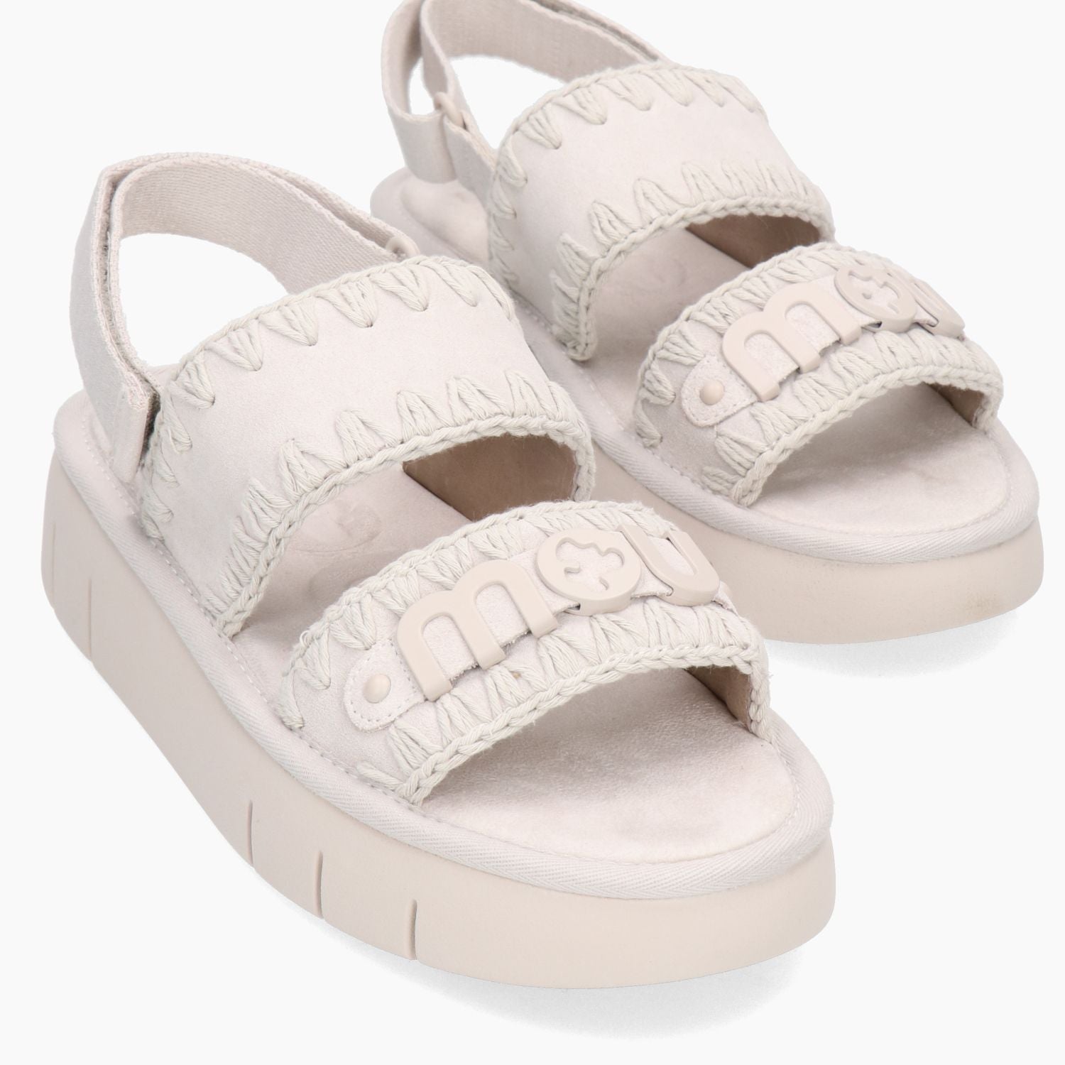 Bounce-Sandale mit eisfarbenem Wildleder-Obermaterial. Klassische Ziernähte. Metalllogo am Riemen. Lederfutter mit Mikrofaser-Innensohle. Klettverschluss hinten. 4 cm hohe Gummisohle. Mou Damen-Frühjahr/Sommer-Kollektion.