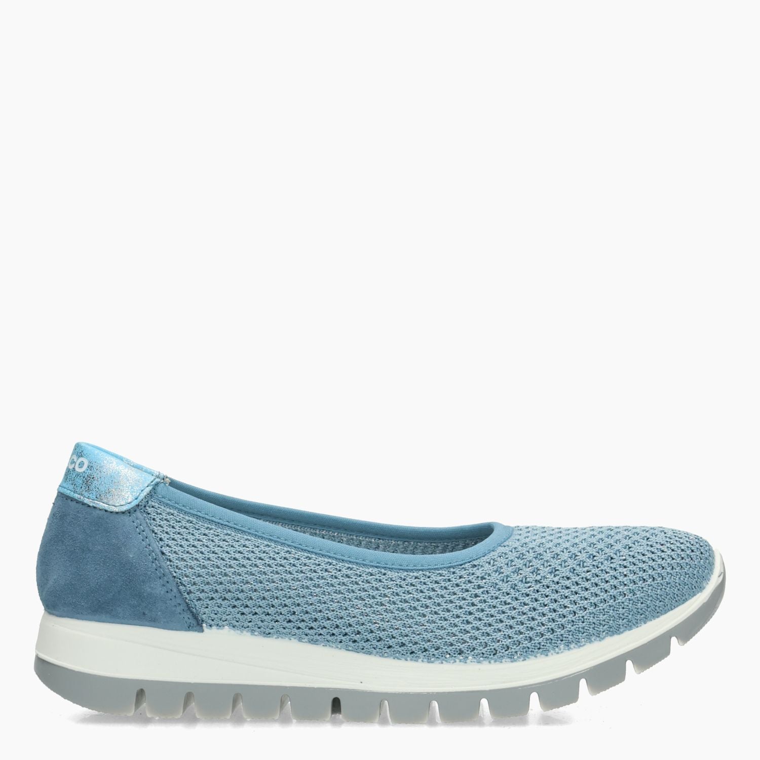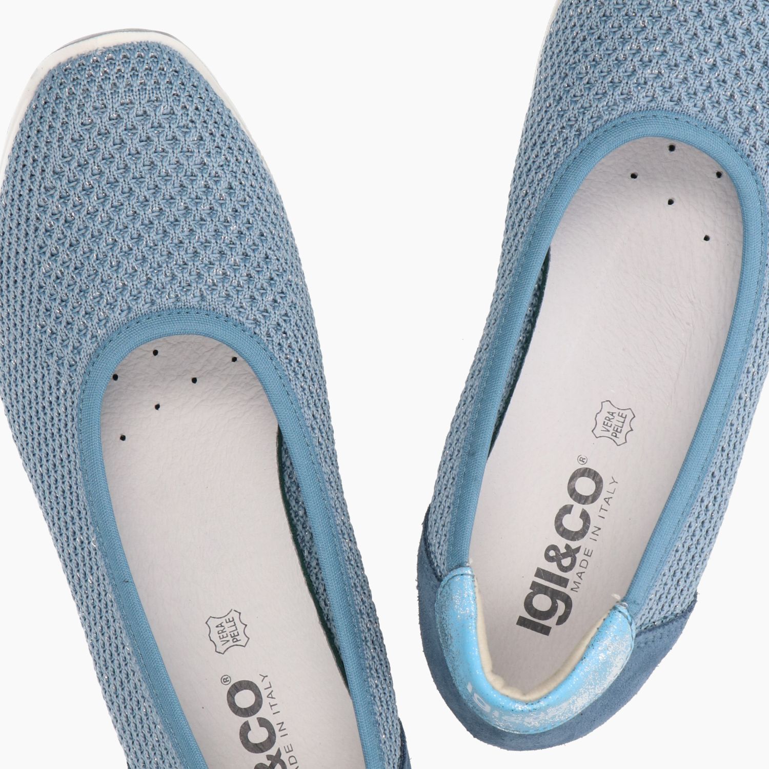Hellblaue Slip-on-Sneaker mit leicht laminiertem Textilobermaterial. Hellblauer, laminierter Lederabsatz. Futter aus Leder und Textil. Herausnehmbare Innensohle. Gummisohle. Igi&Co Damen-Frühjahr/Sommer-Kollektion.