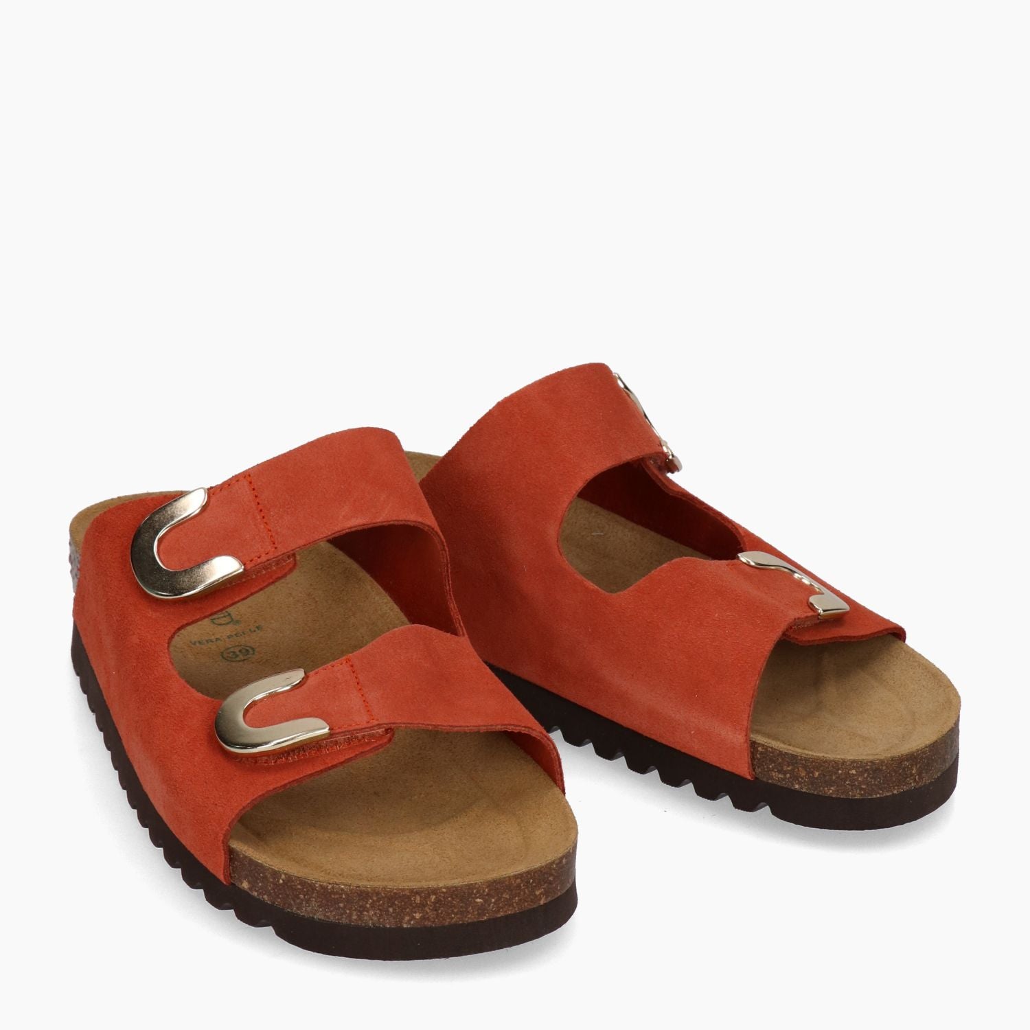 Grunland Hausschuh mit Obermaterial aus ziegelrotem Wildleder. Doppelter Klettverschluss. Lederfutter mit gepolsterter Innensohle. Gummisohle mit 4 cm hohem Keilabsatz. Grunland Damen Frühjahr/Sommer Kollektion.