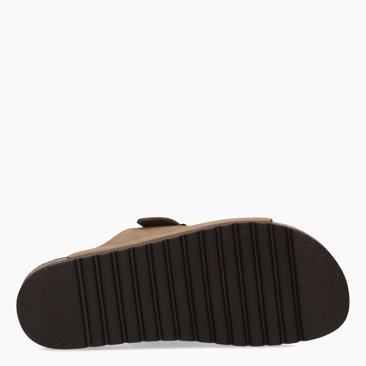 Taupefarbene Lederpantoffeln mit verstellbarem Doppelverschluss. Gepolsterte Re-Soft-Lederinnensohle. 4 cm hohe Sohle. Grunland Damen-Frühjahr/Sommer-Kollektion.