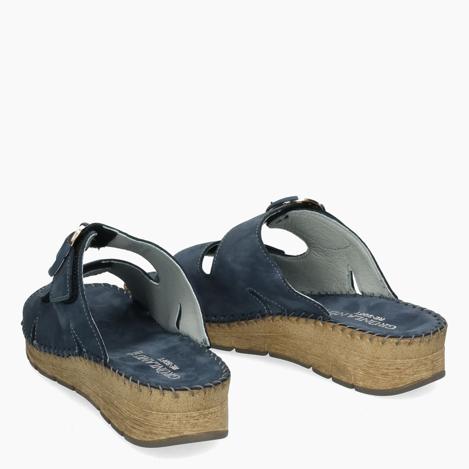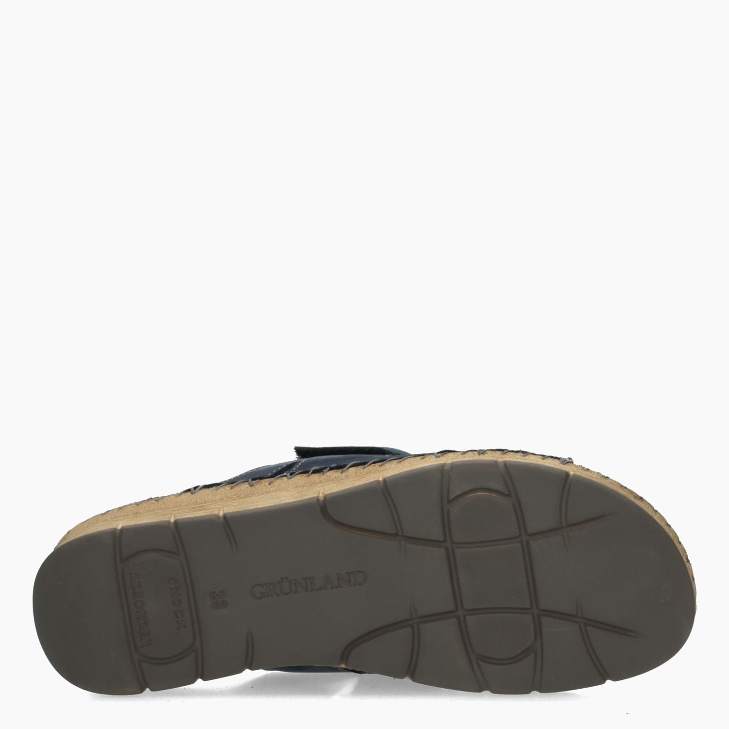 Blauer Lederpantoffel. Lederfutter mit gepolsterter Innensohle. Verstellbar mit doppeltem Klettverschluss. Gummisohle mit 4 cm hohem Keilabsatz. Grunland Damen-Frühjahr/Sommer-Kollektion.