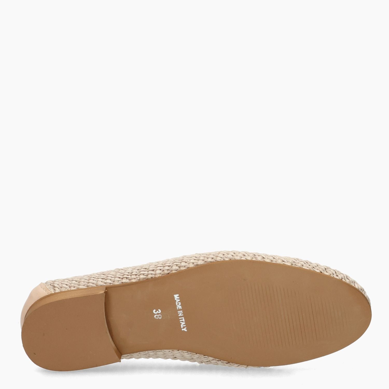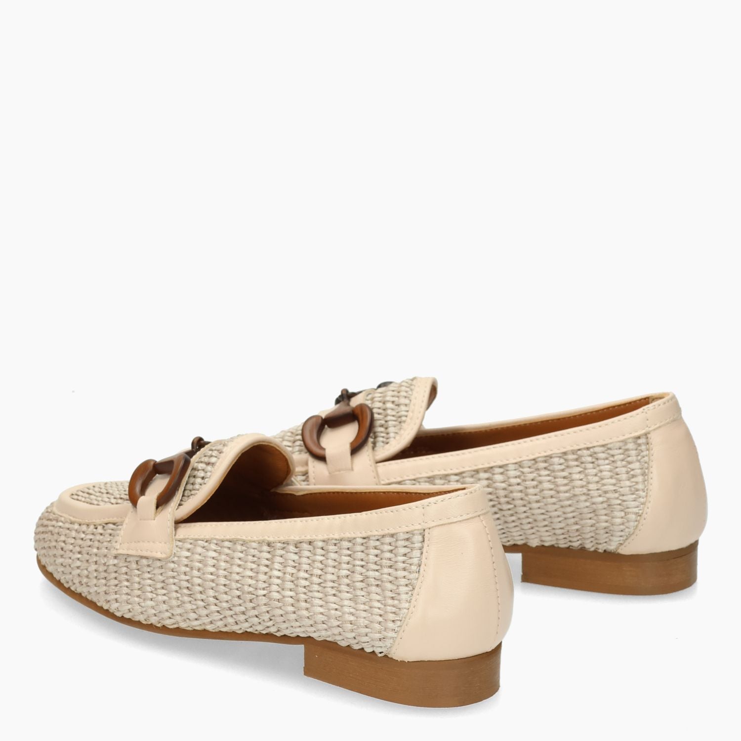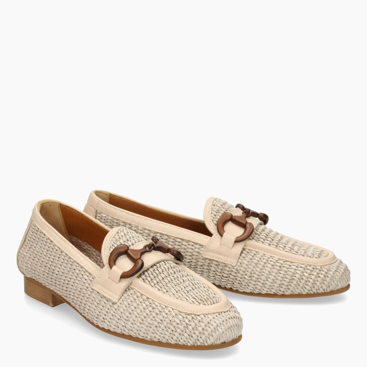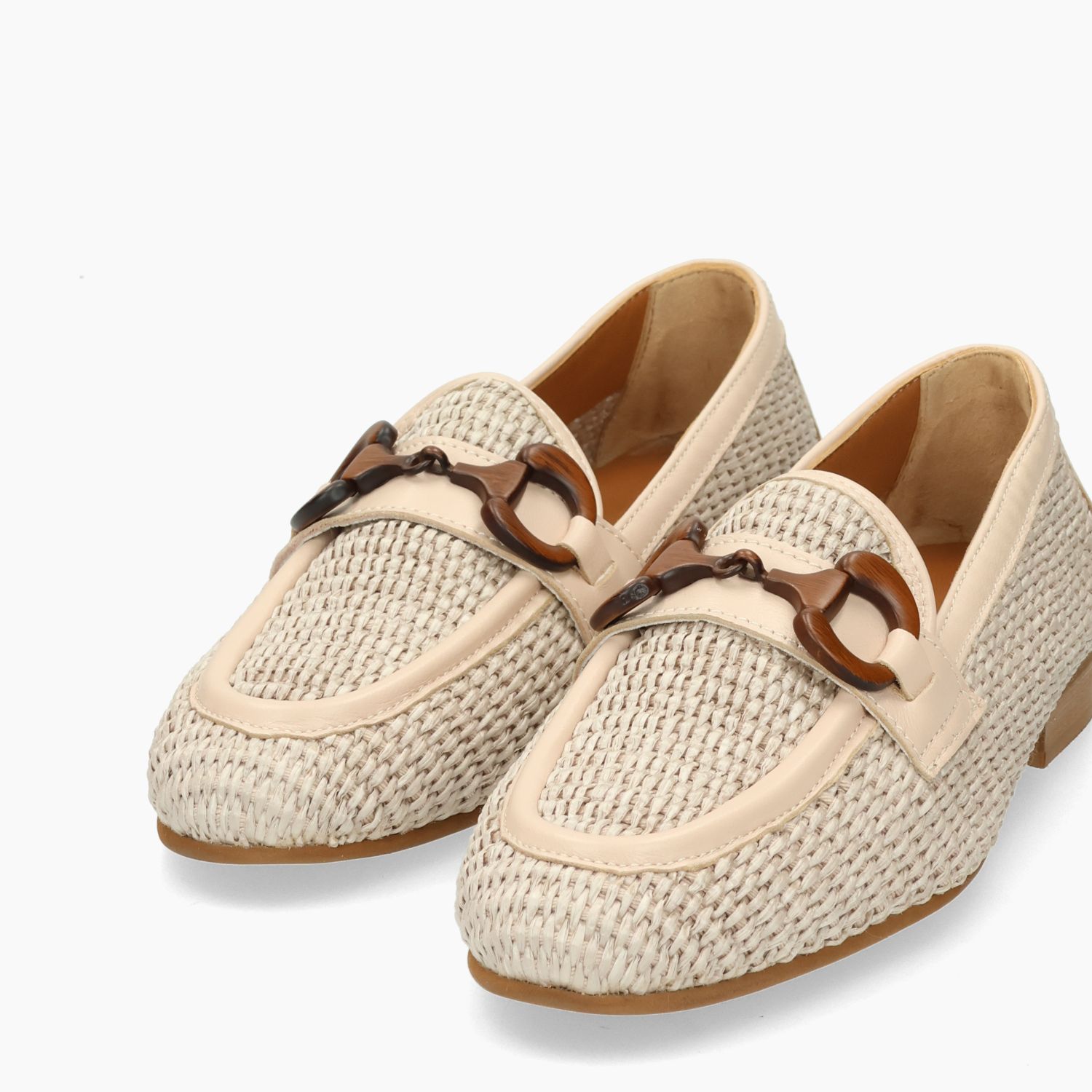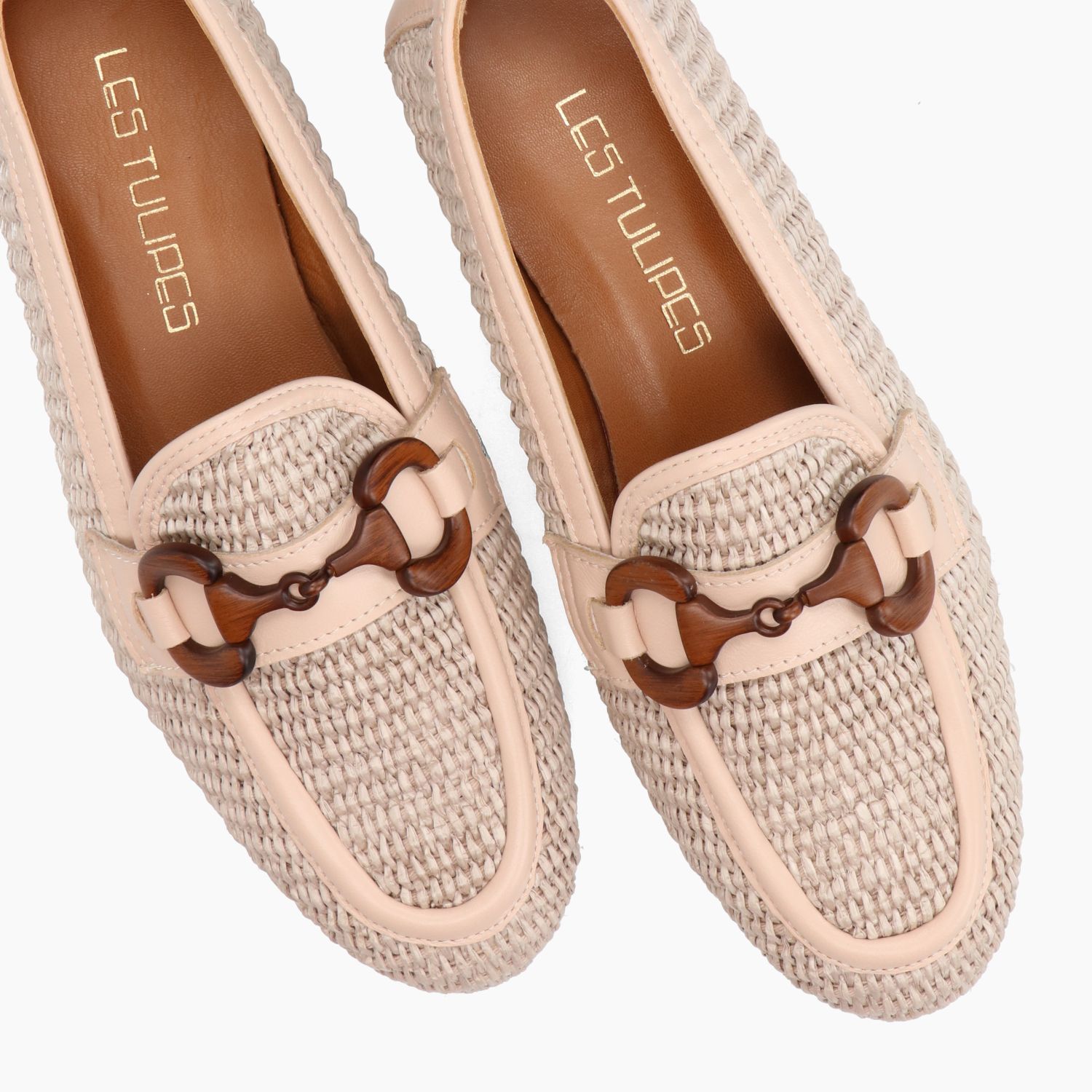 Nudefarbener Bast-Loafer mit passendem Lederbesatz. Braune Schnalle in Holzoptik. Lederfutter mit fester Innensohle. Gummisohle mit 1,5 cm Absatz. Les Tulipes Damen-Frühjahr/Sommer-Kollektion.