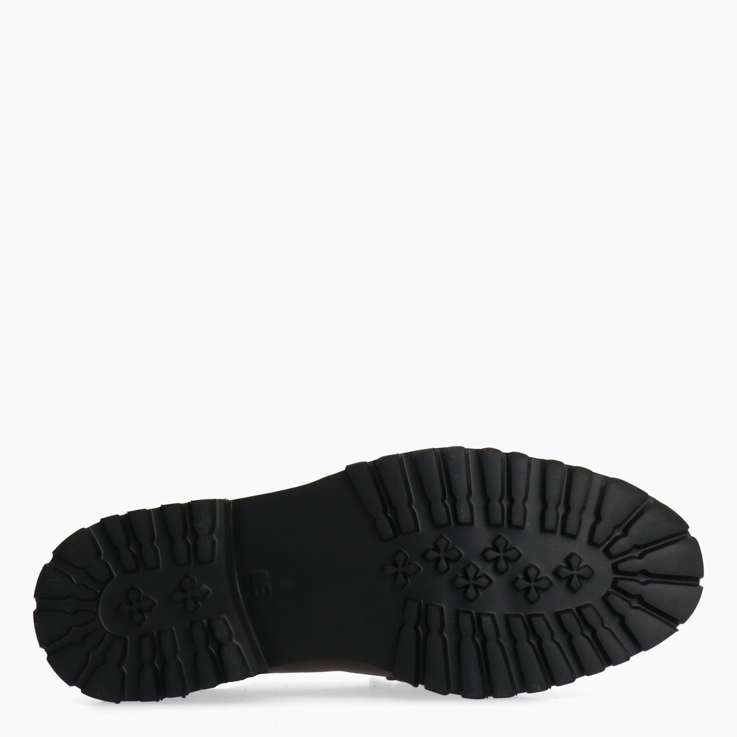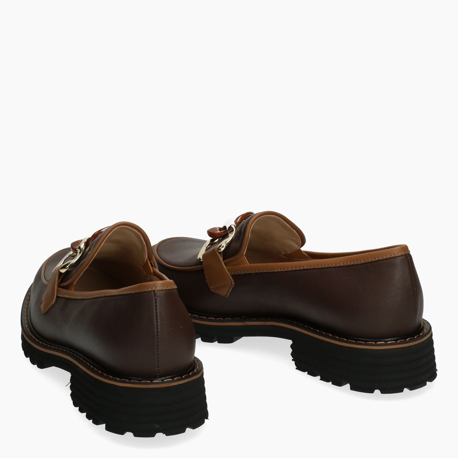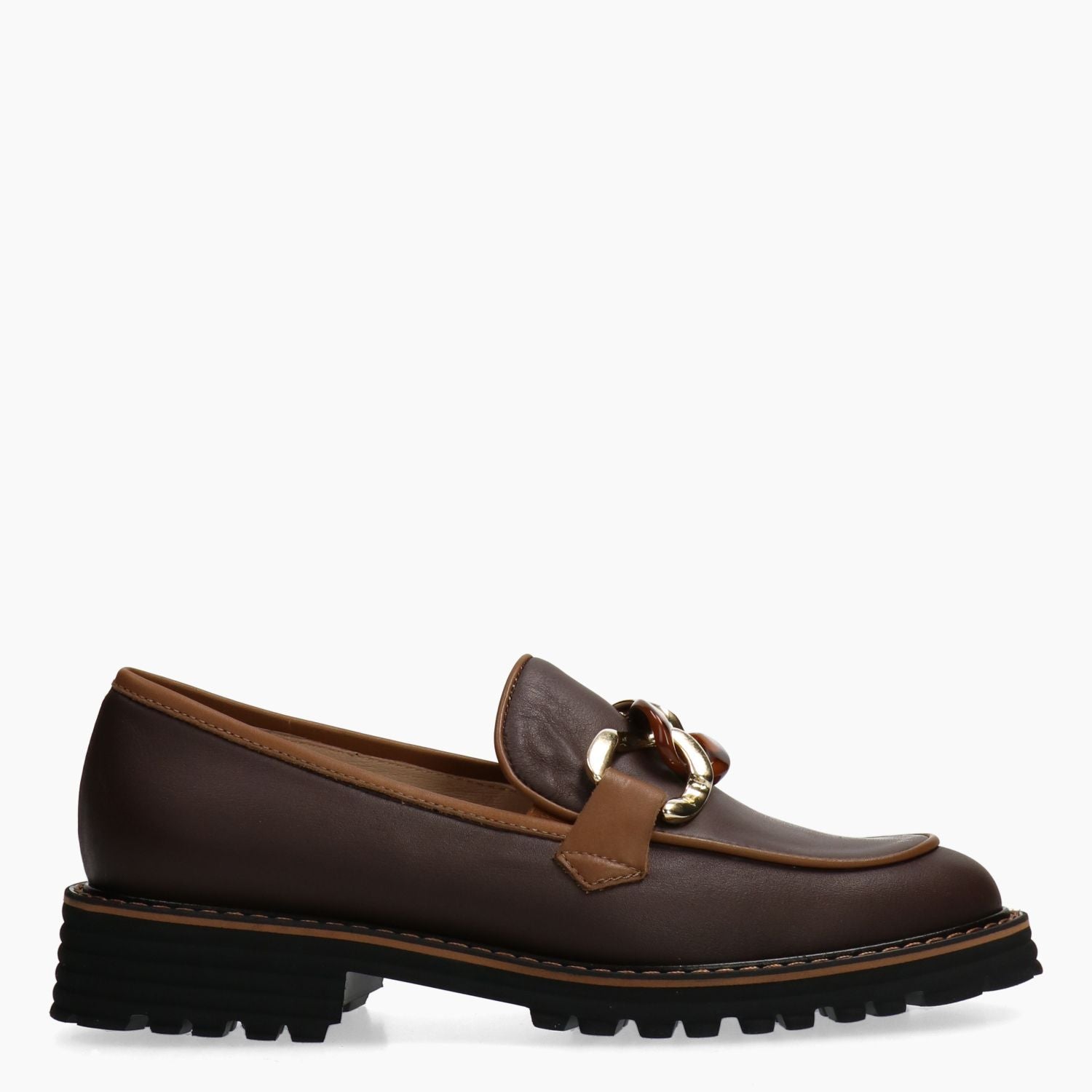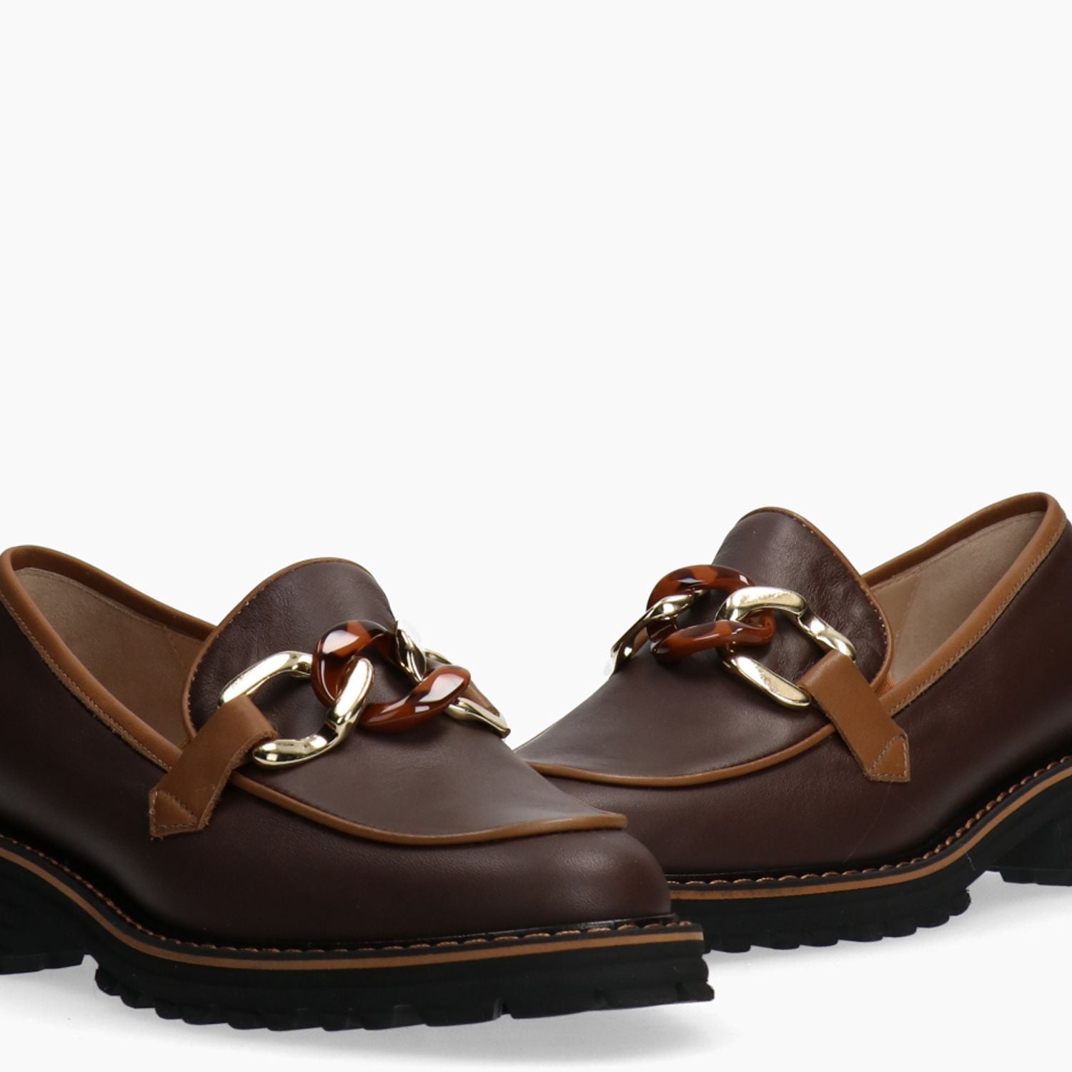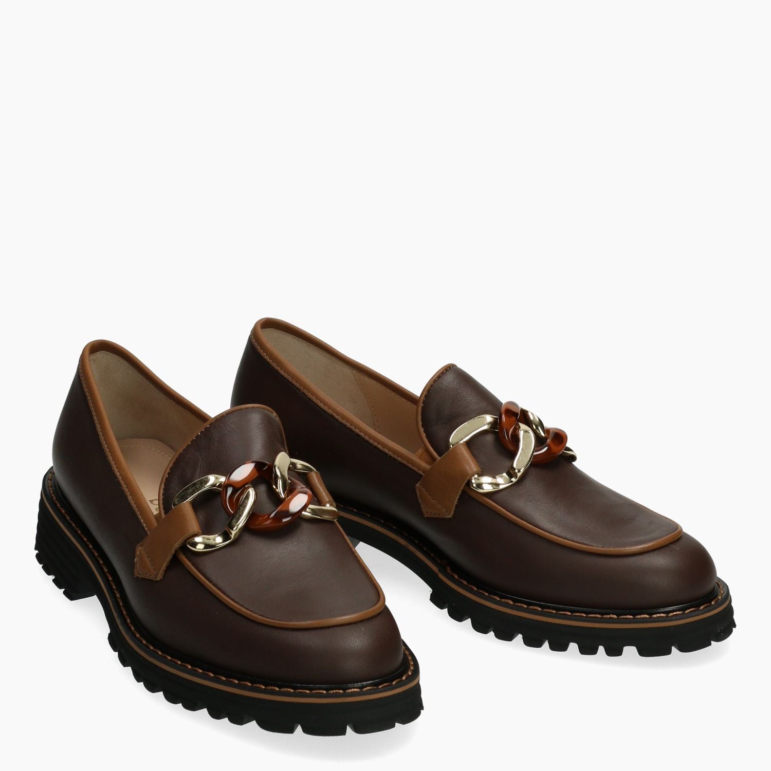 Kastanienbrauner Lederloafer mit Lederbesatz. Beiges Lederfutter. Goldene Kette und Riemen in Schildpattoptik. Mikroporöse Gummisohle mit 3 cm Absatz. Duca di Rialto Damen Herbst/Winter Kollektion.