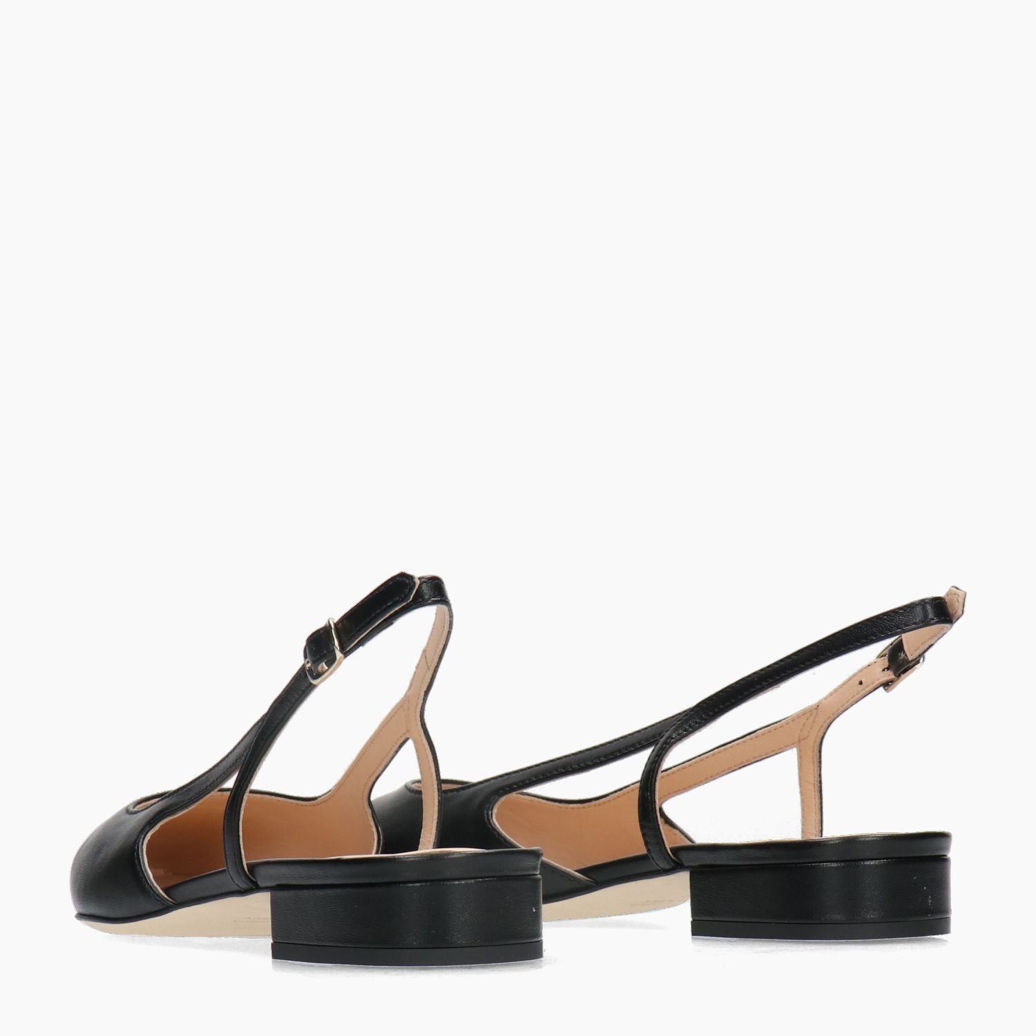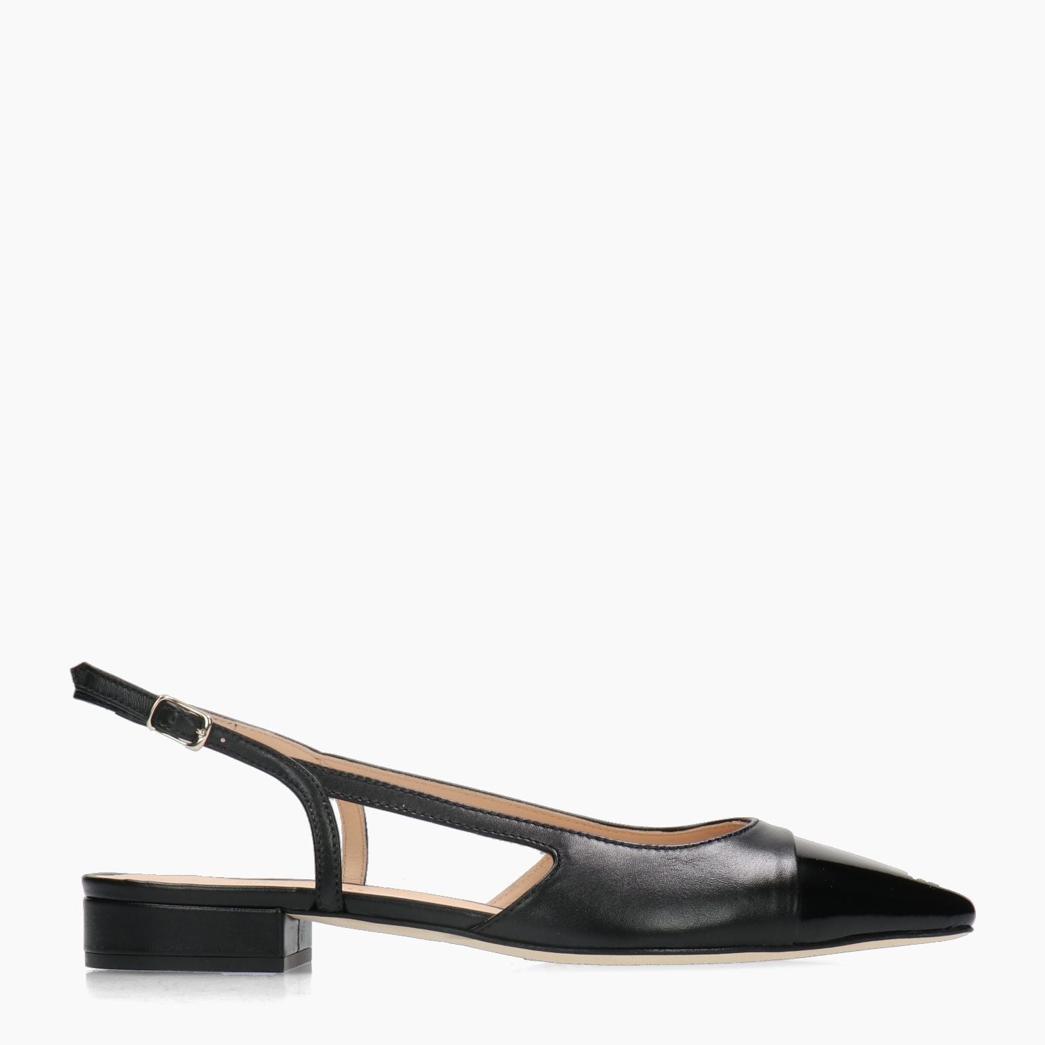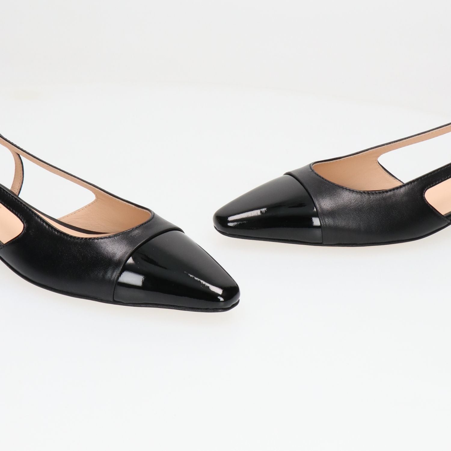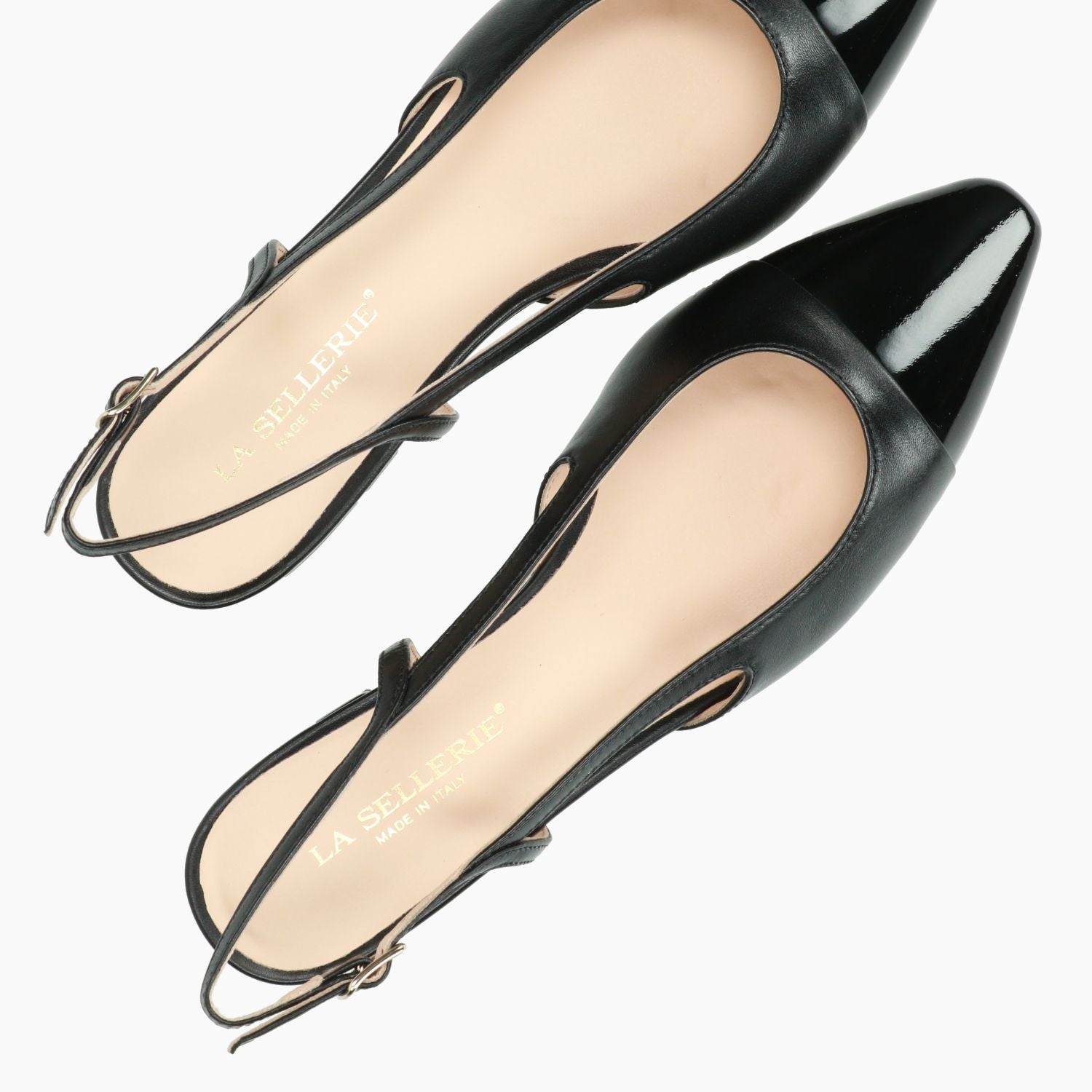 Schwarze Slingbacks von La Sellerie mit schwarzer Lackleder-Zehenkappe. Verstellbarer Fersenriemen. Lederfutter. 2,5 cm Absatz. Ledersohle. La Sellerie Damen-Frühjahr/Sommer-Kollektion.