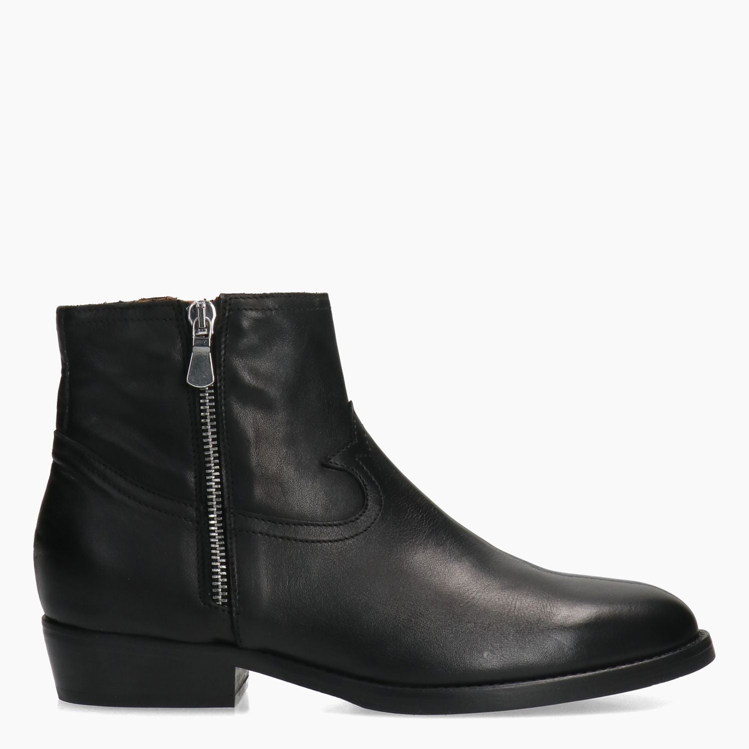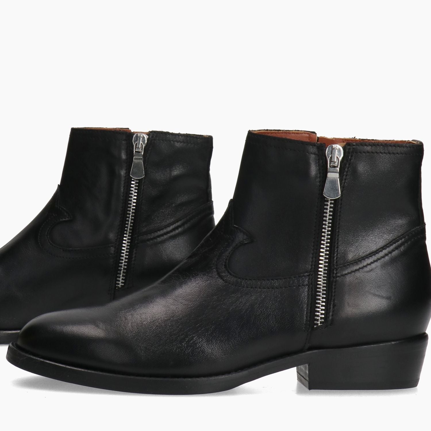 Schwarze Leder-Ankle-Boots mit doppeltem Seitenreißverschluss. Lederfutter. Feste Innensohle. Leder-Gummisohle mit 3 cm Absatz. Aus der Damenkollektion „Curiosite“.