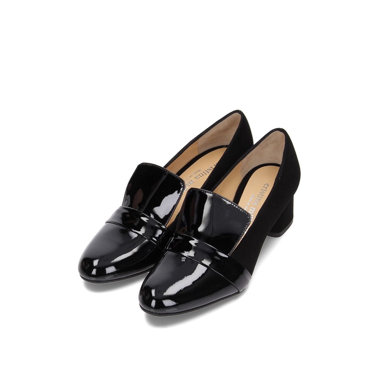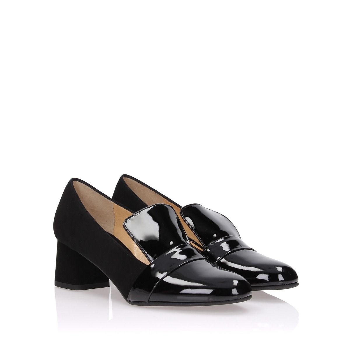 Schwarzer High-Top-Schuh aus Lackleder und Wildleder, 50 cm Absatz, Gummisohle.
