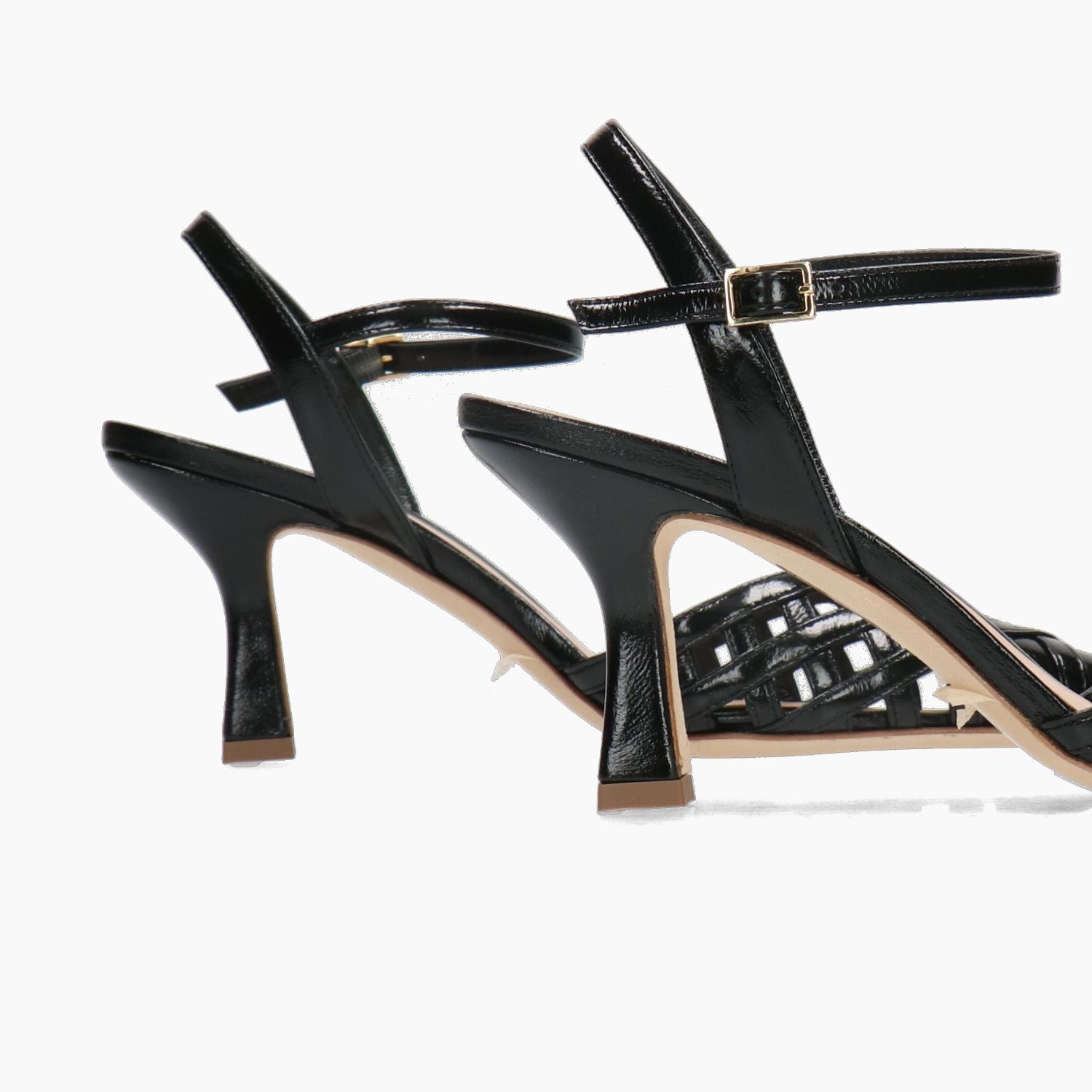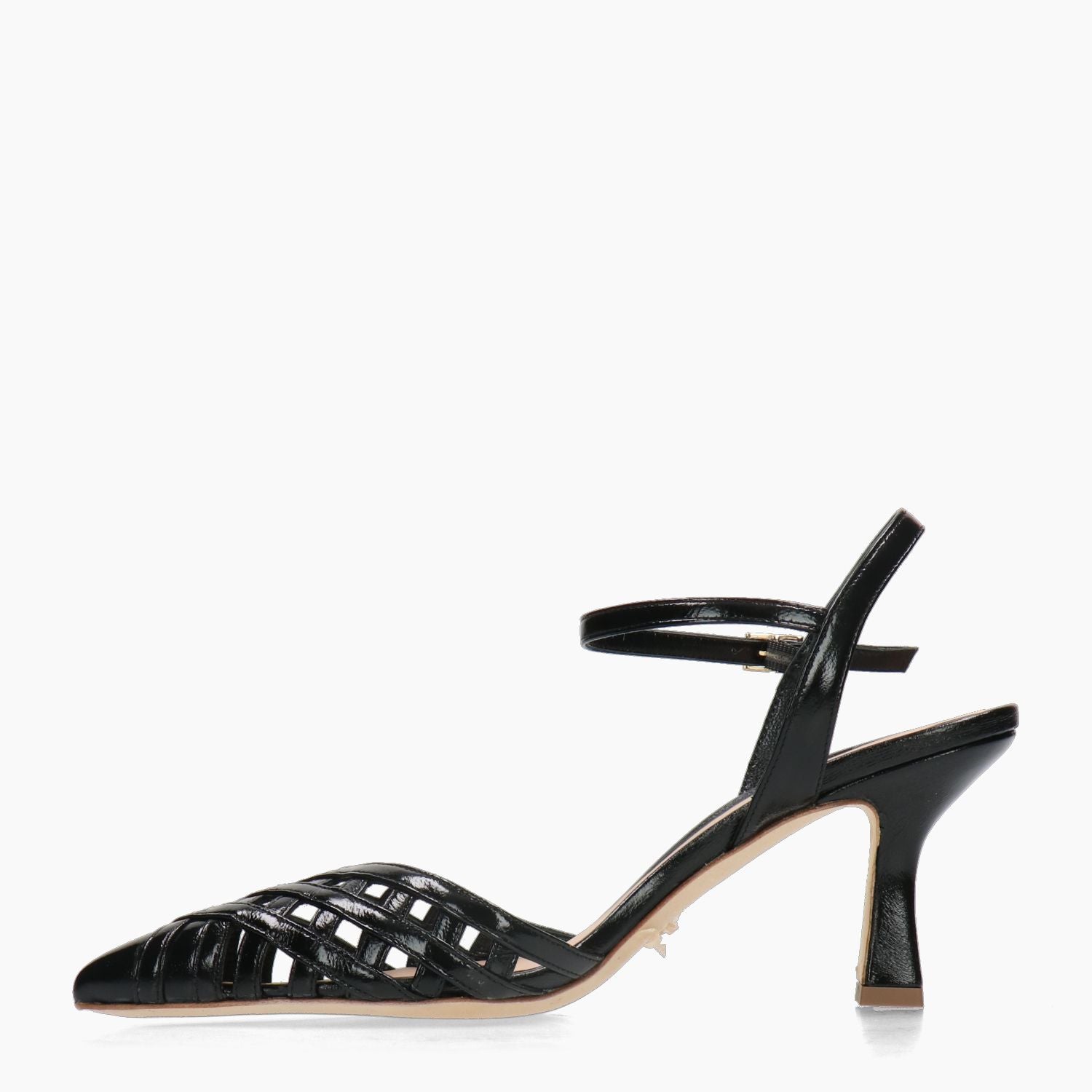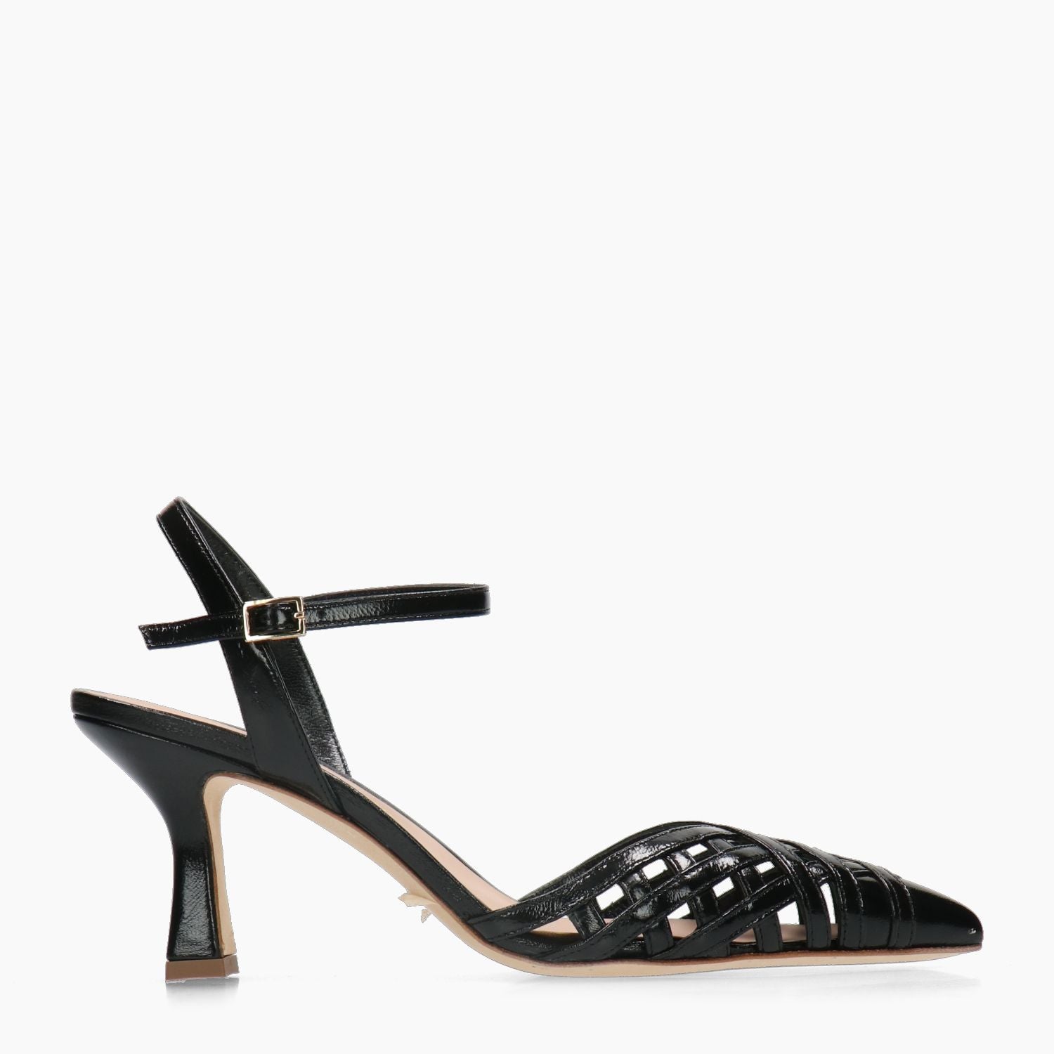 Schwarze Chanel-Pumps aus Lackleder mit verstellbarem Knöchelriemen. Lederfutter. Ledersohle mit 7 cm Absatz. Chiara Carrino Frühjahr/Sommer-Kollektion.