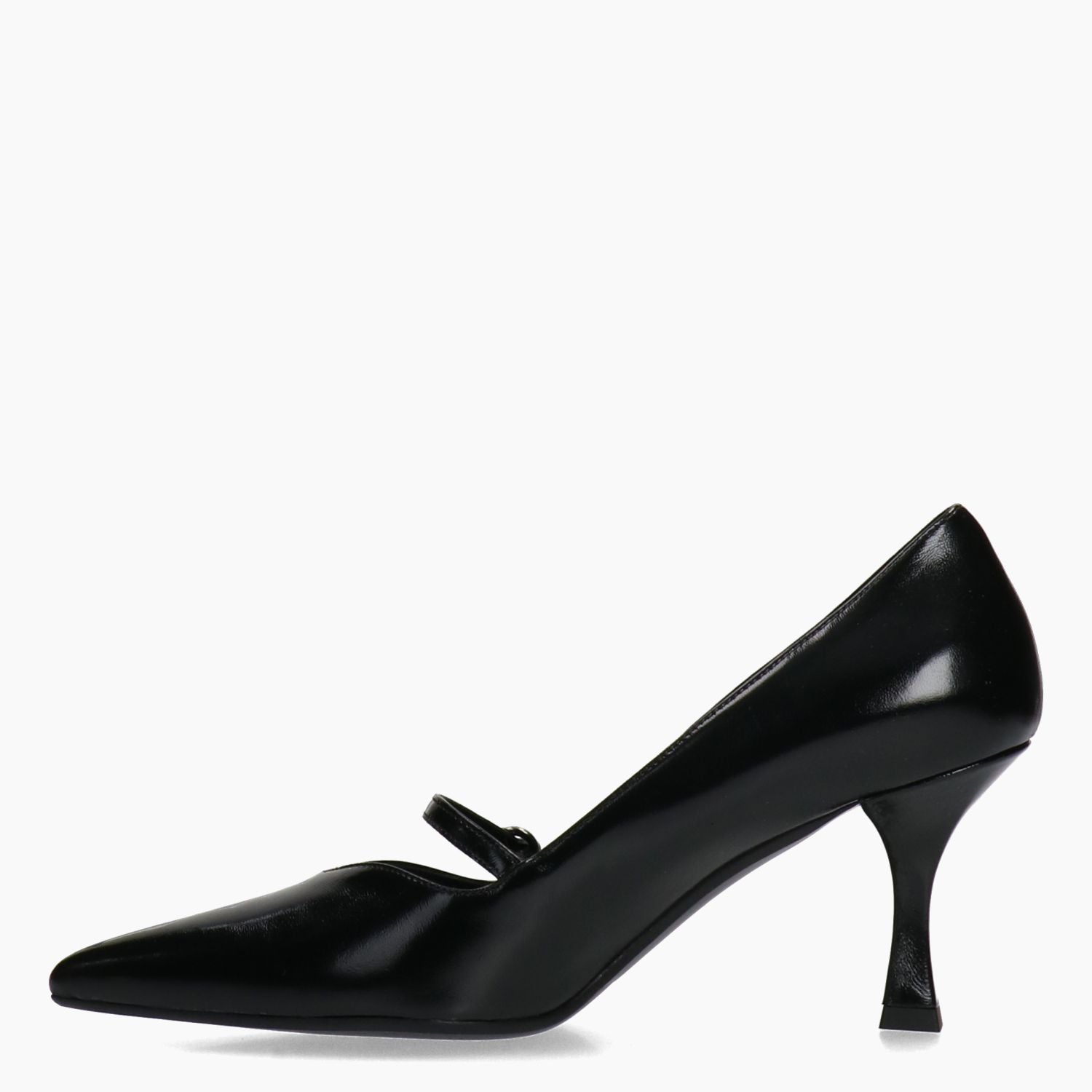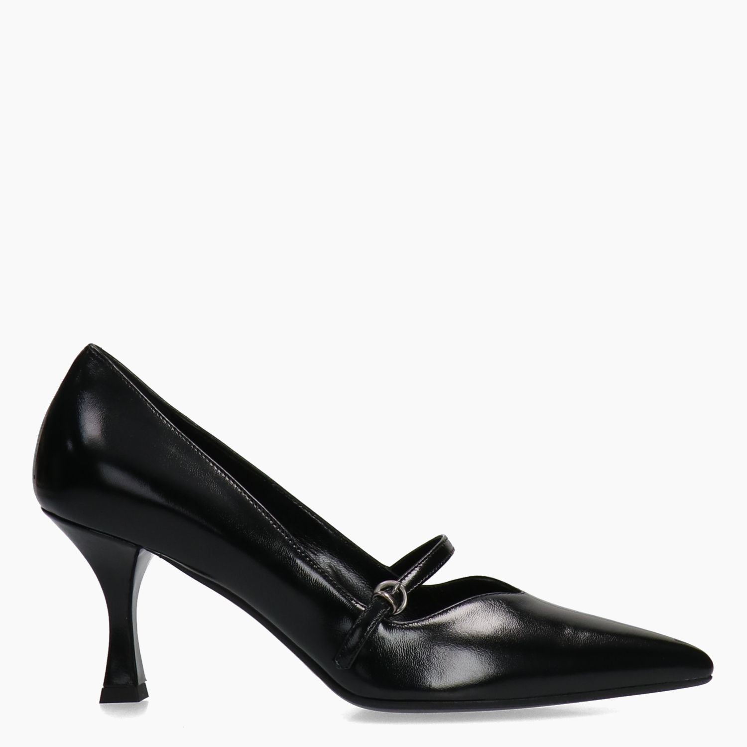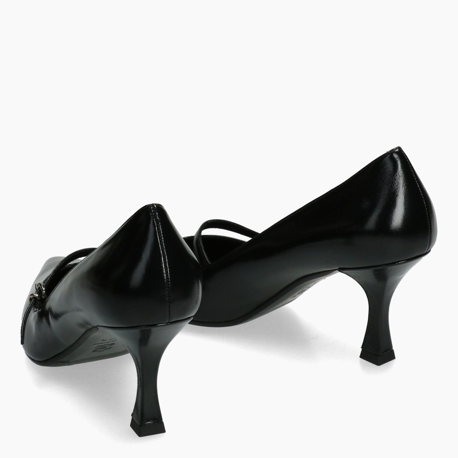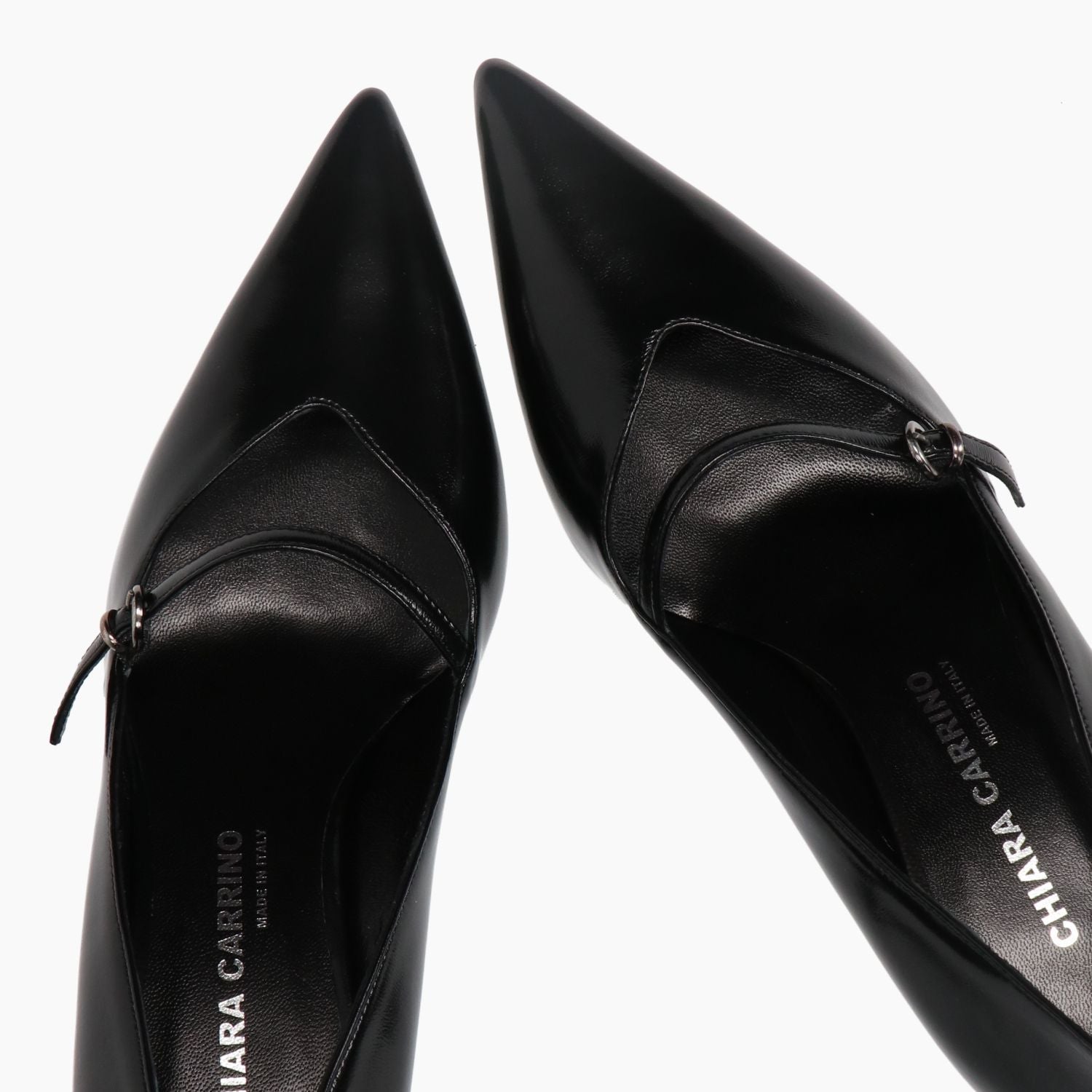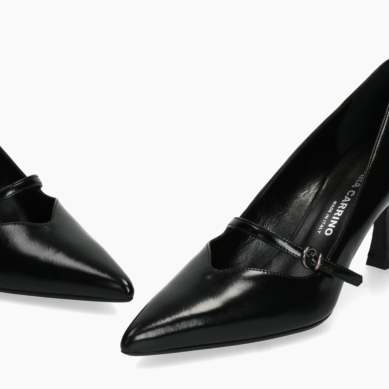 Schwarze Lacklederpumps. Verstellbarer Riemenverschluss. Lederfutter. Sohle aus Leder und Gummi mit 6,5 cm Absatz. Chiara Carrino Damen-Herbst-/Winterkollektion.