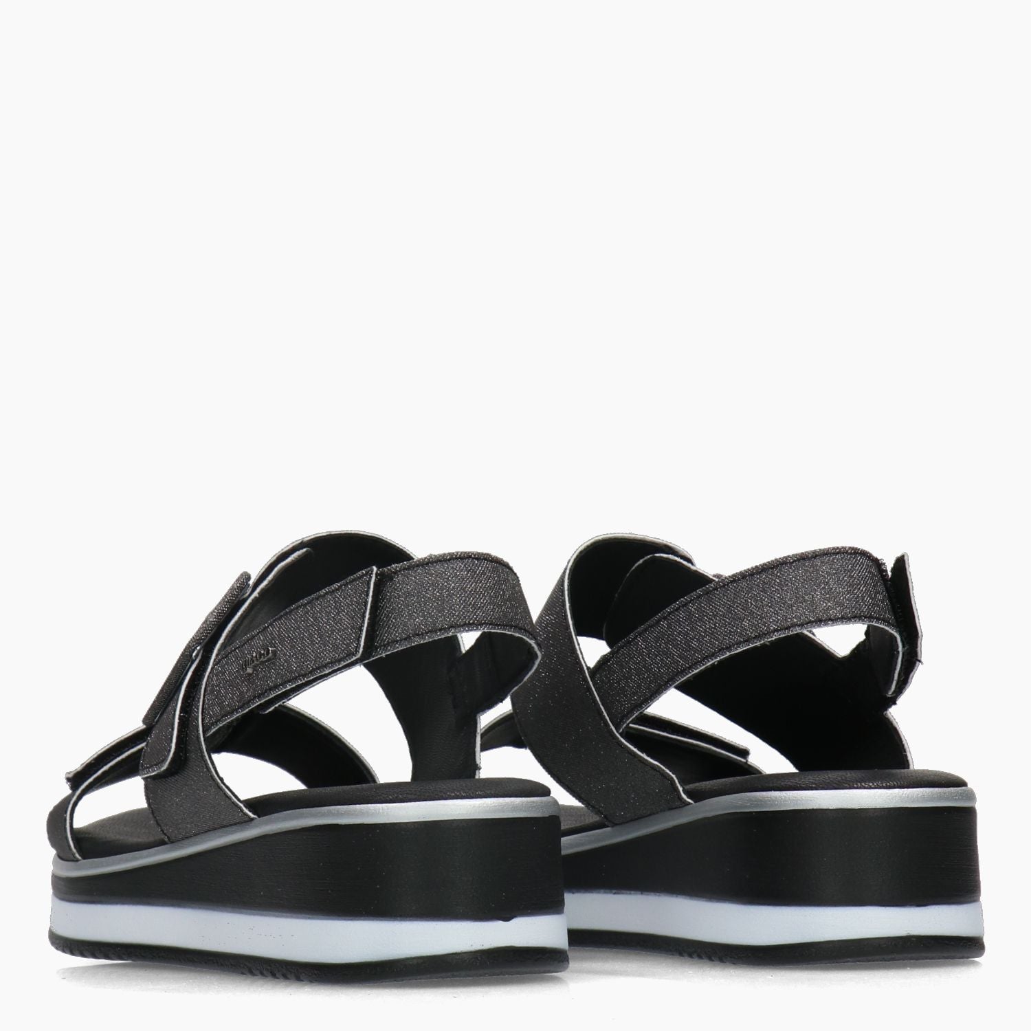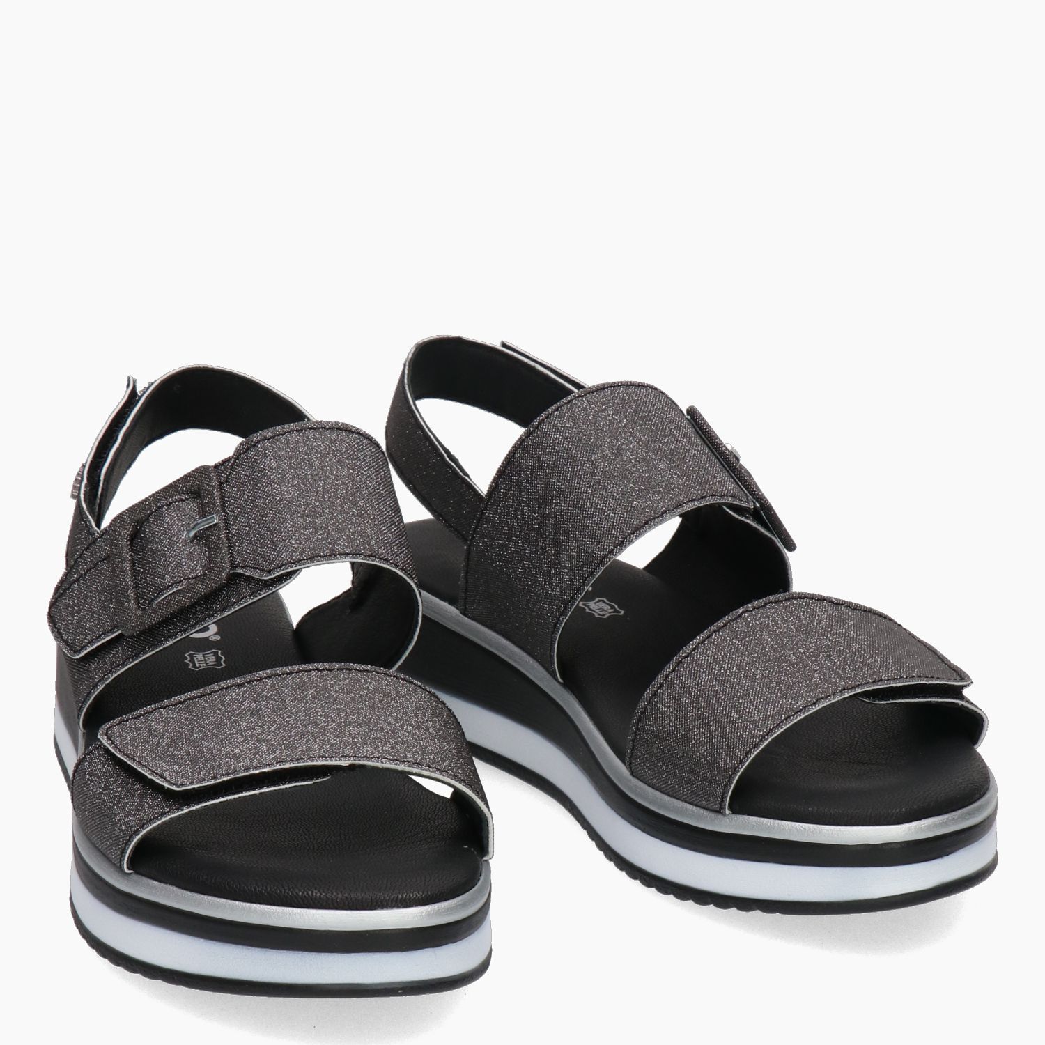 Igi&Co Sandale mit schwarzem Glitzerstoff-Obermaterial. Seitlicher Klettverschluss. Lederfutter mit gepolsterter Innensohle. Gummisohle mit 4 cm hohem Keilabsatz. Igi&Co Damen-Frühjahr/Sommer-Kollektion.