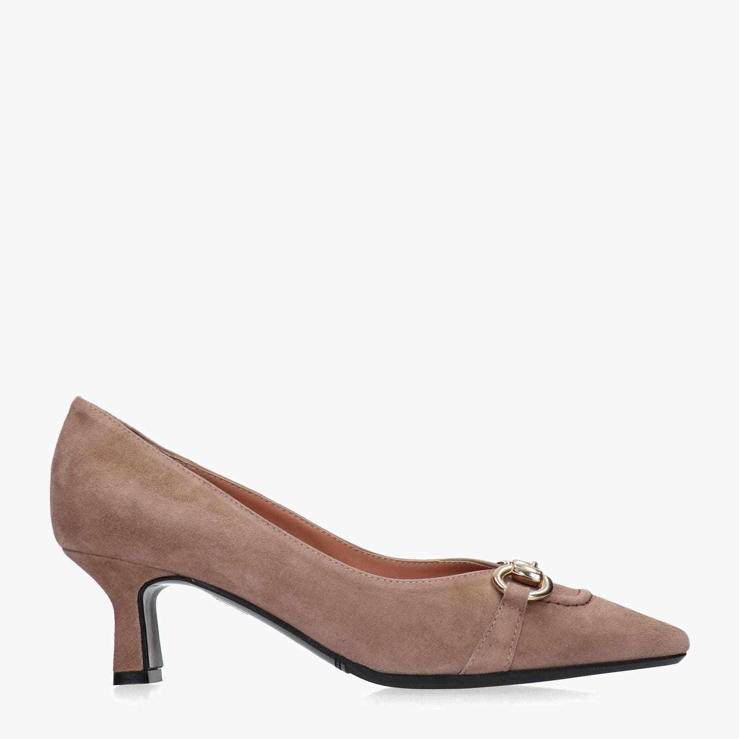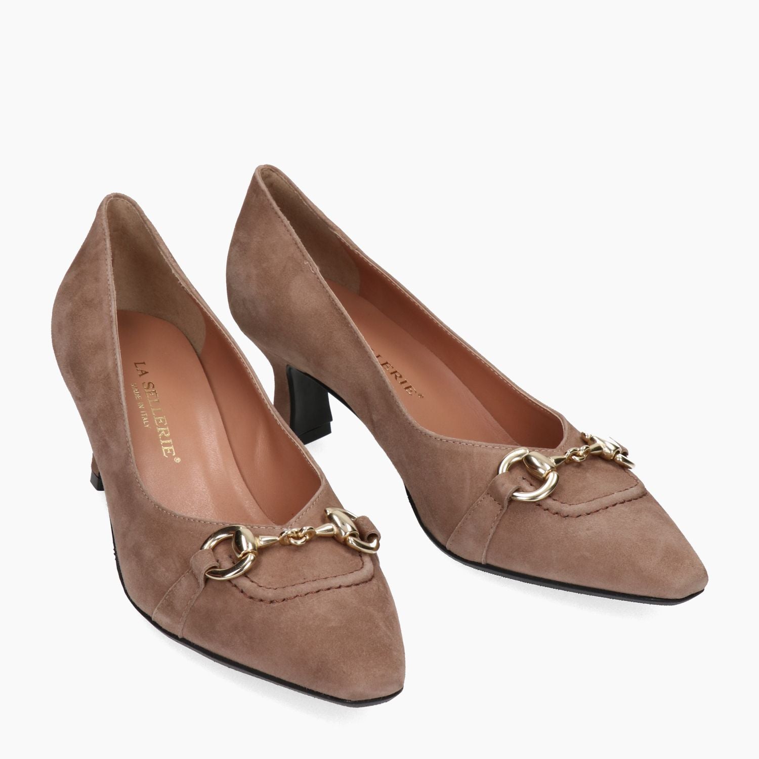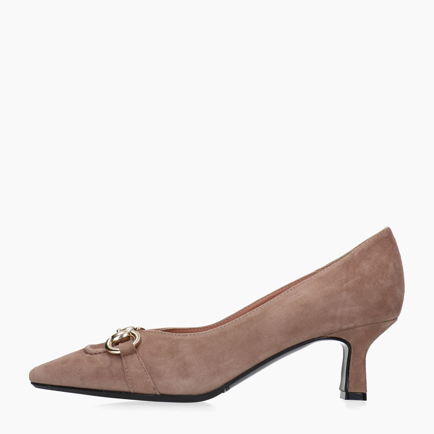 Taubengrauer Wildlederpumps mit goldenem Clip und Ziernähten an der Spitze. Leicht eckige Zehenpartie. Lederfutter. Gummisohle. 5,5 cm Absatz. La Sellerie Damen Herbst/Winter Kollektion.