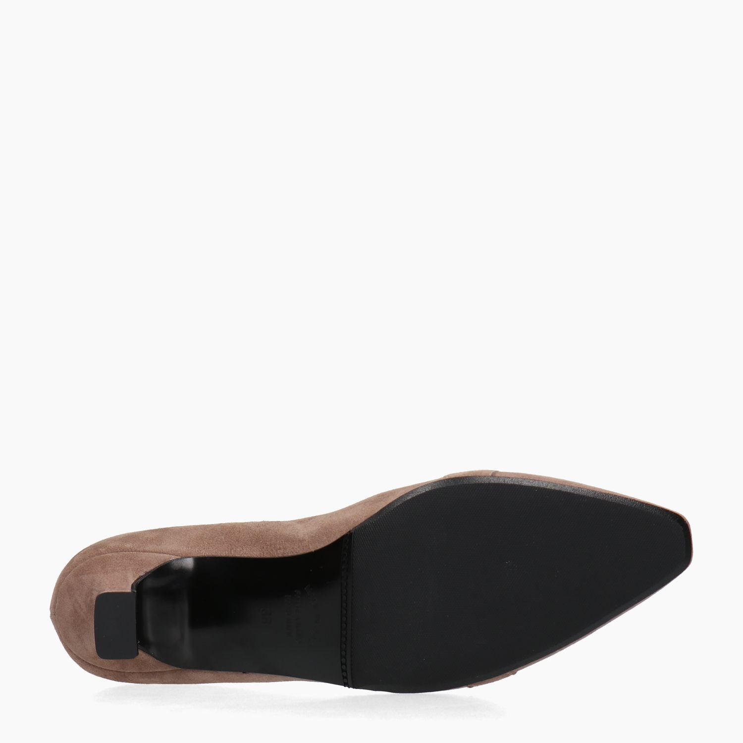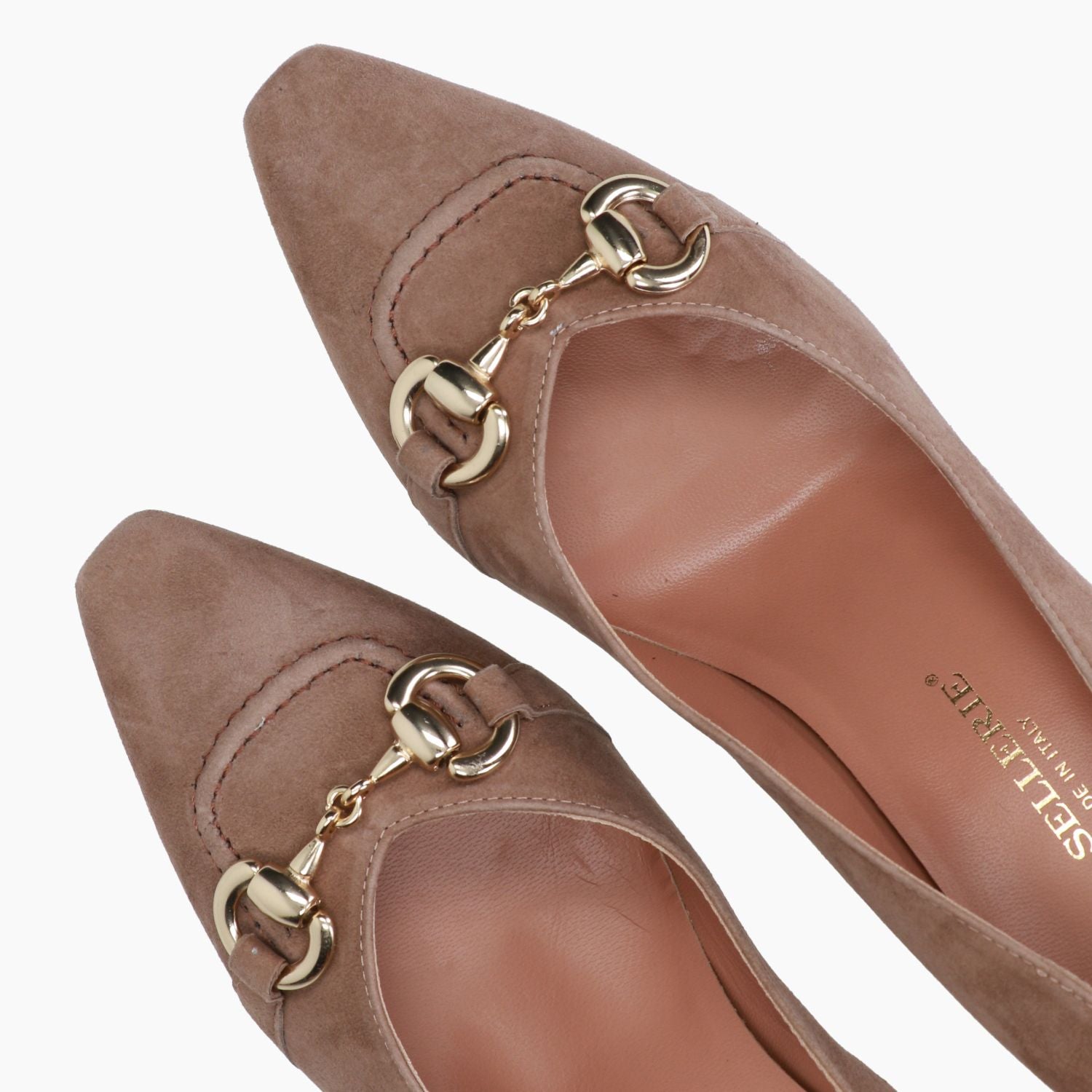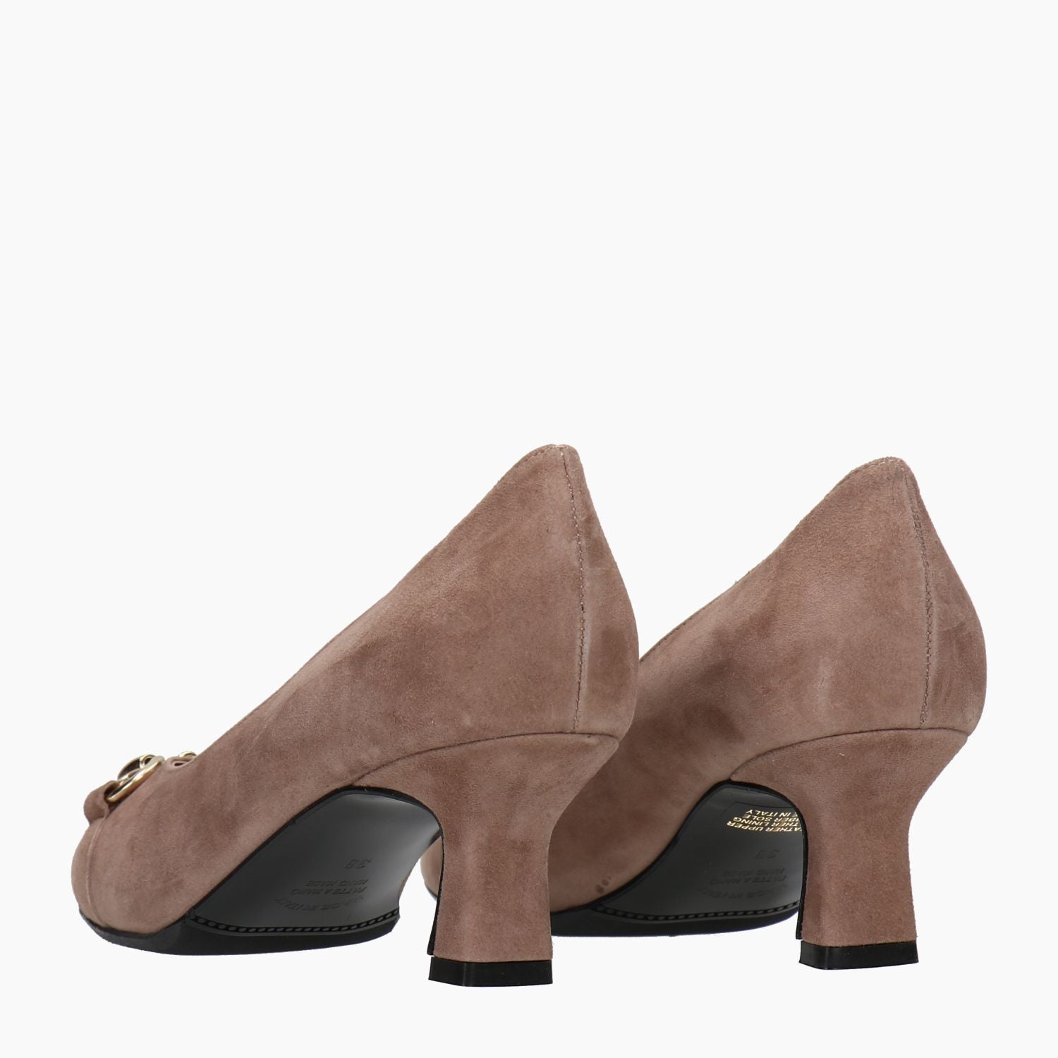 Taubengrauer Wildlederpumps mit goldenem Clip und Ziernähten an der Spitze. Leicht eckige Zehenpartie. Lederfutter. Gummisohle. 5,5 cm Absatz. La Sellerie Damen Herbst/Winter Kollektion.