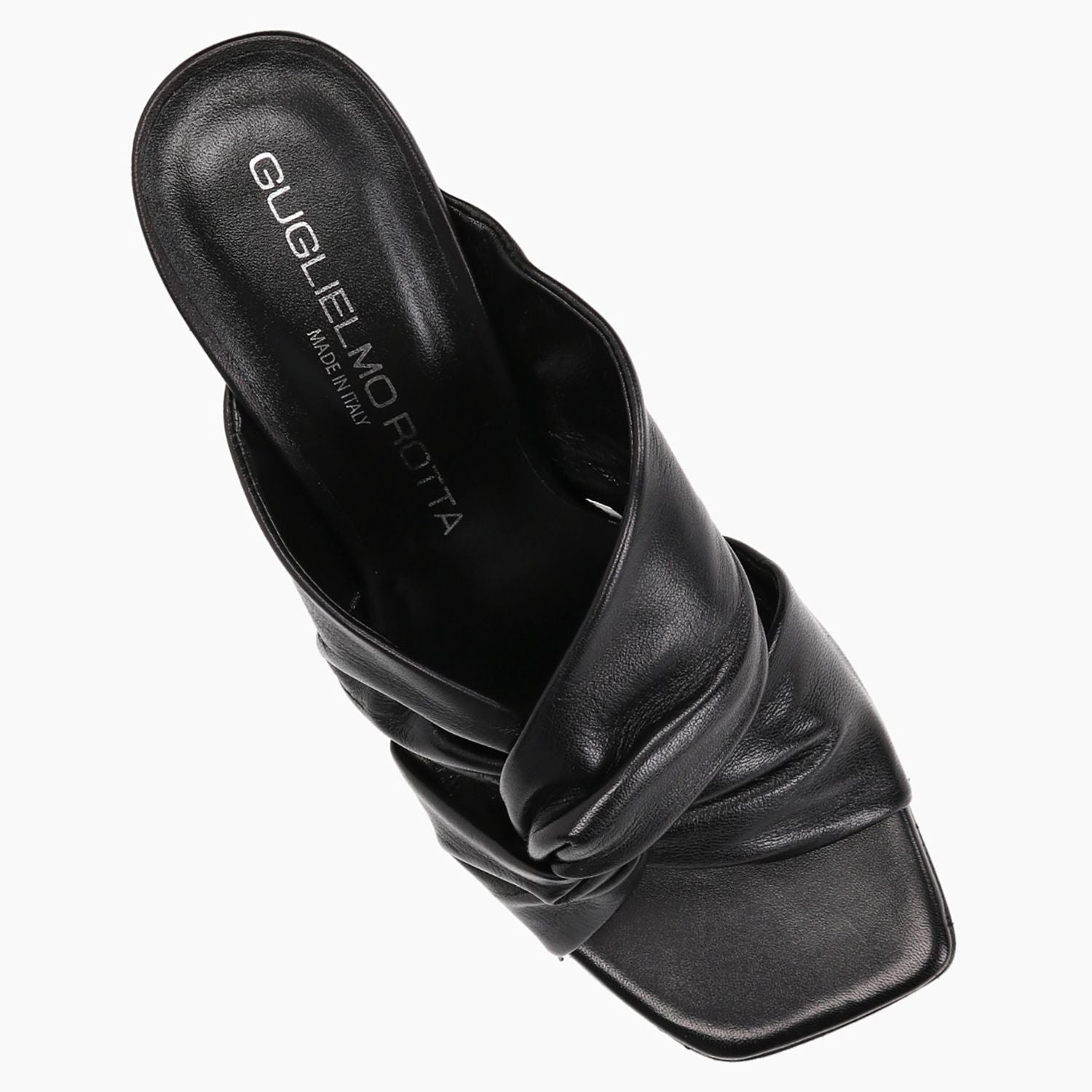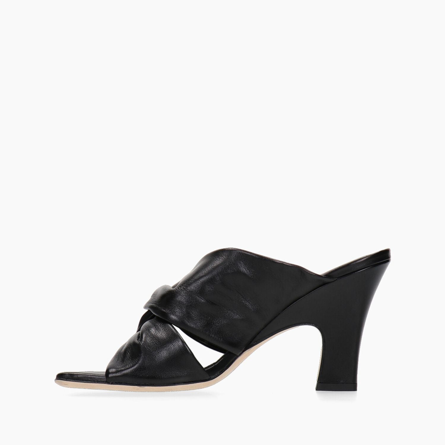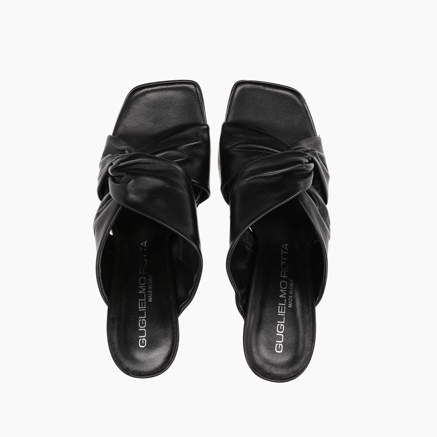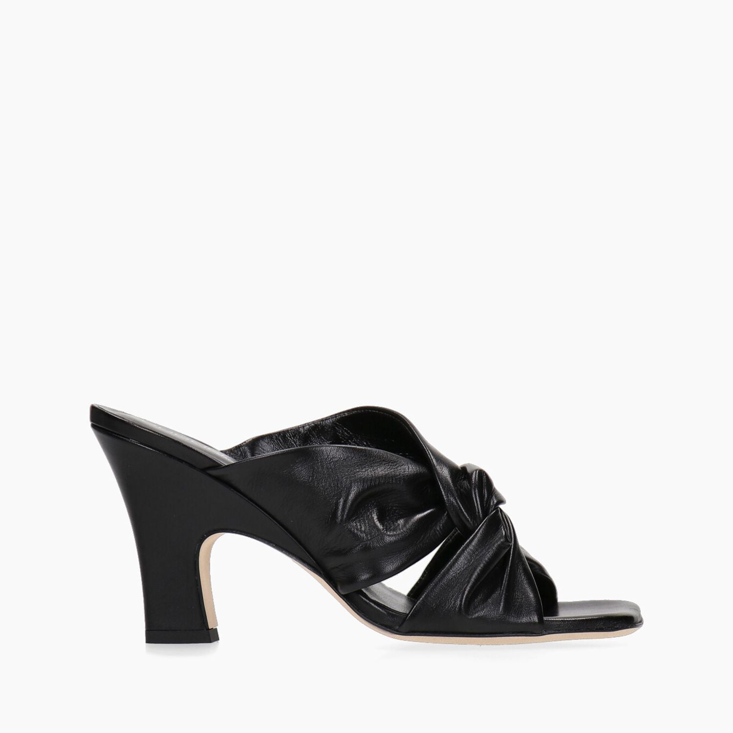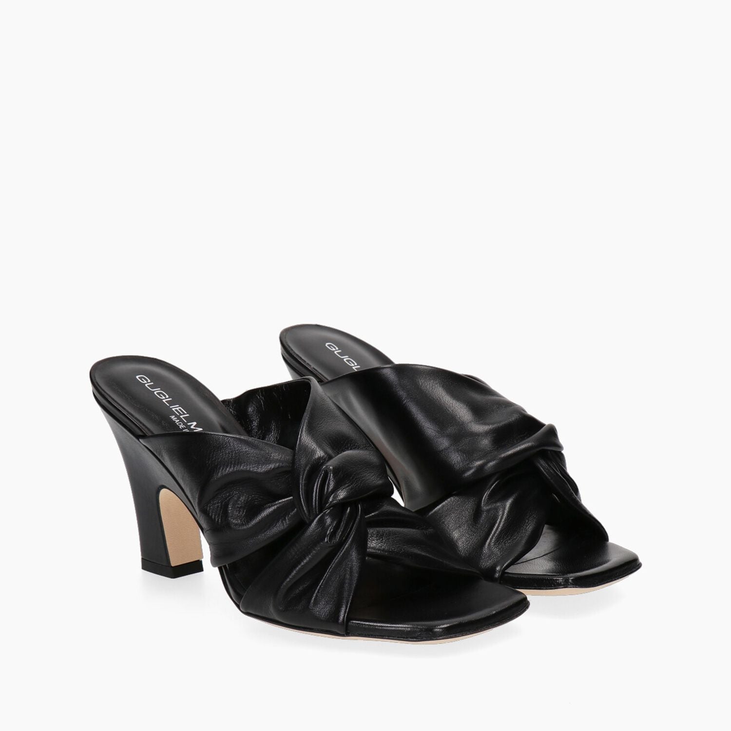 Schwarze Lederpantoffeln mit geknotetem Schaft, 80 cm Absatz und Ledersohle.