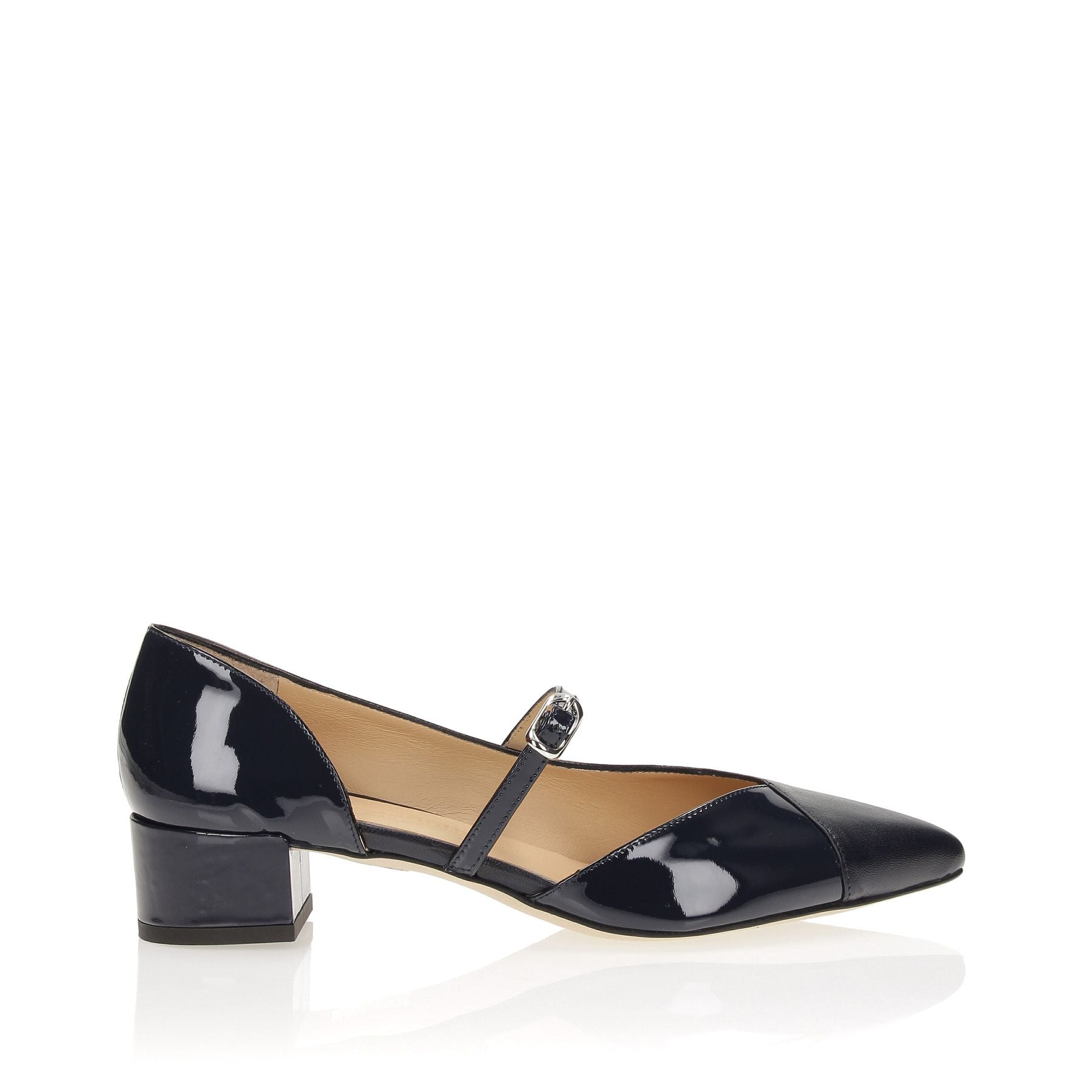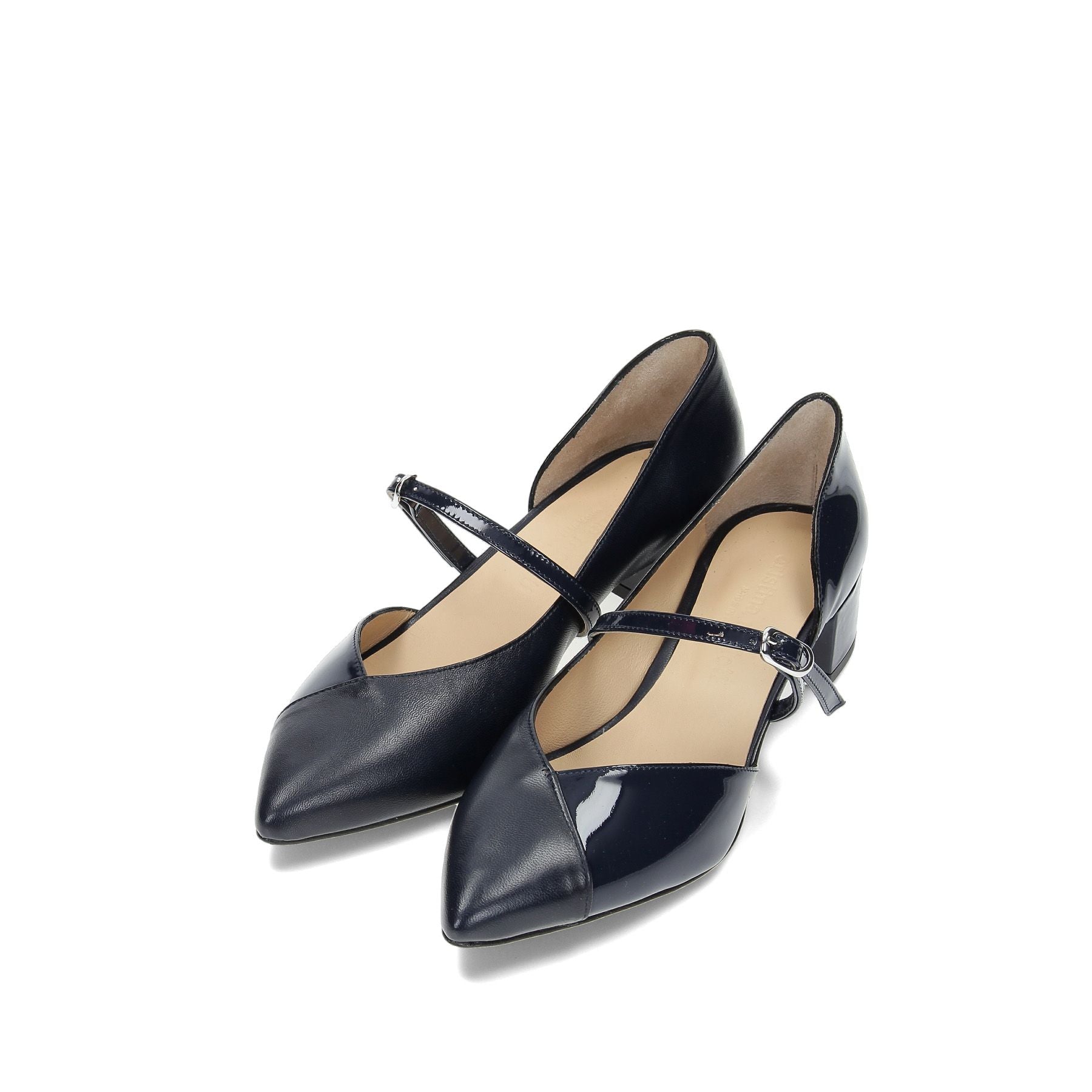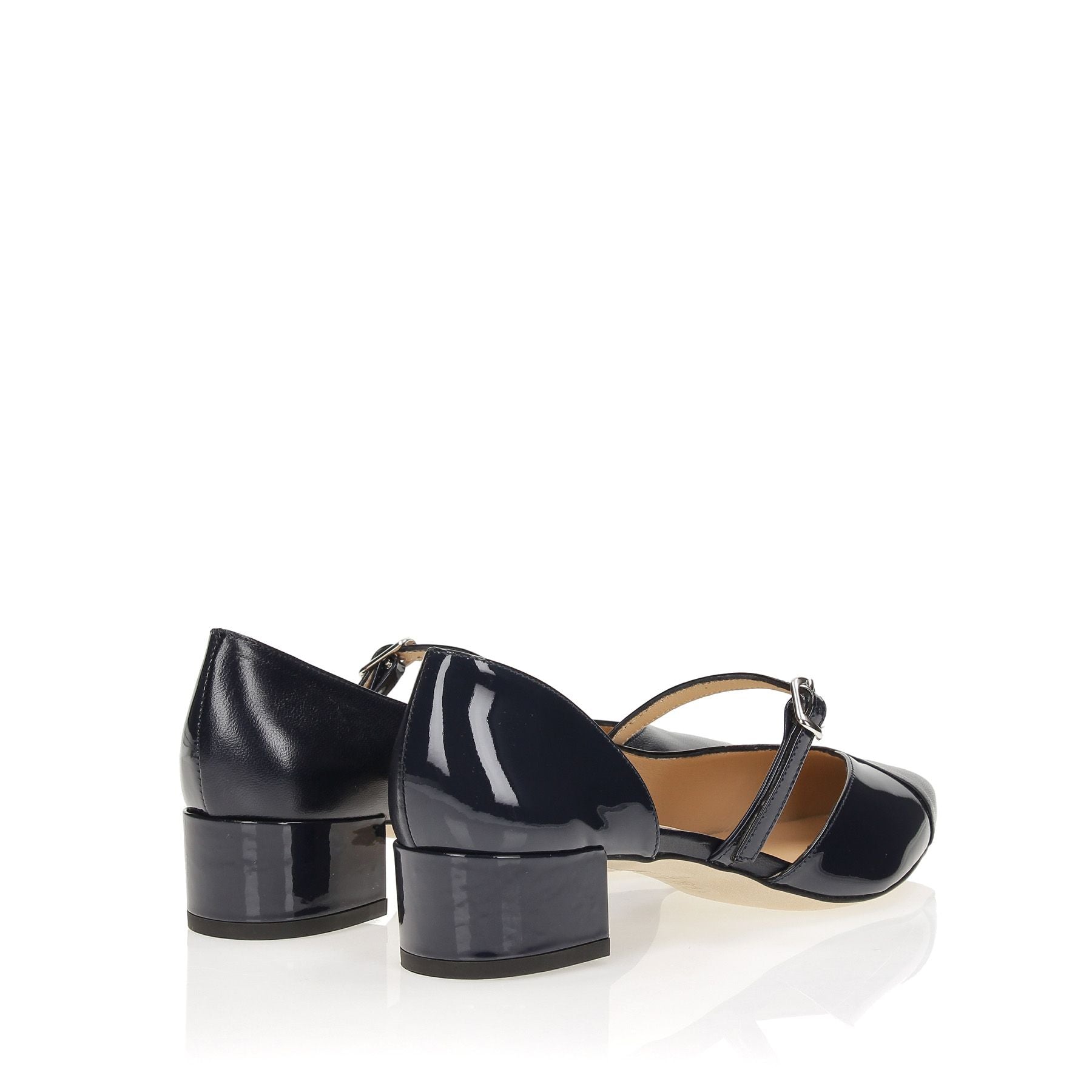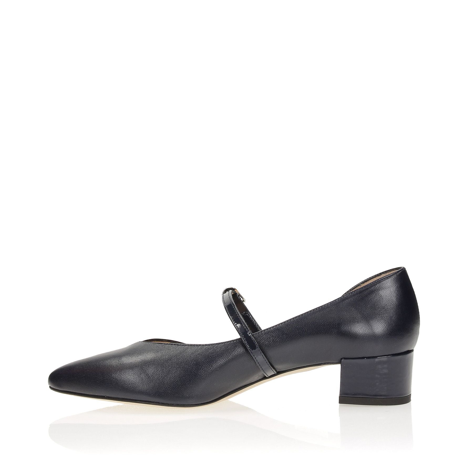 Zehenfreies Dekolleté mit seitlichem Riemen aus blauem Leder, 35 cm Absatz, Ledersohle.