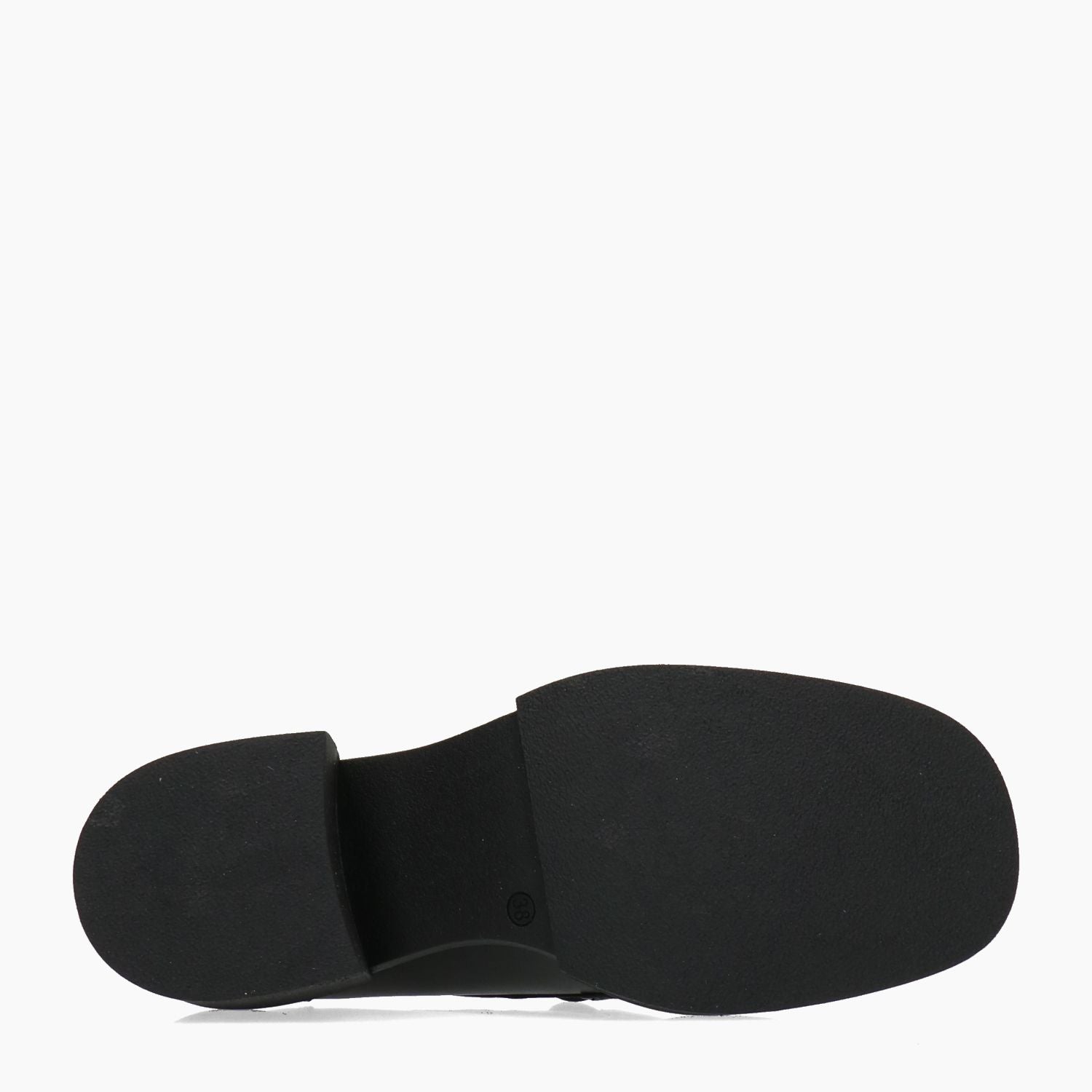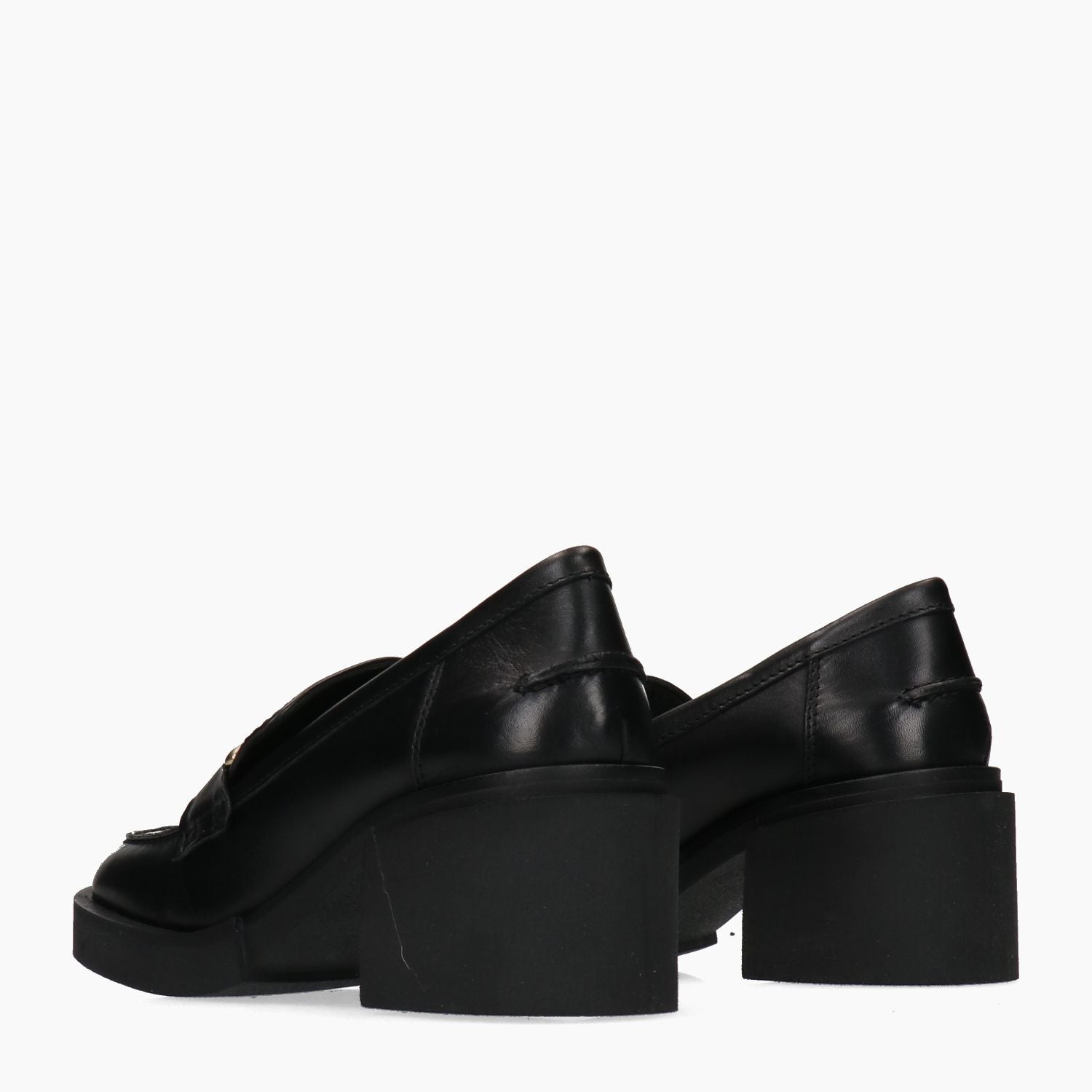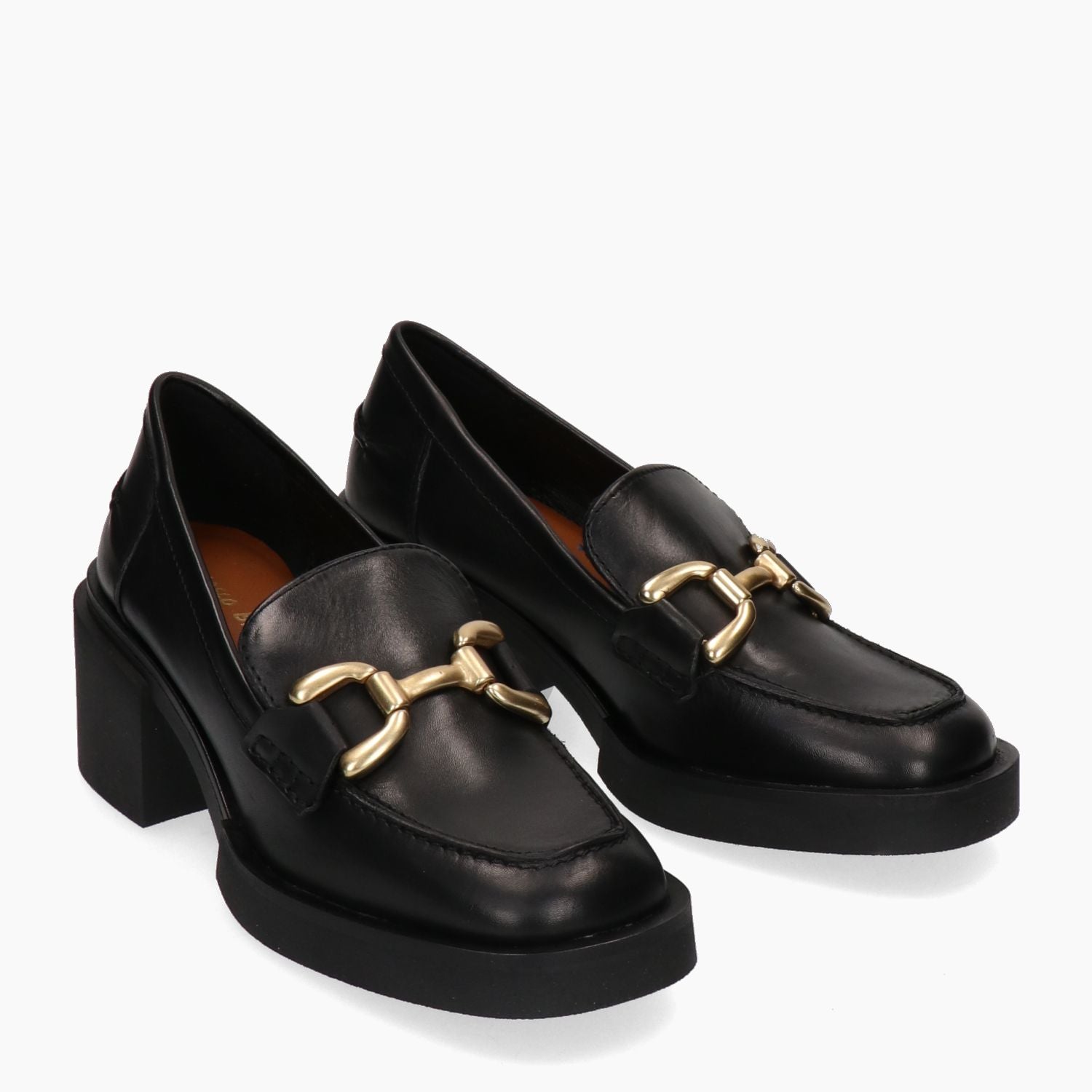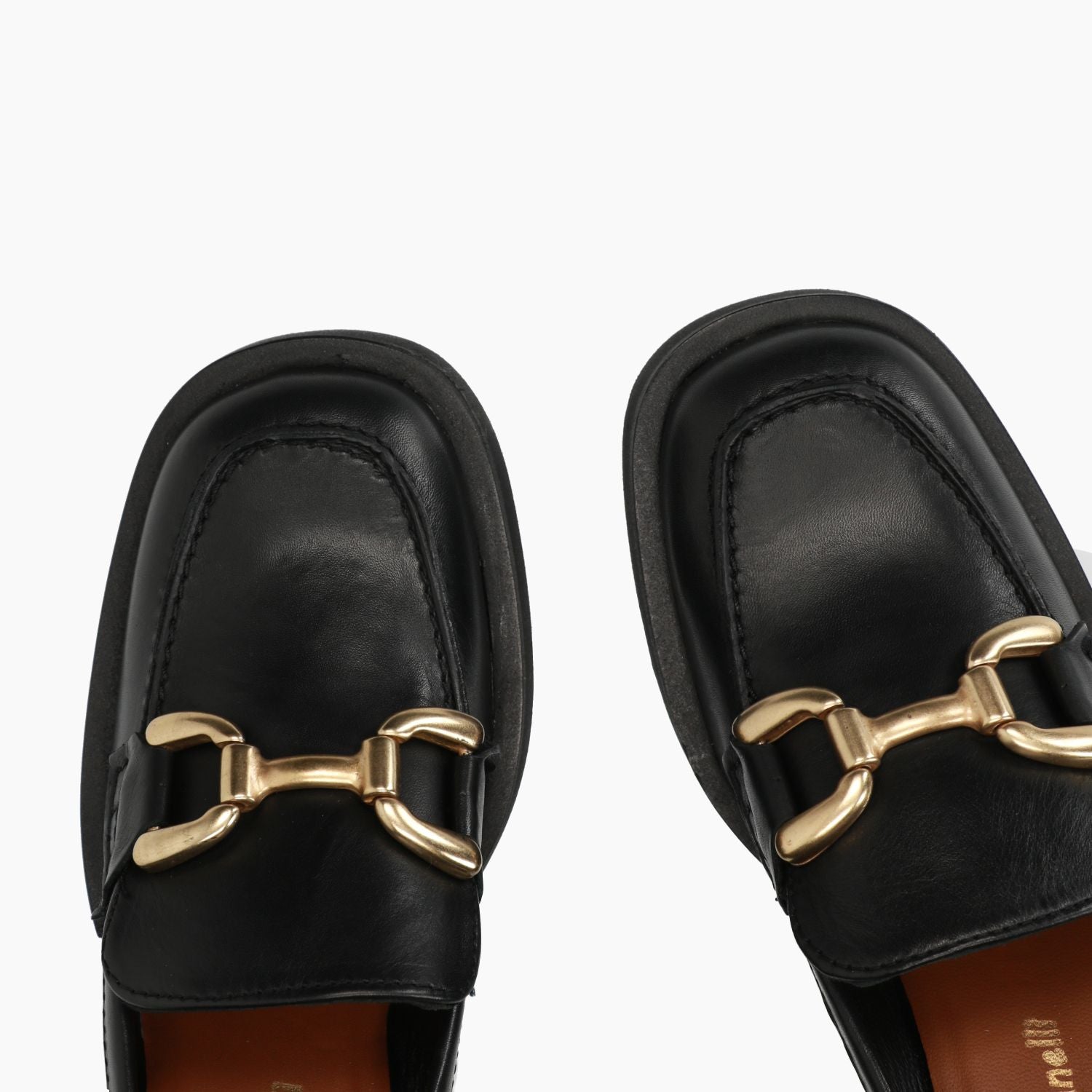 Schwarze Lederslipper mit goldfarbener Metallschnalle. Quadratische Zehenpartie. Futter aus Leder und Textil. Gummisohle mit 6 cm Absatz. Francesco Brunelli Damen-Herbst-/Winterkollektion.