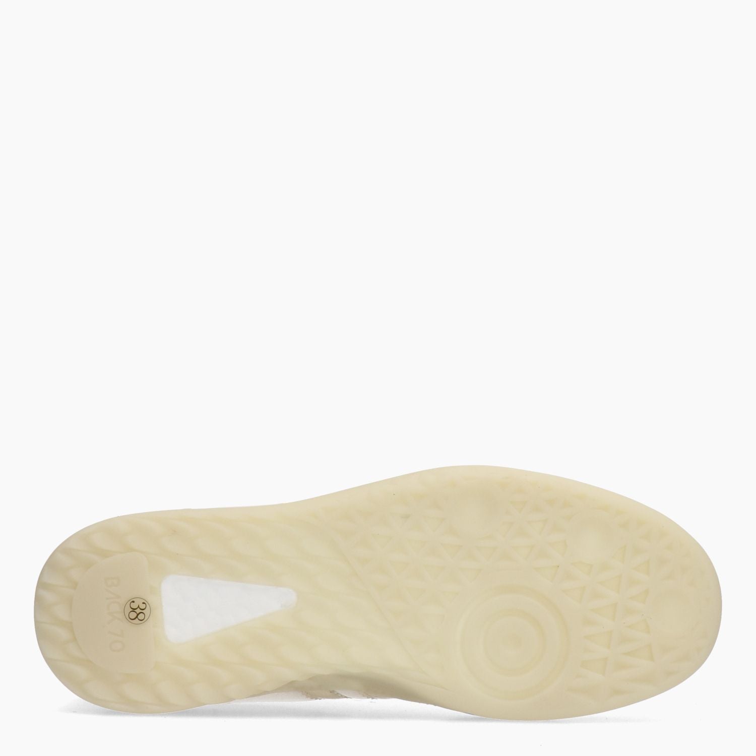 Weiße Ledersneaker. Goldfarbenes, laminiertes Lederlogo an der Seite. Textilfutter mit herausnehmbarer Innensohle. Ersatzschnürsenkel aus weißer Baumwolle inklusive. Kittfarbene Gummisohle. Damenkollektion Back 70.
