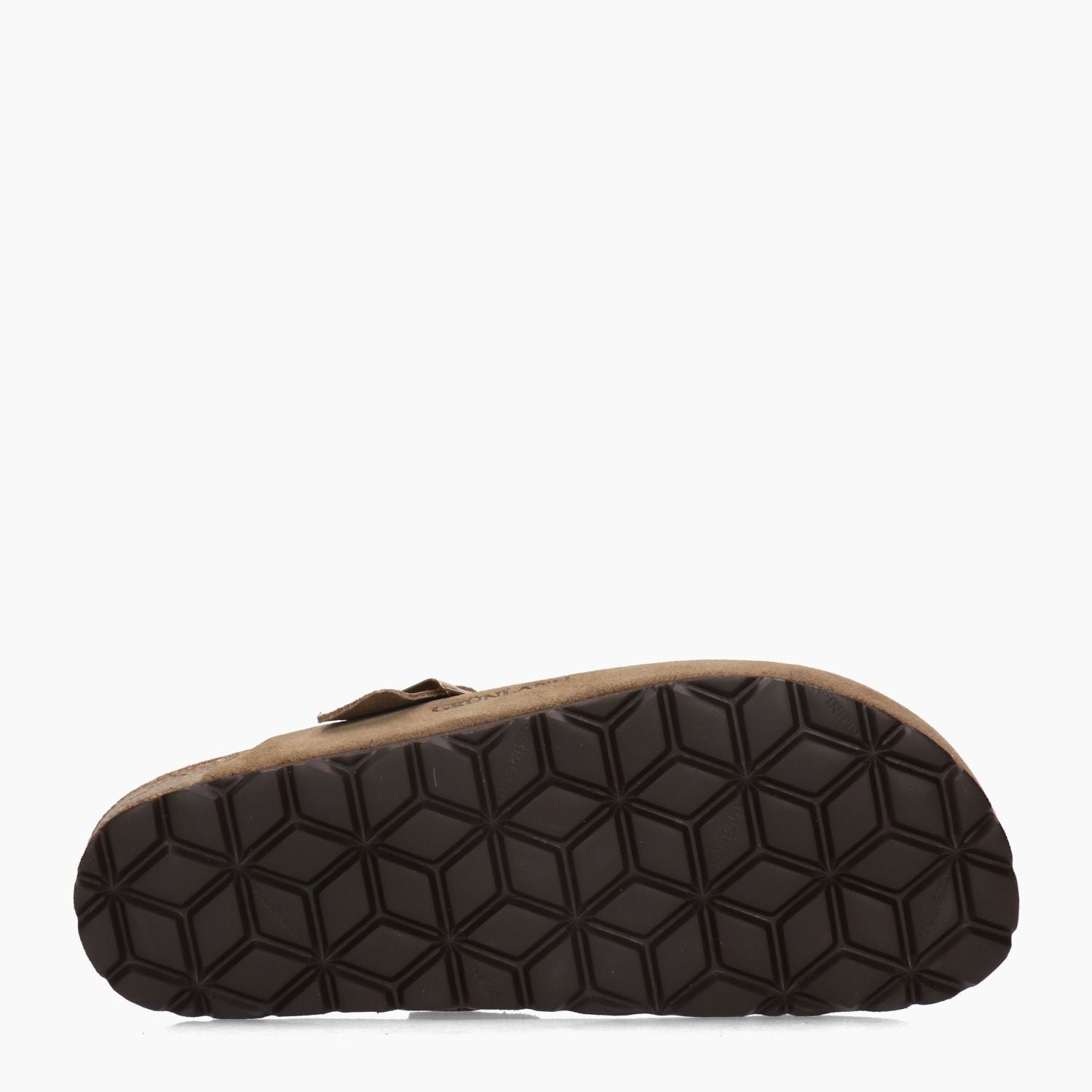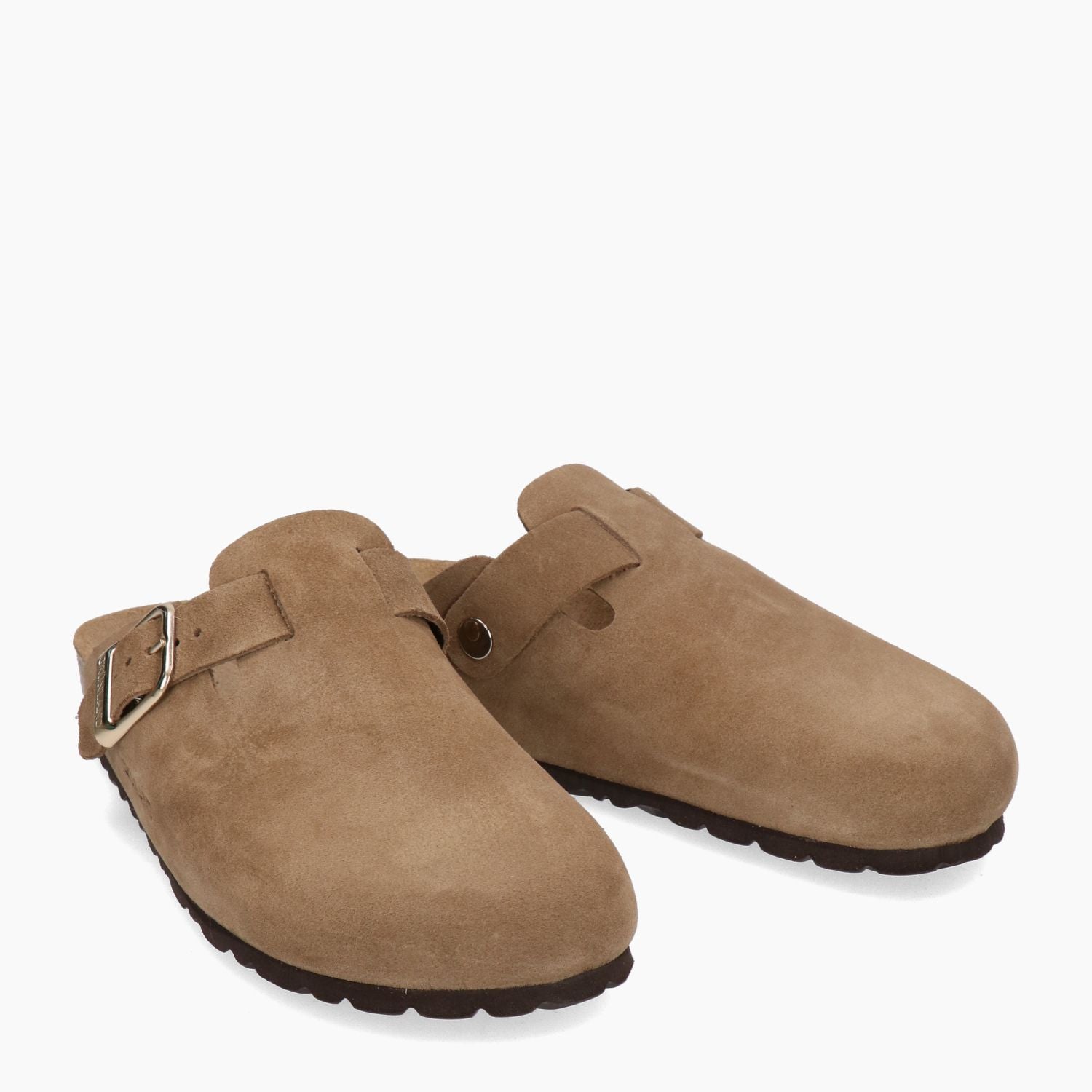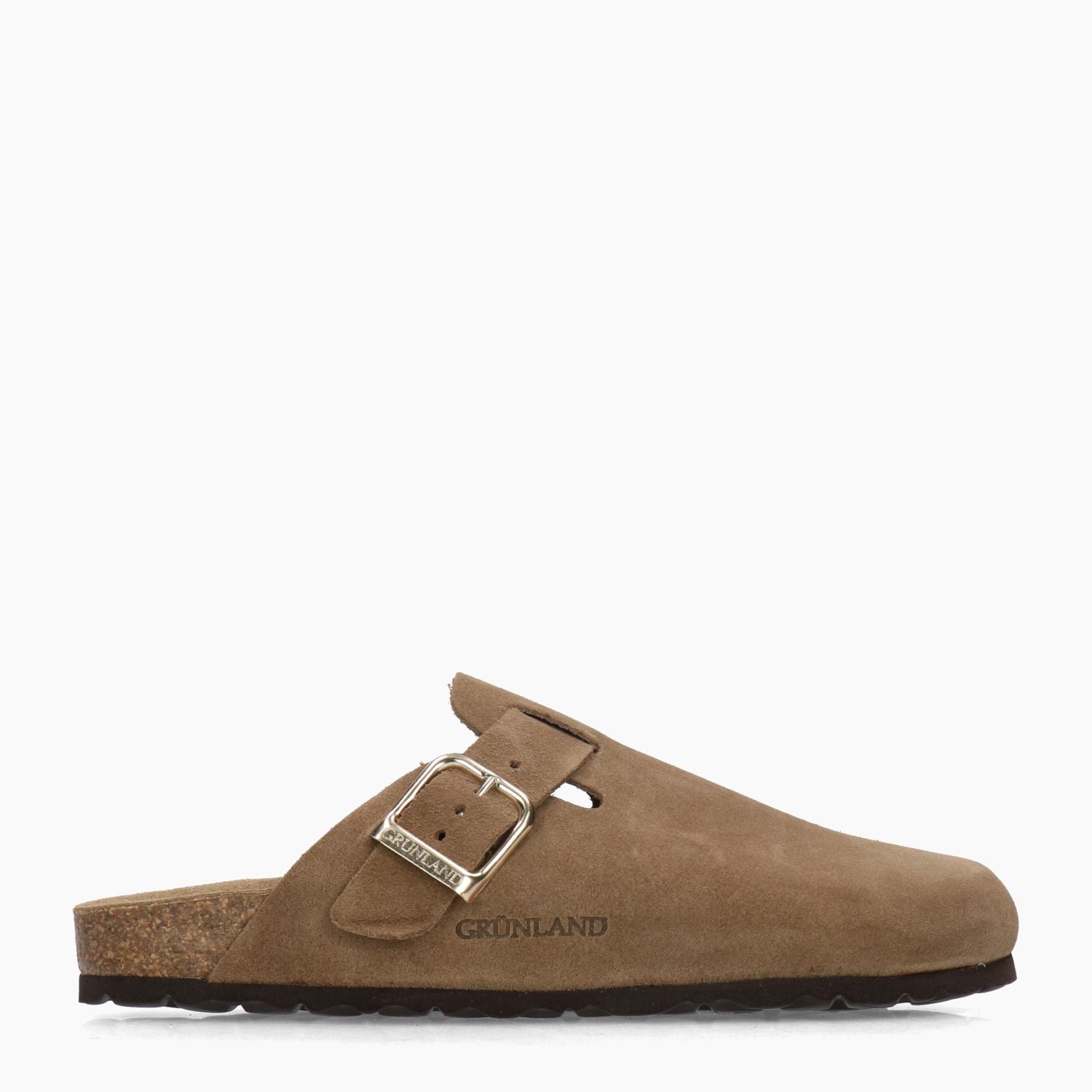 Grunland-Mules mit taubengrauem Veloursleder-Obermaterial. Mit Metallschnalle. Lederfutter mit gepolsterter Innensohle. Gummisohle. Damenkollektion Grunland.