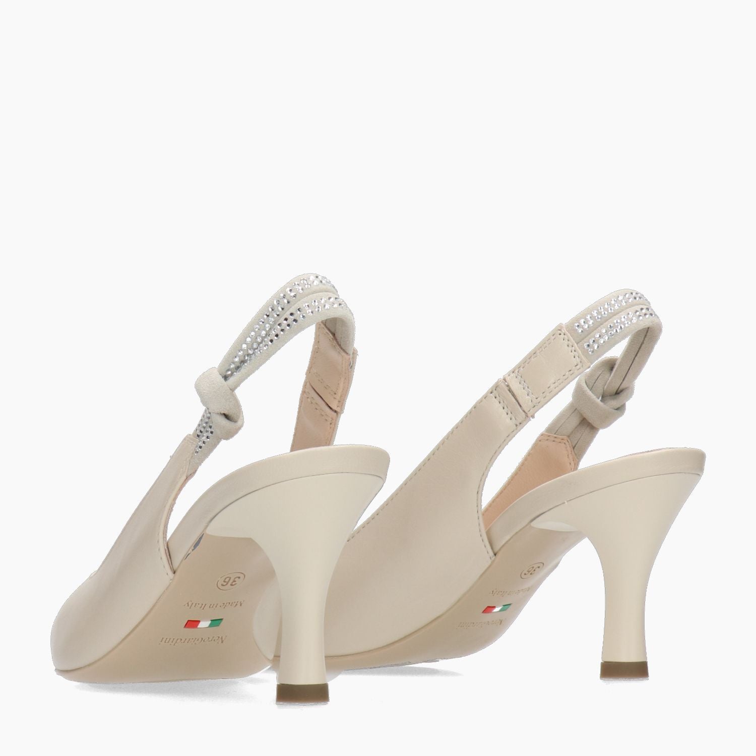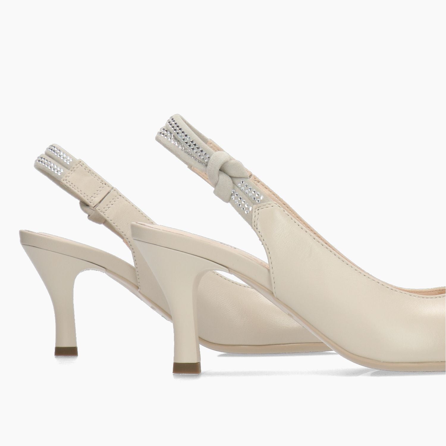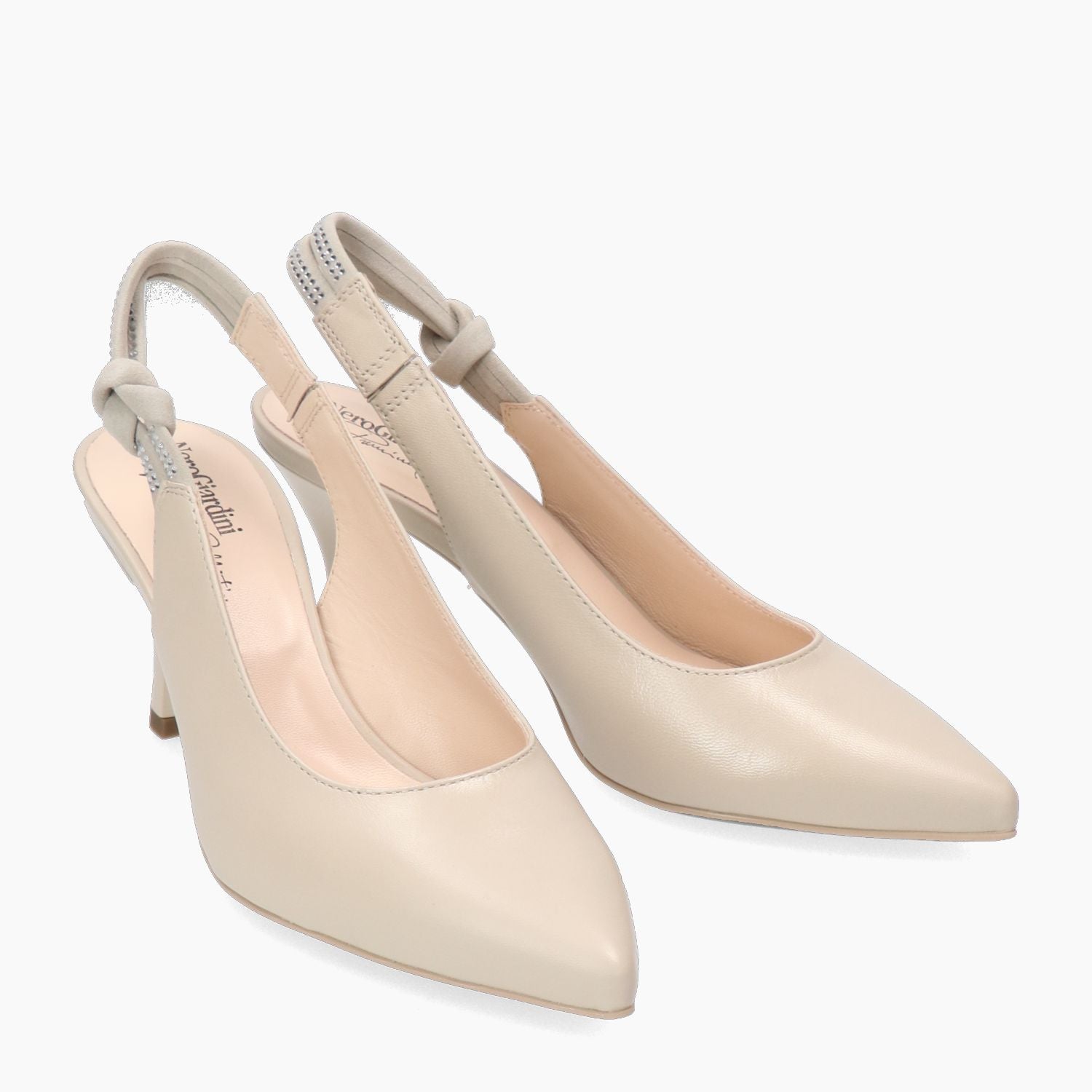 Beigefarbene Chanel-Tasche aus Leder mit beigefarbenem Wildlederriemen und silbernen Strasssteinen. Elastischer Riemen zur Verstellung. Lederfutter. Gummisohle mit 7 cm Absatz. Aus der Damen-Frühjahr/Sommer-Kollektion von Nero Giardini.