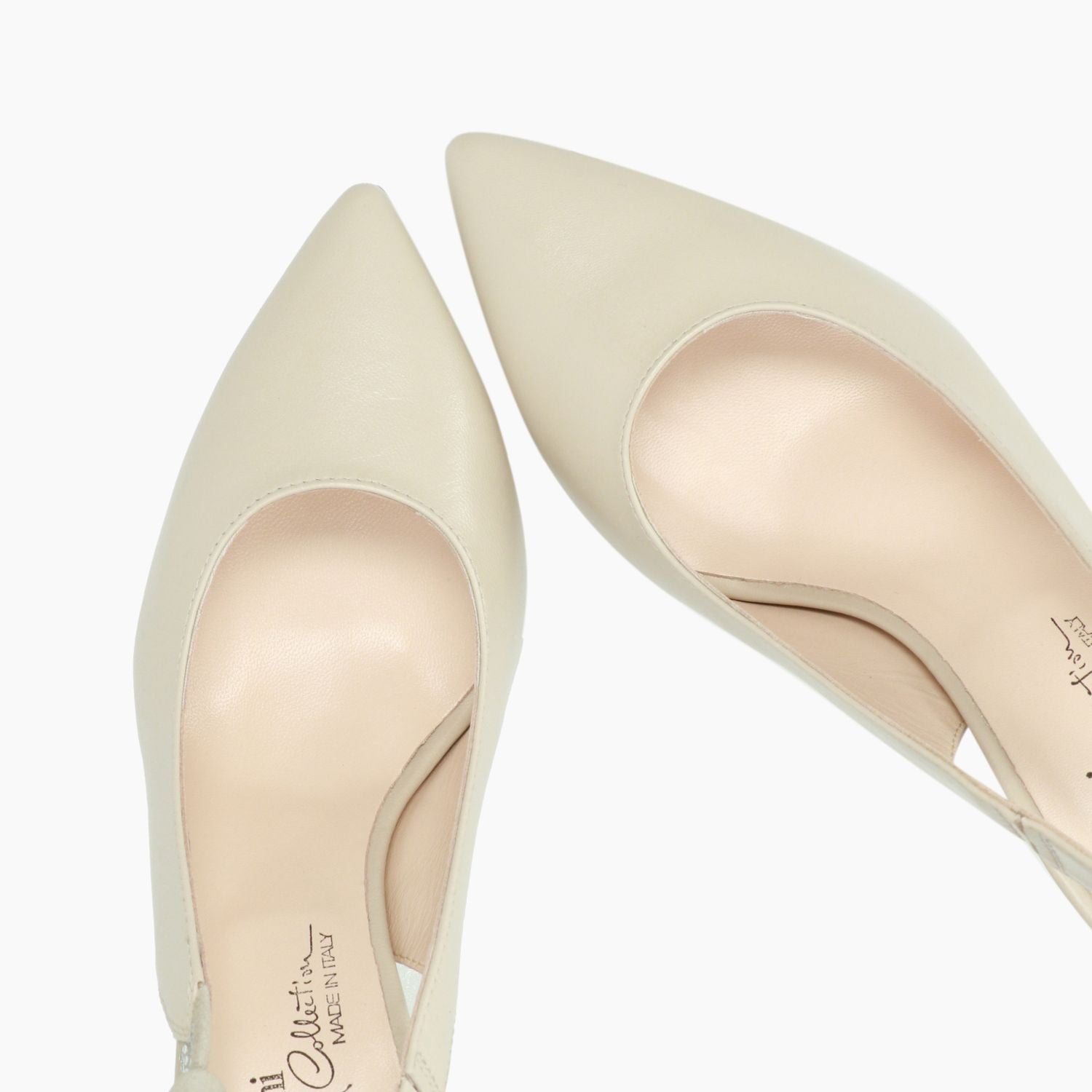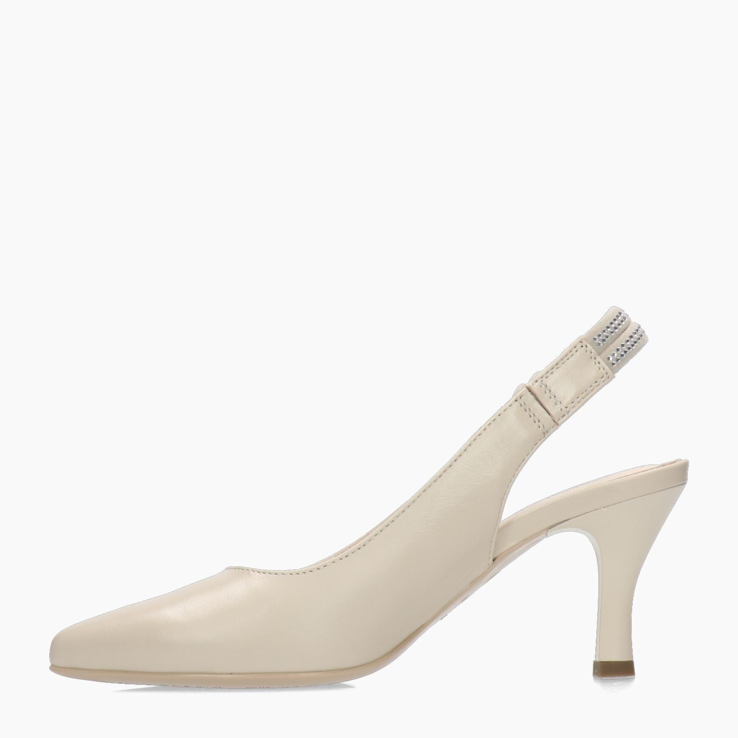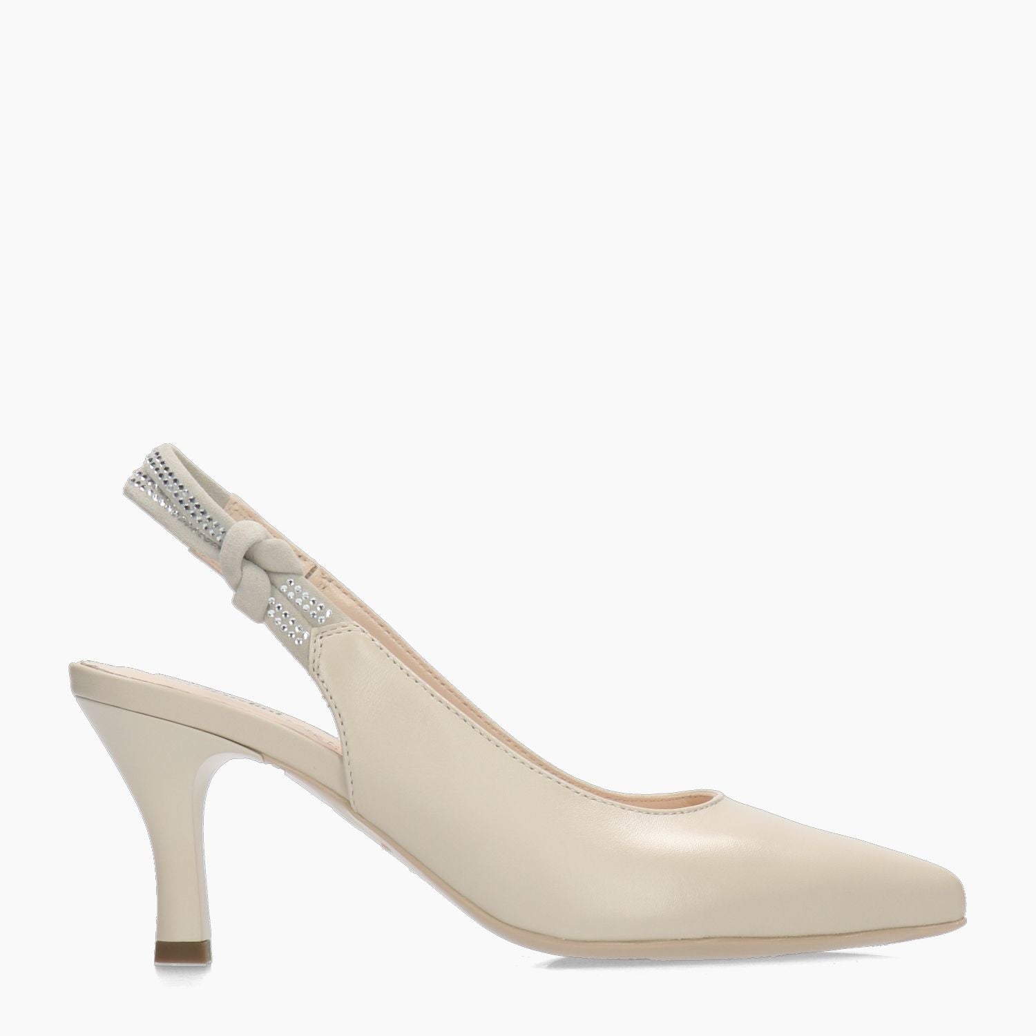Beigefarbene Chanel-Tasche aus Leder mit beigefarbenem Wildlederriemen und silbernen Strasssteinen. Elastischer Riemen zur Verstellung. Lederfutter. Gummisohle mit 7 cm Absatz. Aus der Damen-Frühjahr/Sommer-Kollektion von Nero Giardini.