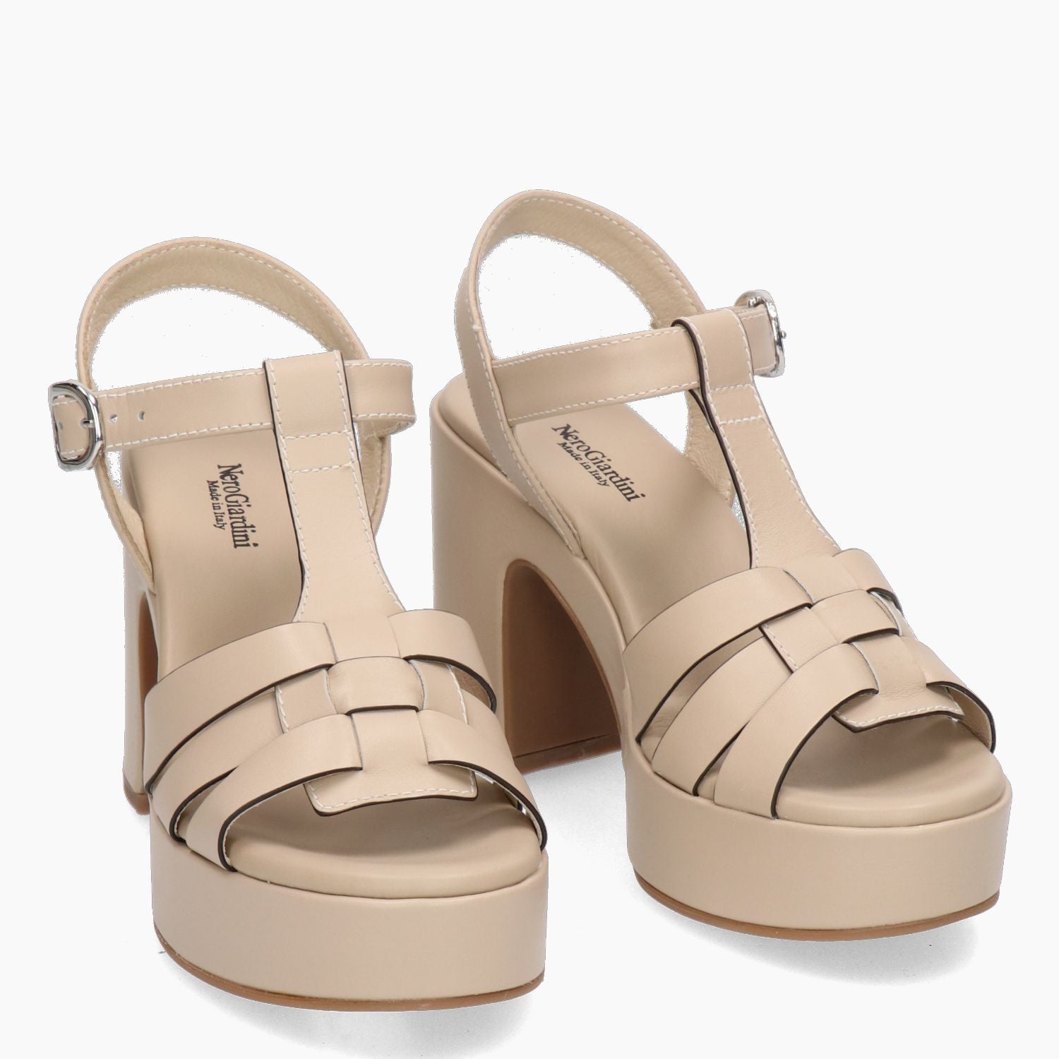 Beige Ledersandale. Verstellbarer Riemen mit silberner Logoschnalle. Lederfutter mit gepolsterter Innensohle. Gummisohle mit 9 cm Absatz und 3 cm Plateau. Aus der Damen-Frühjahr/Sommer-Kollektion von Nero Giardini.
