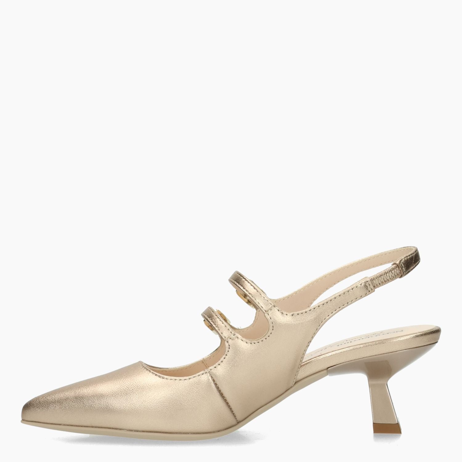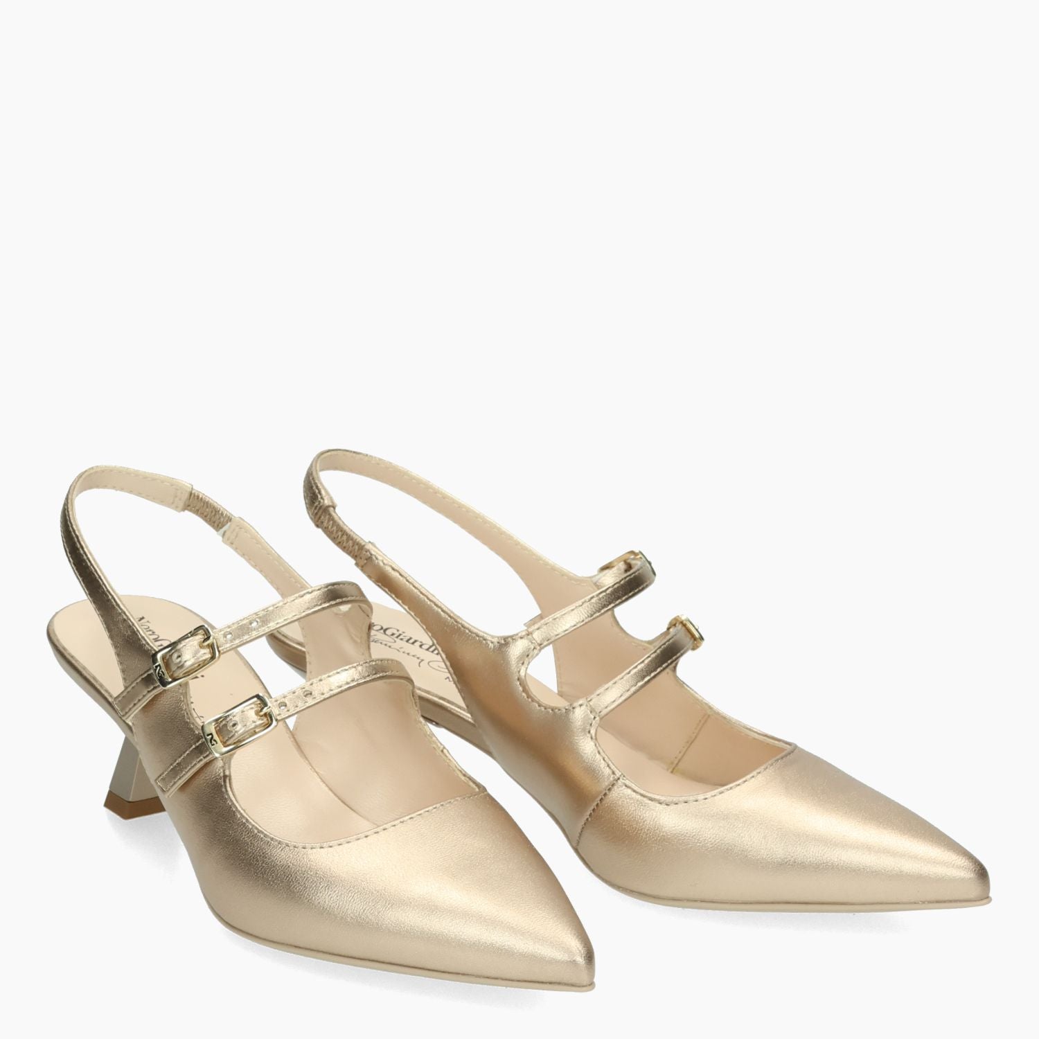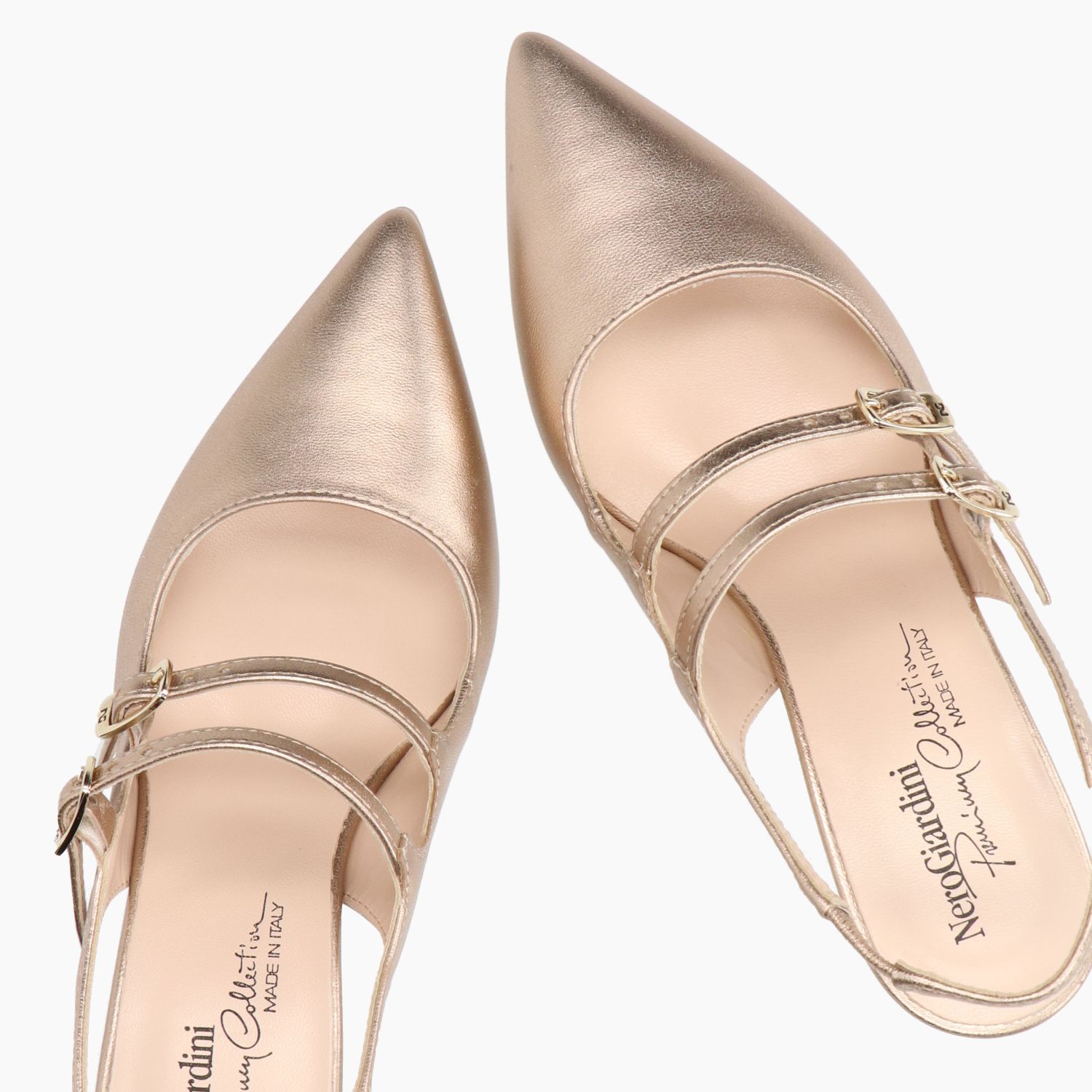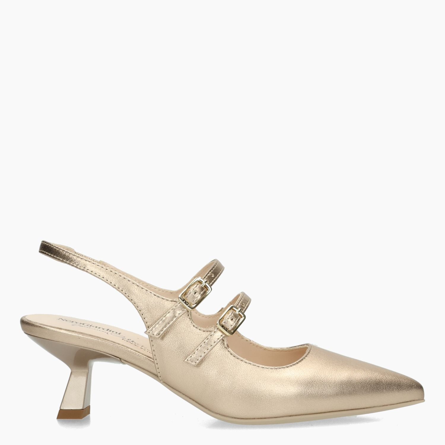 Goldfarbene Chanel-Pumps aus Leder mit verstellbaren Riemen. Elastischer Fersenriemen zur Anpassung. Lederfutter. Gummisohle mit 5 cm Absatz. Aus der Damen-Frühjahr/Sommer-Kollektion von Nero Giardini.
