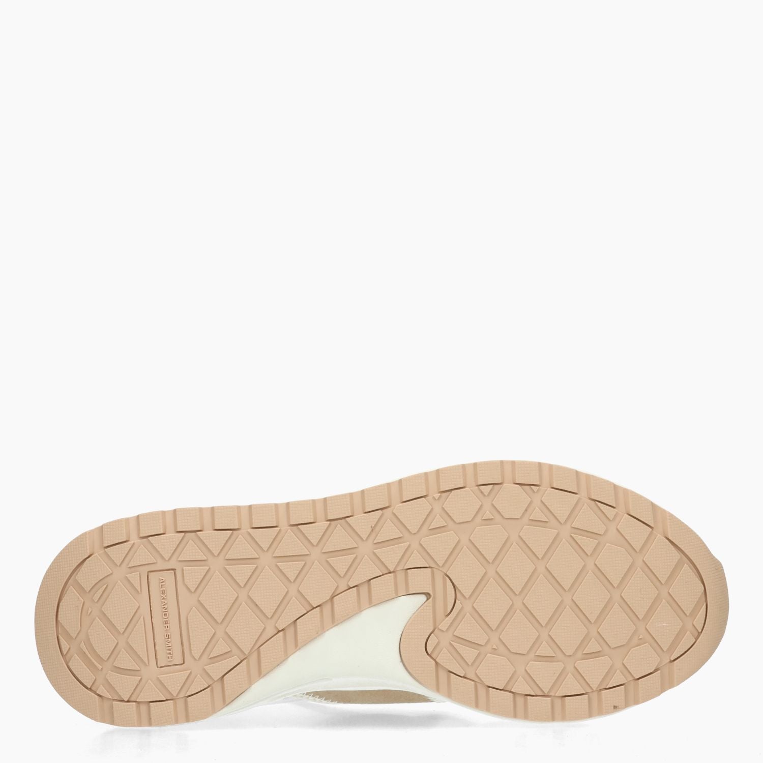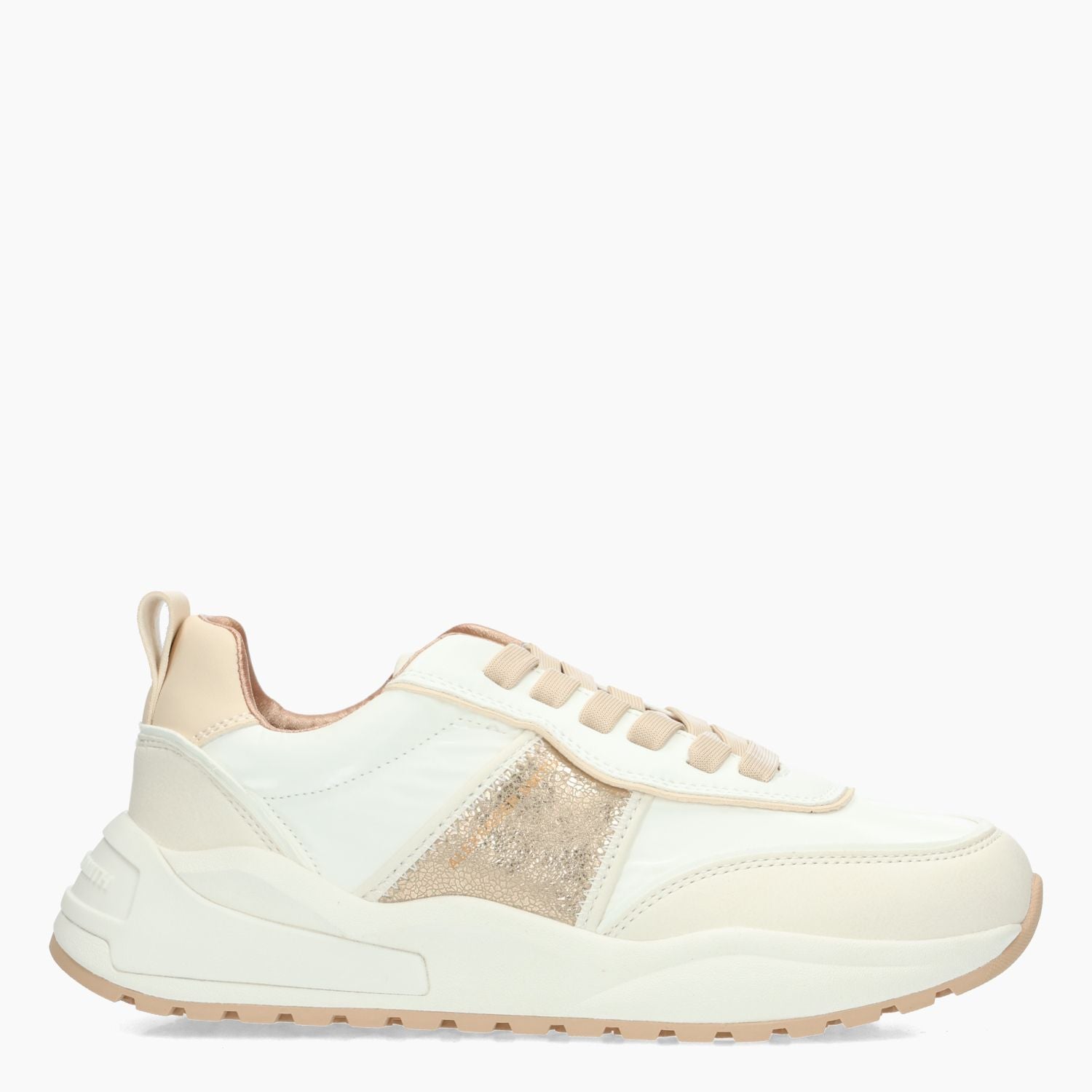 Dover Sneaker mit weißem Obermaterial aus Kunstleder und goldenen Streifen. Puderrosa Kunstleder-Ferse mit Logo. Herausnehmbare Kunstleder-Innensohle mit Textilfutter. Baumwollschnürsenkel. Logo-Zunge. 4 cm hohe Gummisohle. Alexander Smith ACBC Damenkollektion.