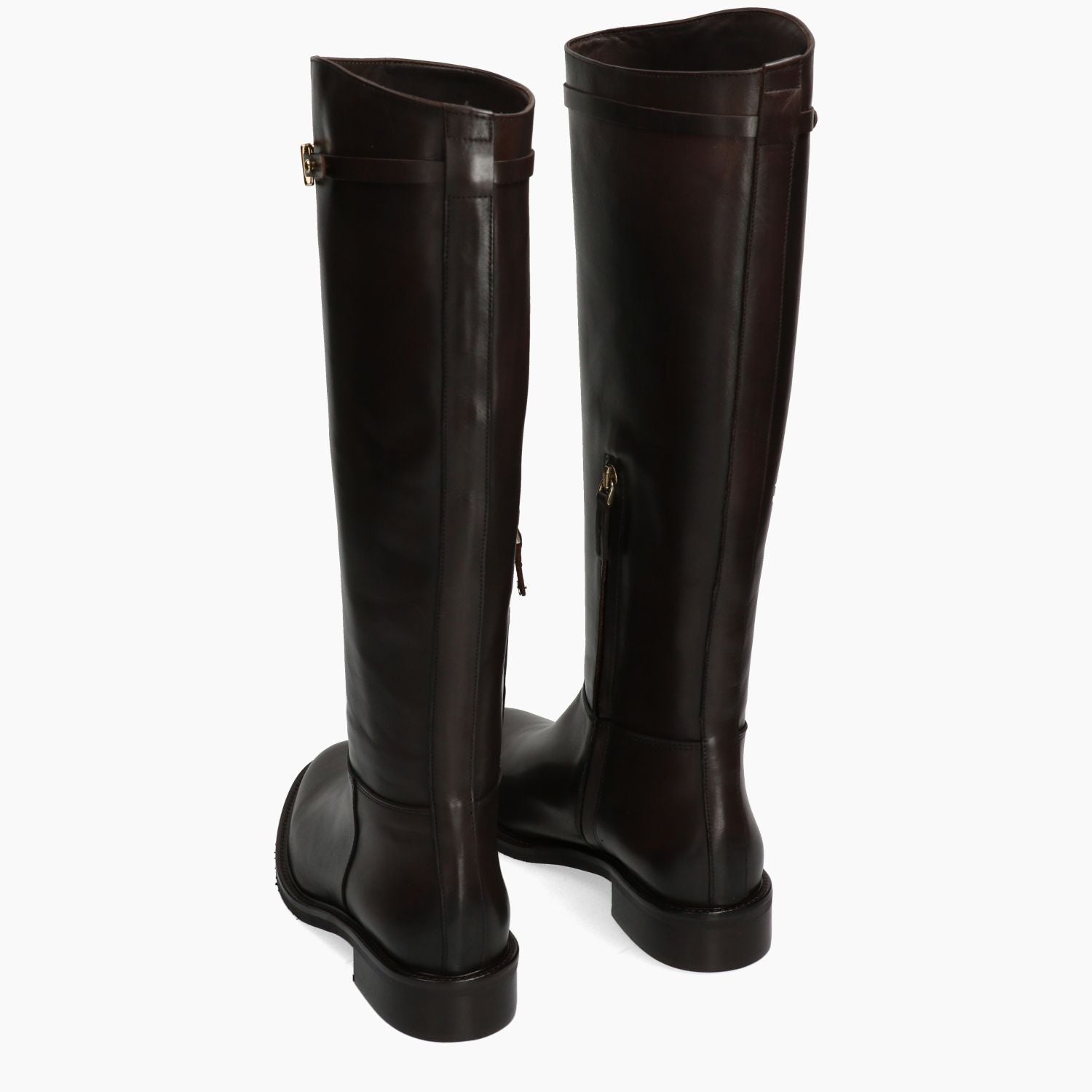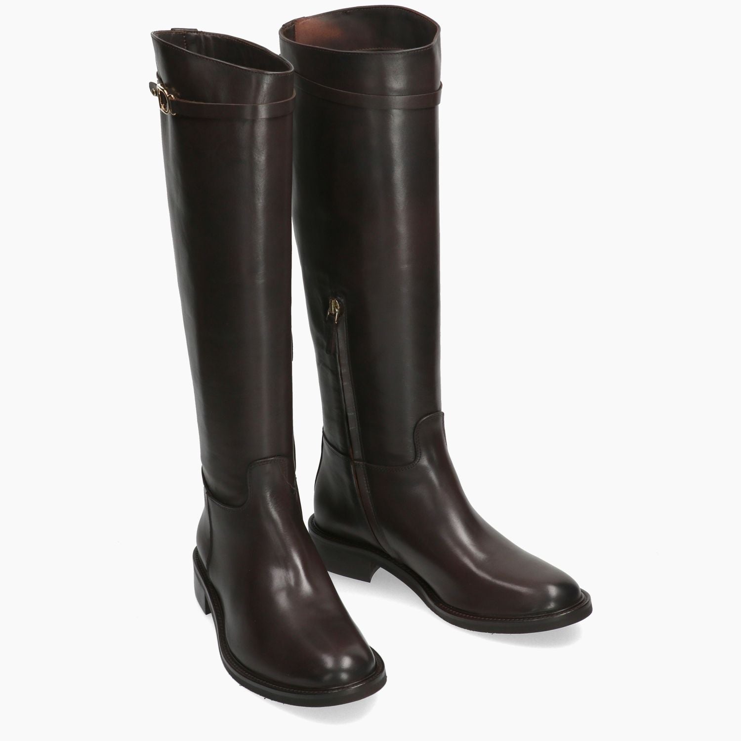Julie Dee Stiefel mit dunkelbraunem Leder-Obermaterial. Schafthöhe 41 cm (Größe 37). Kurzer seitlicher Reißverschluss. Lederfutter. Gummisohle mit 3 cm Absatz. Julie Dee Damen Herbst/Winter Kollektion.