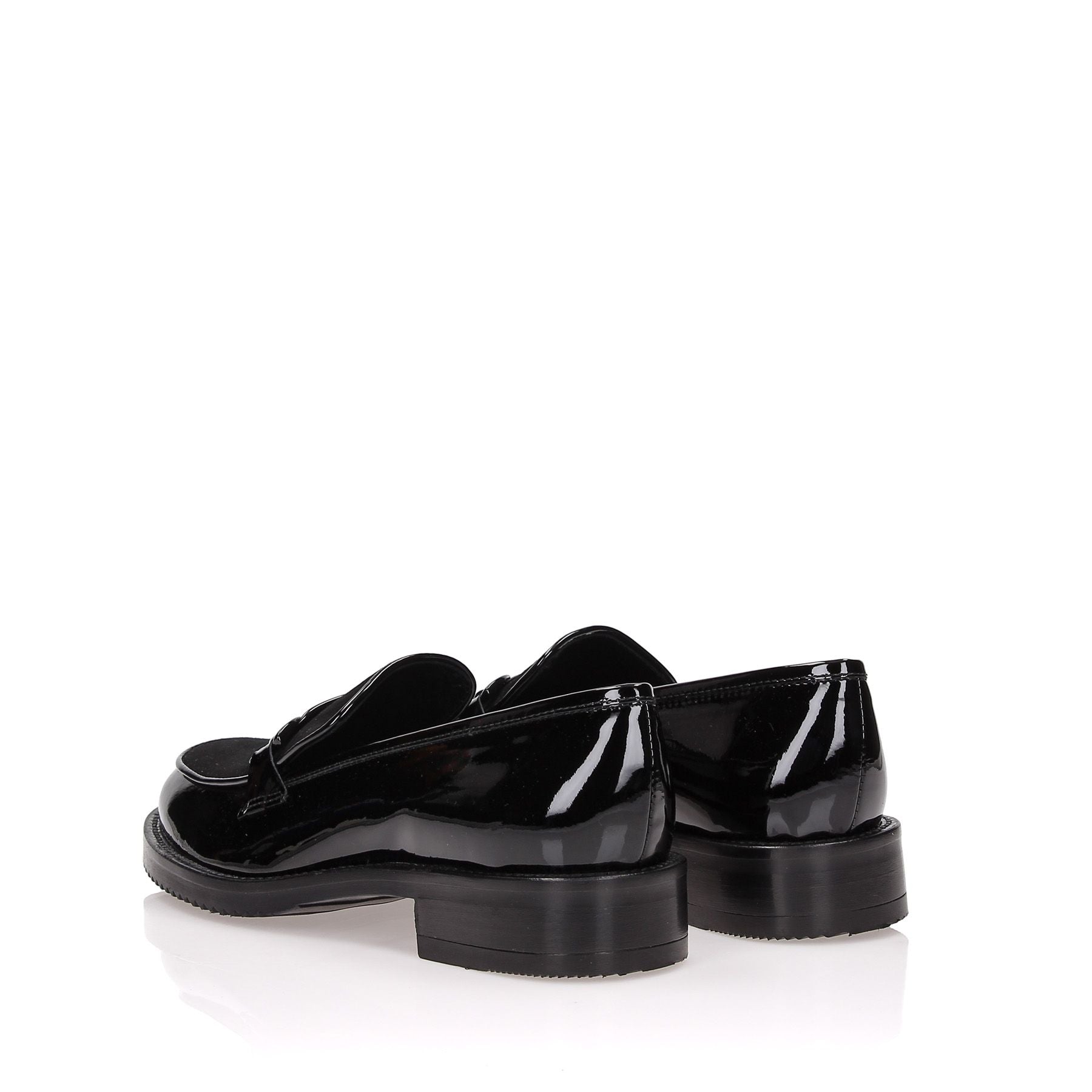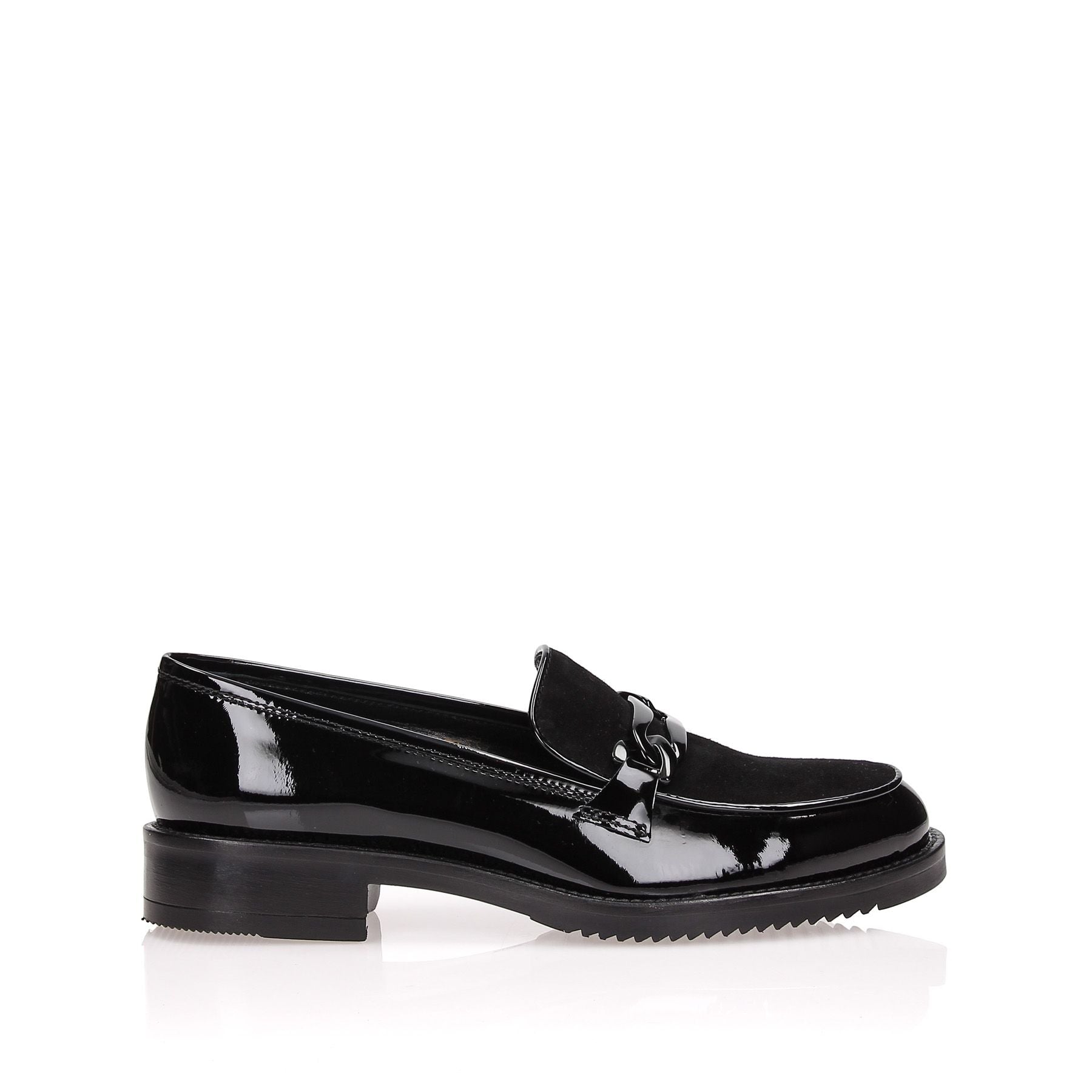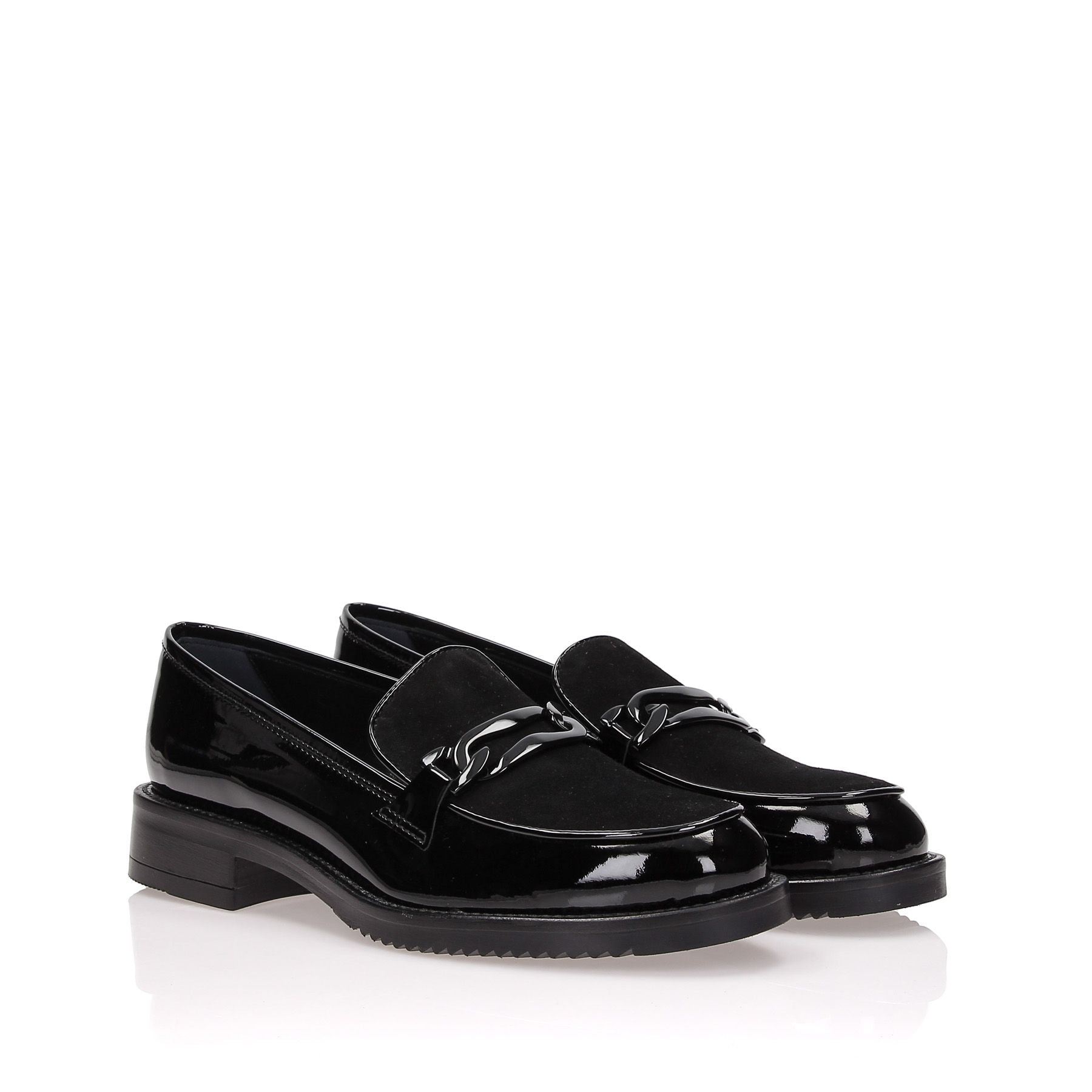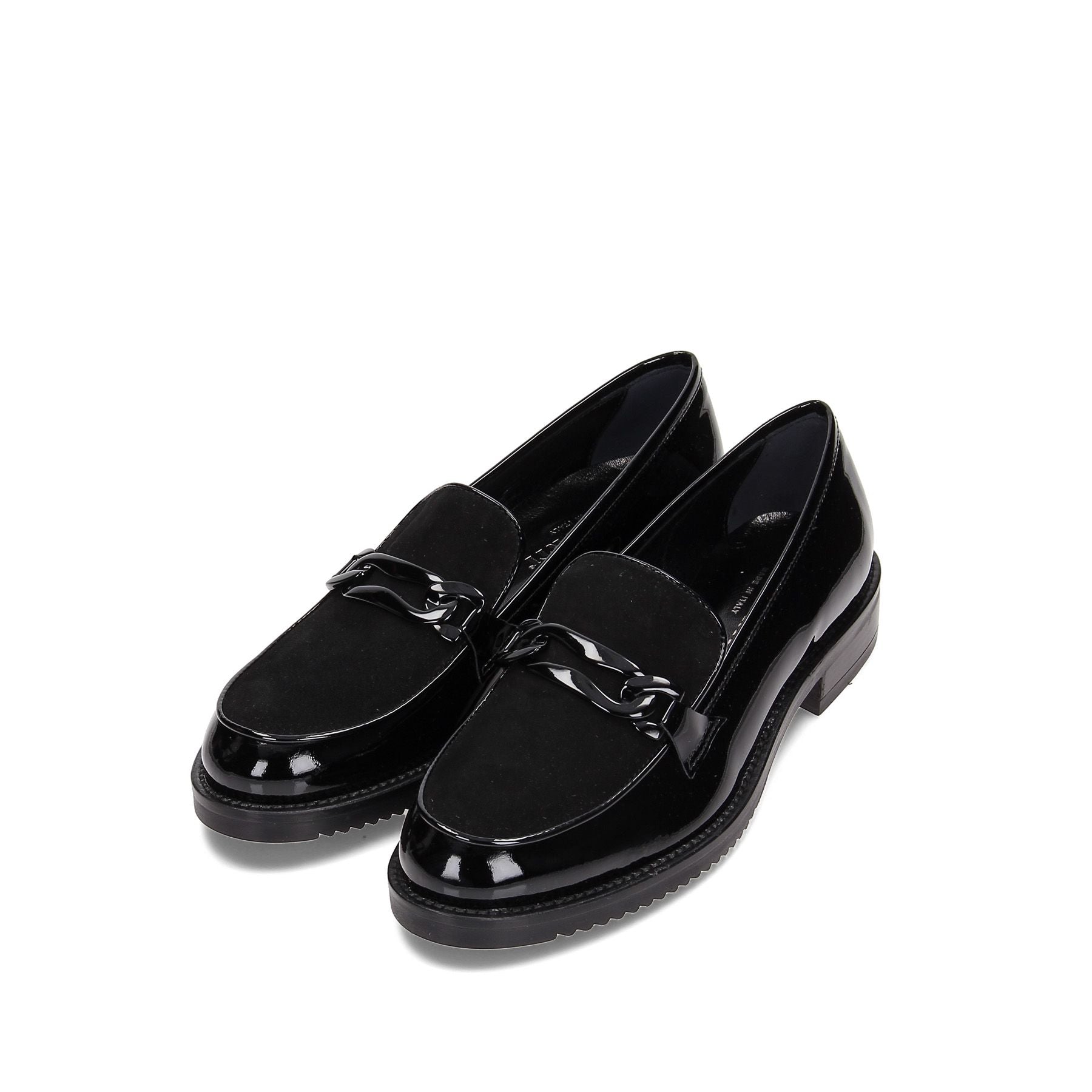 Schwarze Lackleder-Loafer mit schwarzem Wildleder-Obermaterial, 30 cm Absatz und Gummisohle.