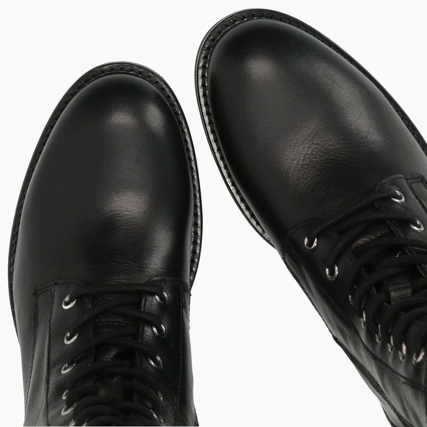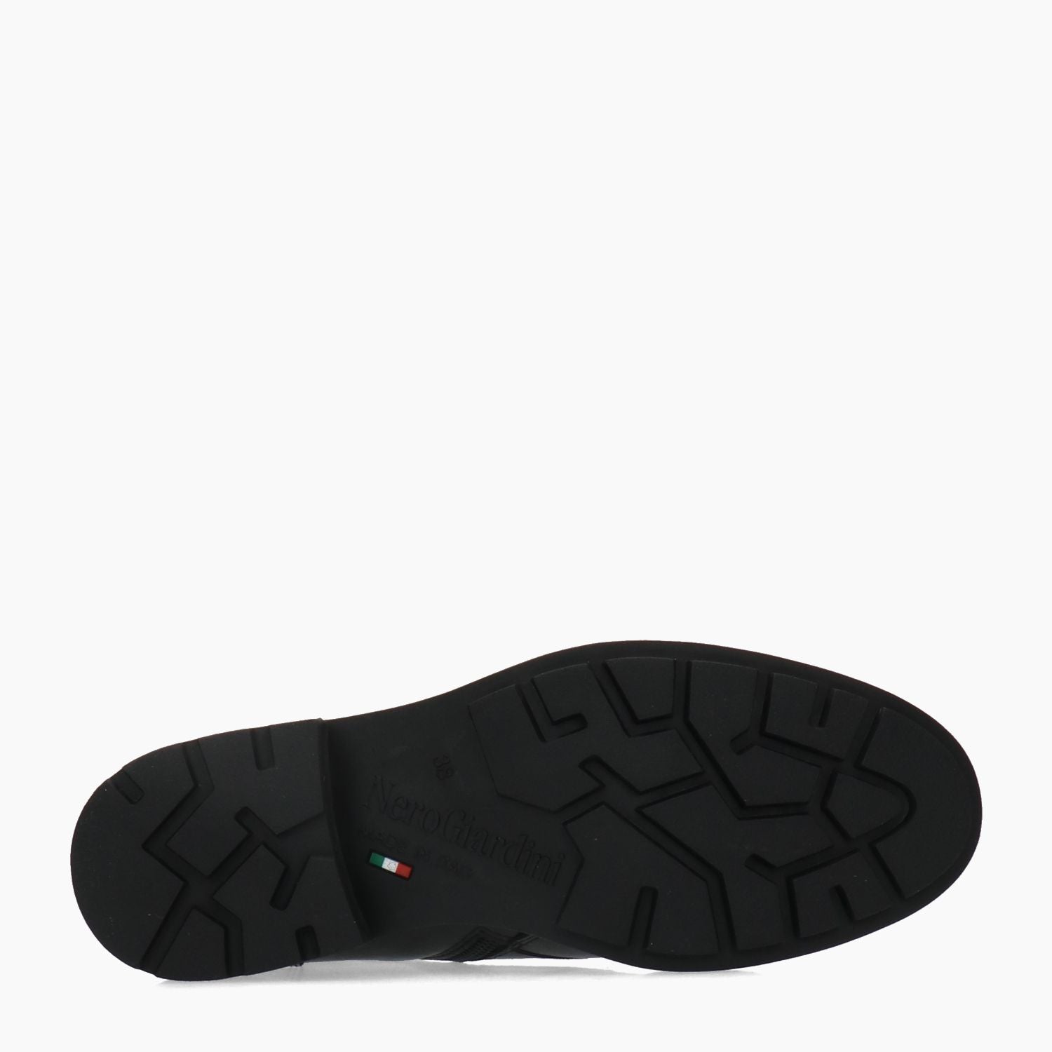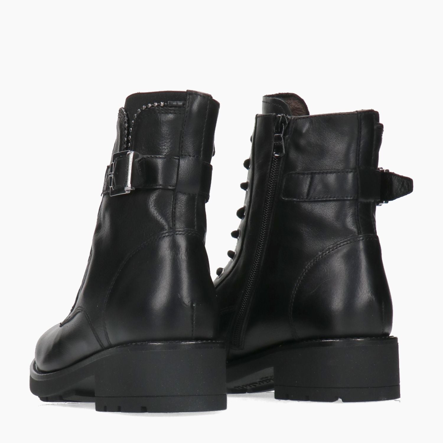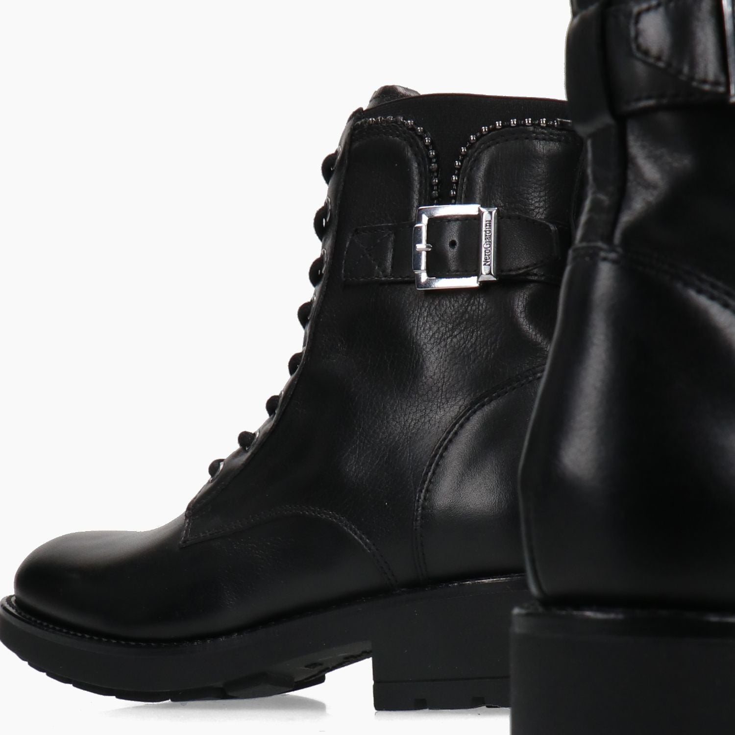 Schwarze Leder-Combat-Boots mit Riemen am Schaft und schwarzem, mit Nieten besetztem Gummieinsatz. Innenliegender Reißverschluss und verstellbare Schnürsenkel. Lederfutter mit fester Innensohle. Gummisohle mit 4 cm Absatz. Aus der Herbst-/Winterkollektion von Nero Giardini für Damen.