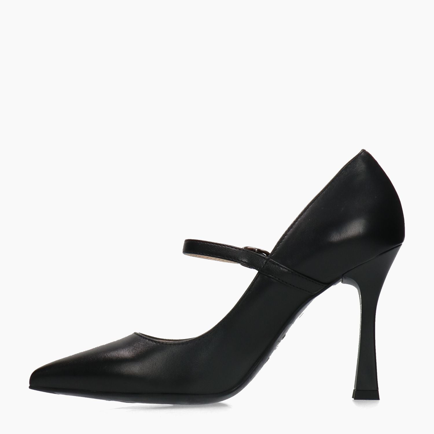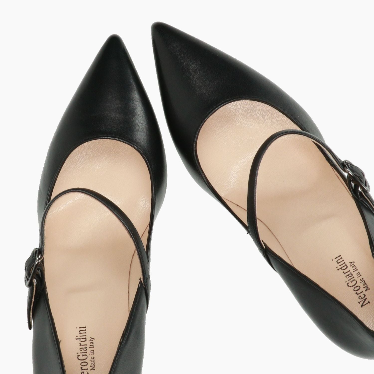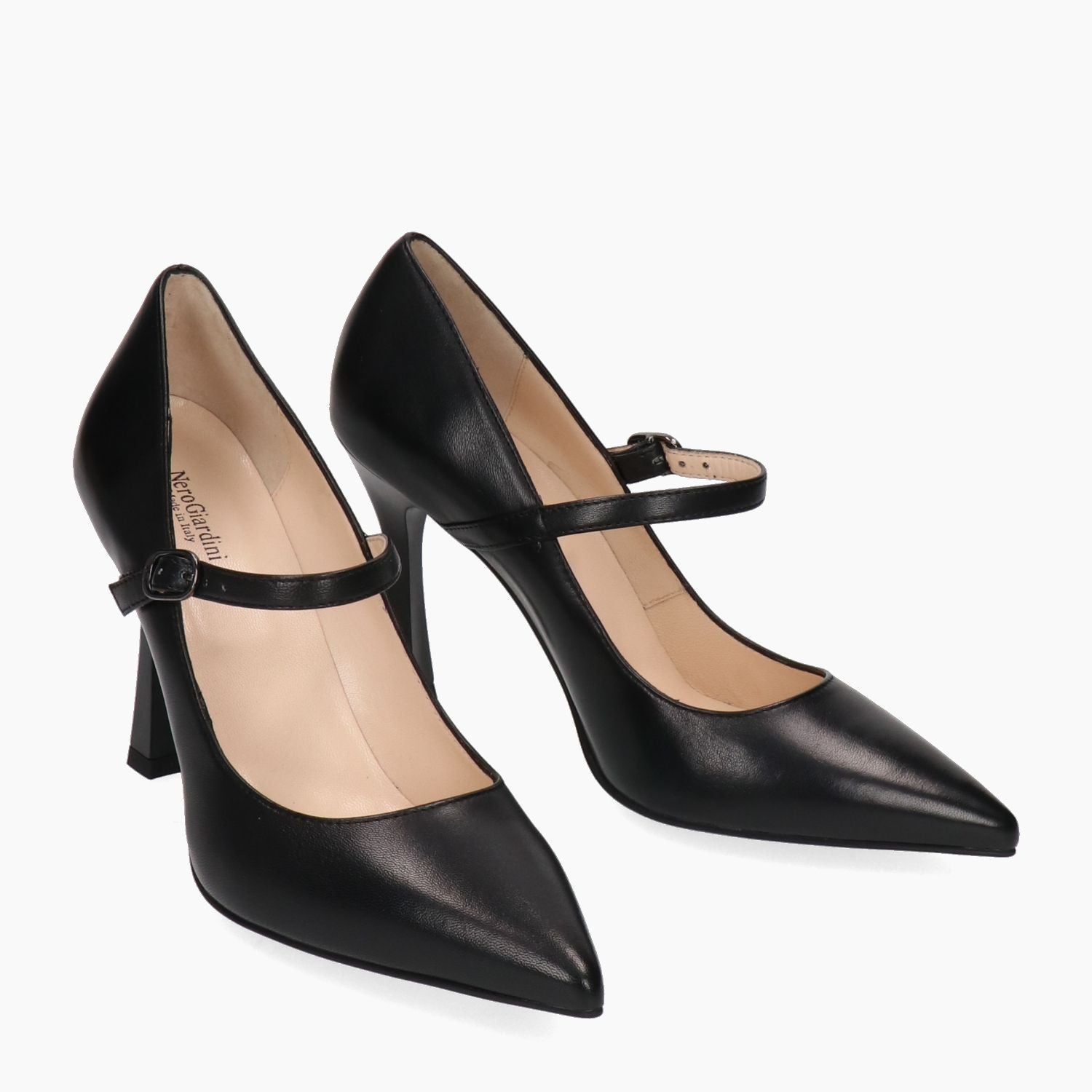 Schwarze Lederpumps. Schmale Zehenpartie. Riemenverschluss. Beiges Lederfutter. 9 cm Absatz. Gummisohle. Damenkollektion Nero Giardini.