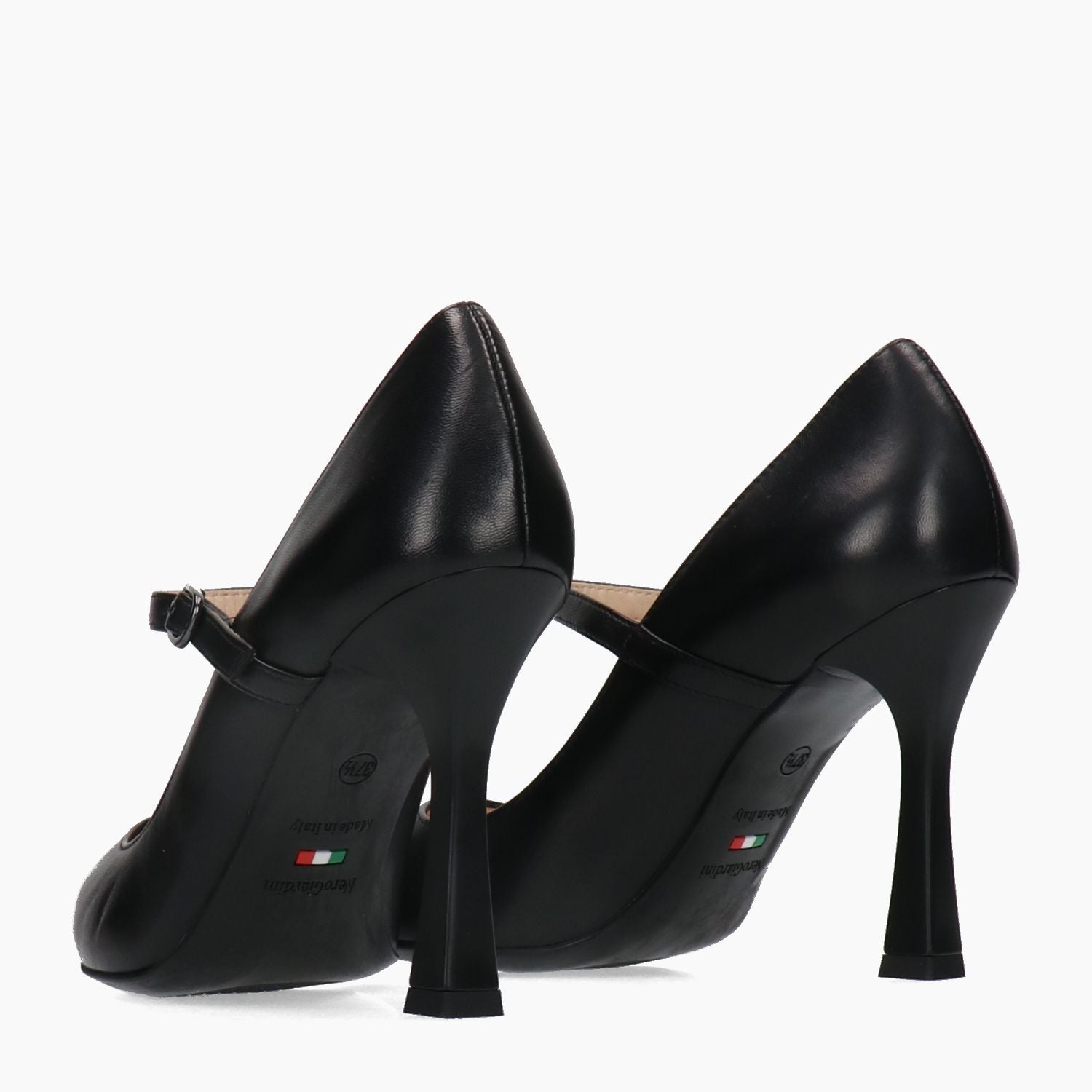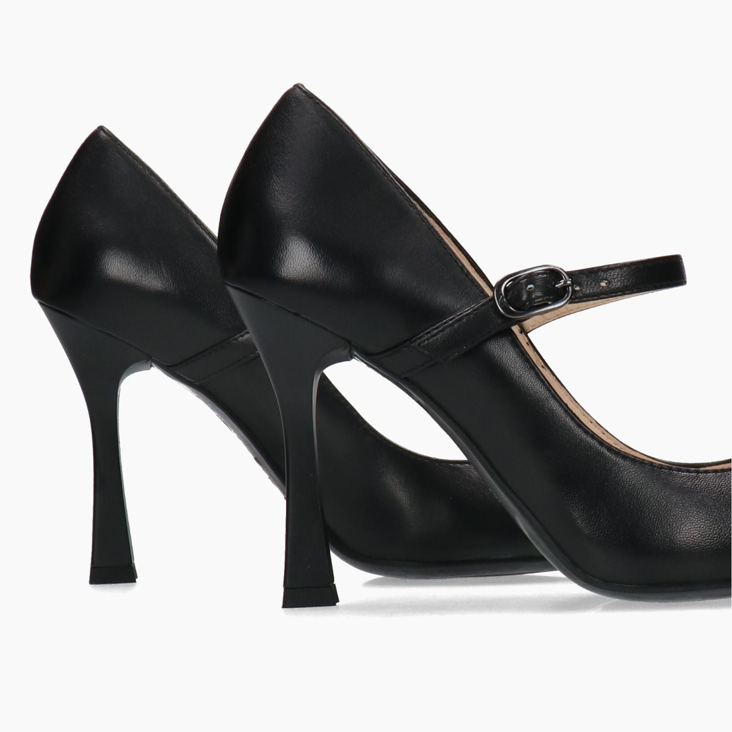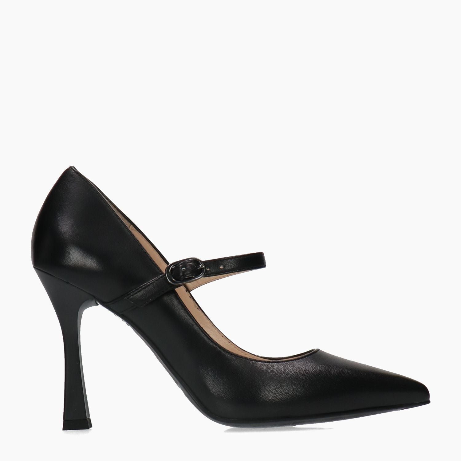Schwarze Lederpumps. Schmale Zehenpartie. Riemenverschluss. Beiges Lederfutter. 9 cm Absatz. Gummisohle. Damenkollektion Nero Giardini.