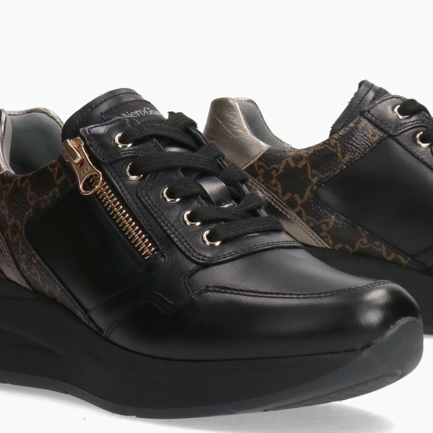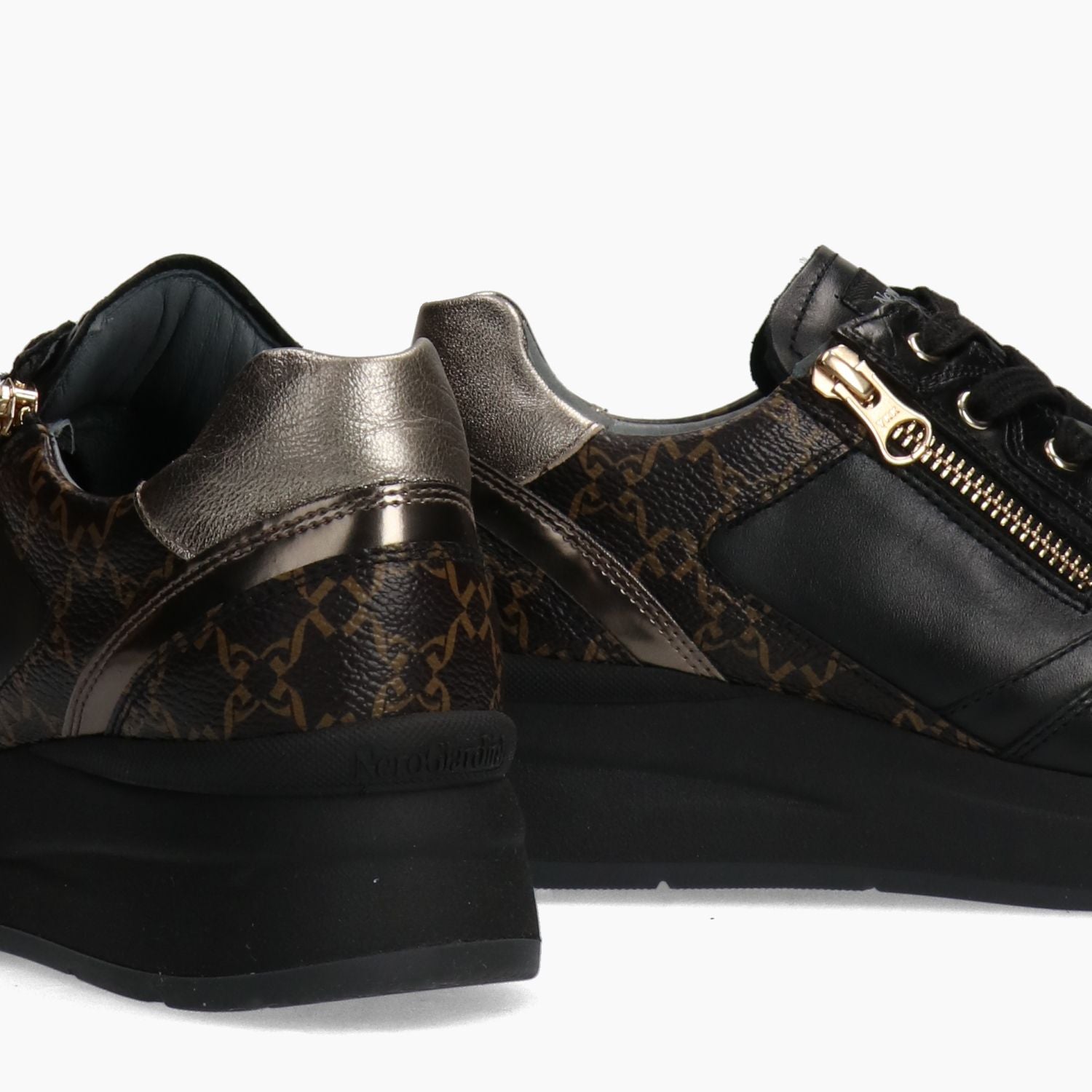 Schwarzer Ledersneaker. Logo-besetzter Kunstlederbesatz. Fersenlasche aus bronzefarbenem Leder. Schnürverschluss mit goldfarbenem Seitenreißverschluss. Lederfutter mit herausnehmbarer Innensohle. Gummisohle mit 4 cm hohem Keilabsatz. Aus der Herbst-/Winterkollektion von Nero Giardini für Damen.