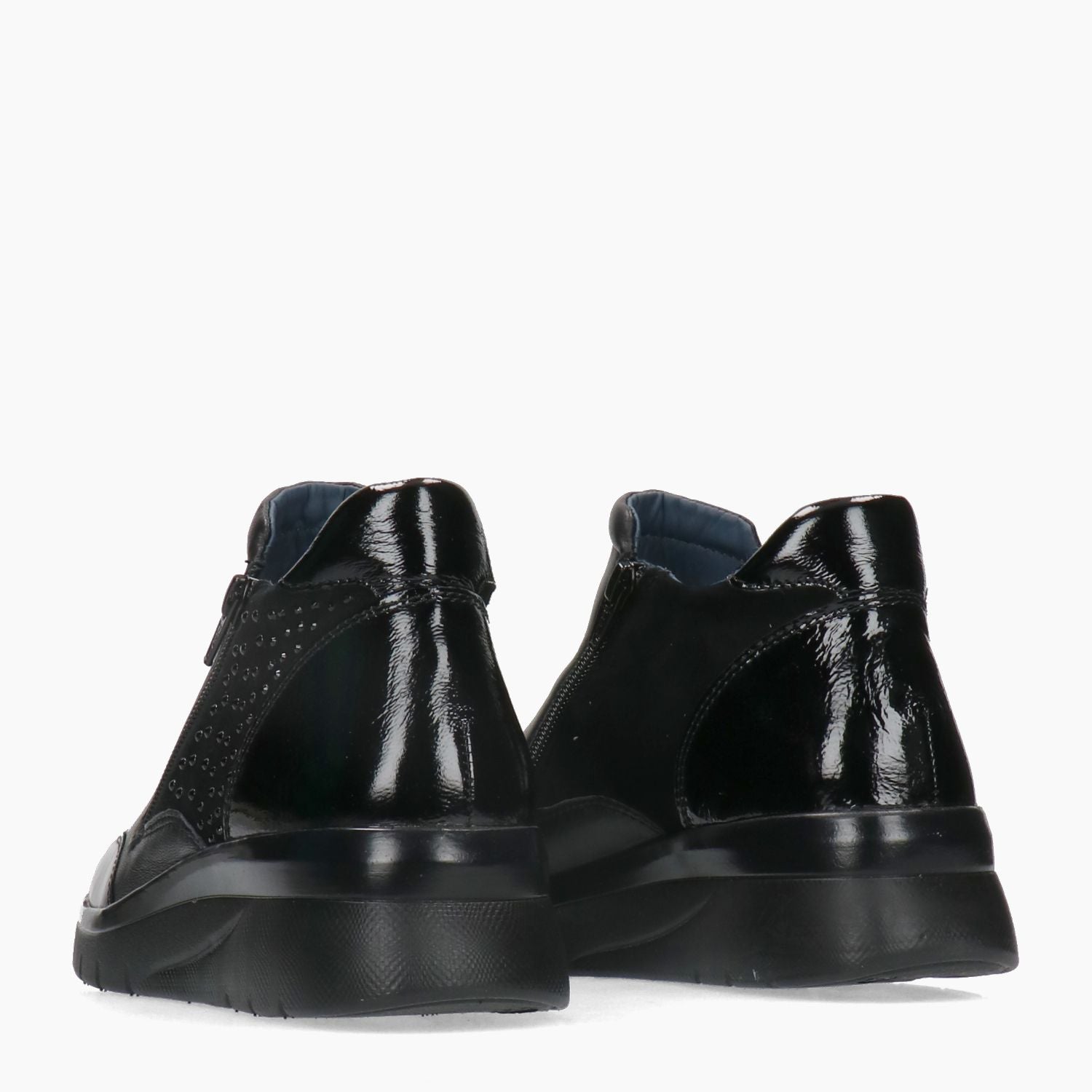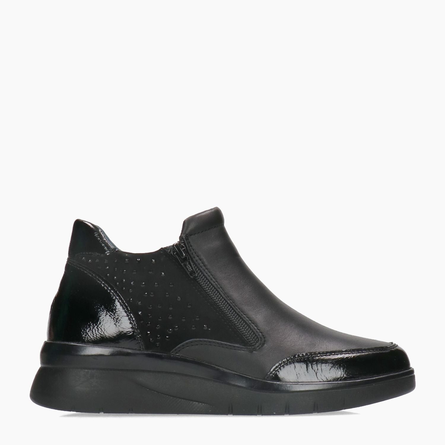 Melluso Stiefelette mit schwarzem Leder-Obermaterial und Lacklederbesatz. Schwarze Strasssteine an der Seite. Textilfutter mit herausnehmbarer Innensohle. Doppelter Reißverschluss. Gummisohle mit 3 cm hohem Keilabsatz. Melluso Damen Herbst/Winter Kollektion.