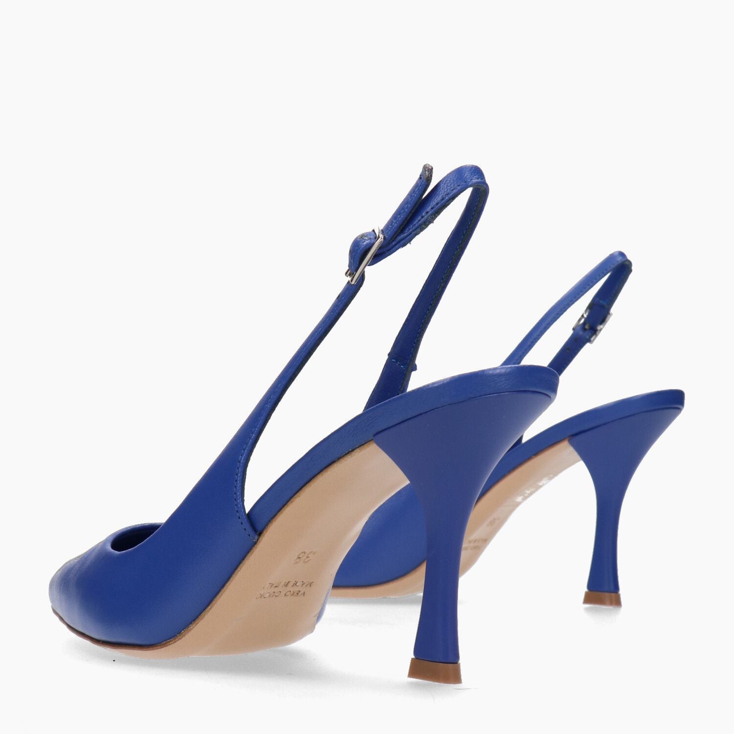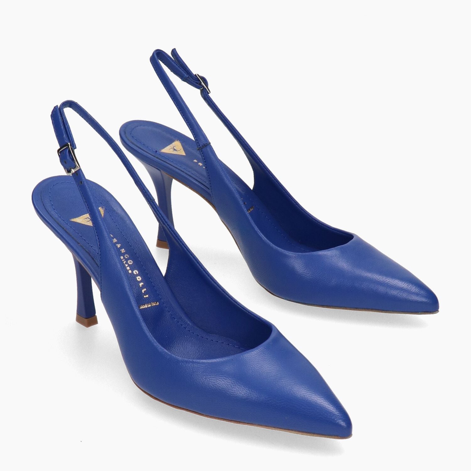 Franco Colli Slingback-Pumps mit blauem Nappa-Leder-Obermaterial. Schmale Zehenpartie. Riemen mit Schnalle hinten. Lederfutter. Ledersohle. 8,5 cm Absatz. Franco Colli Damen-Frühjahr/Sommer-Kollektion.