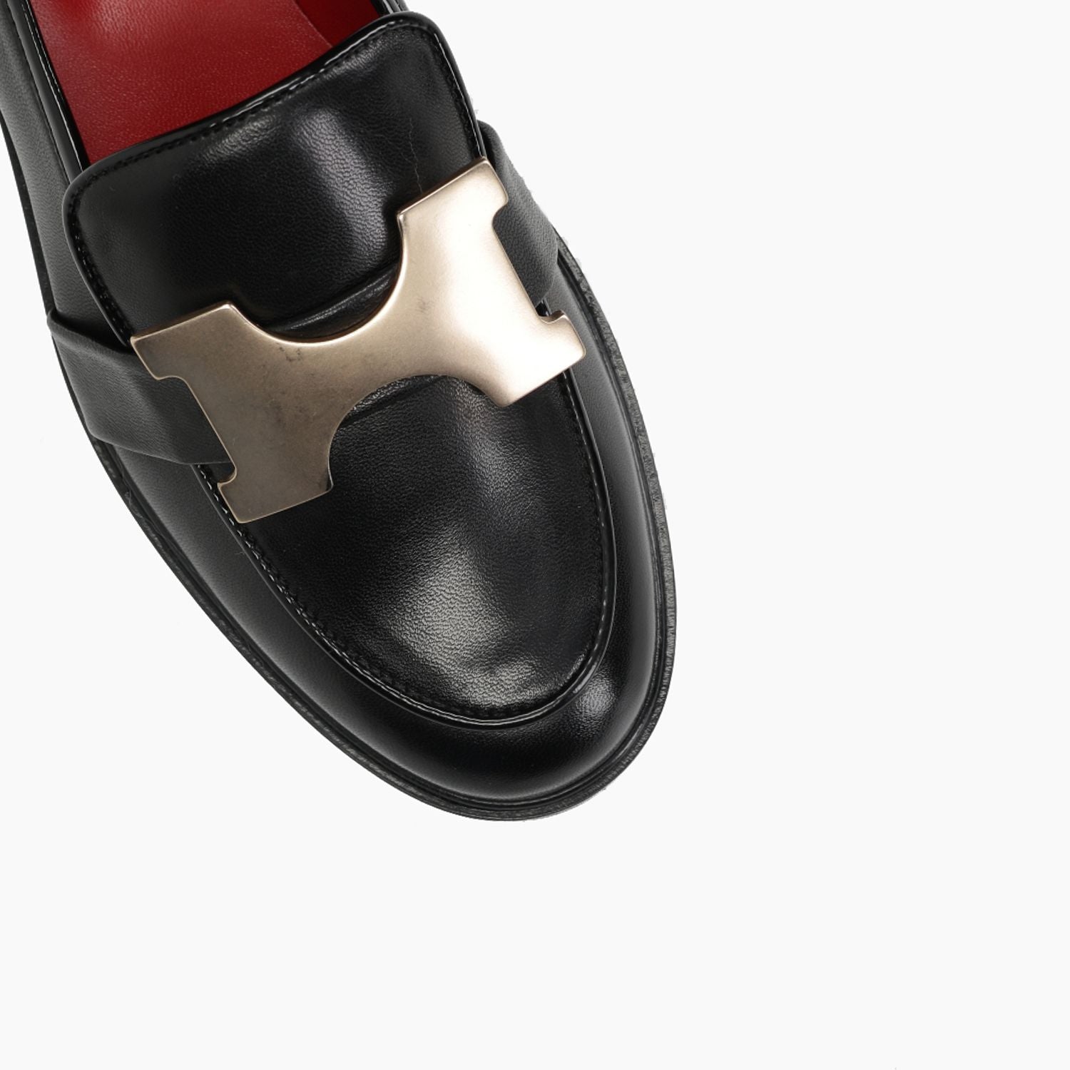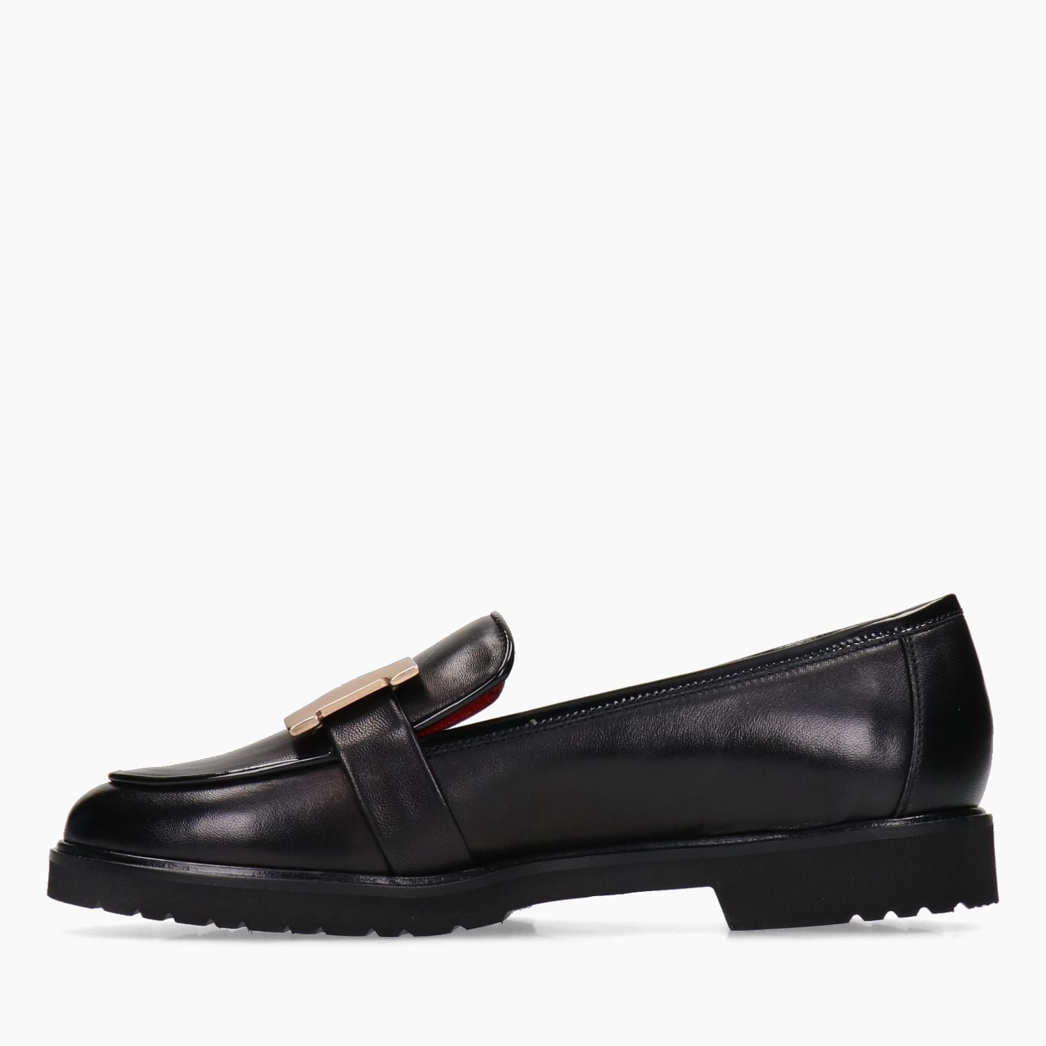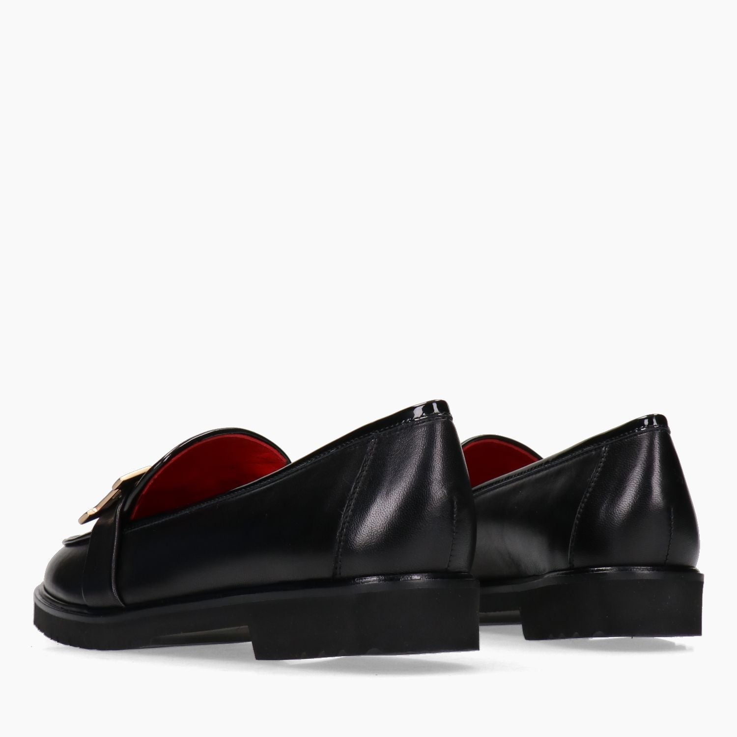 Schwarze Lederslipper, goldfarbene Metallschnalle, Gummisohle.