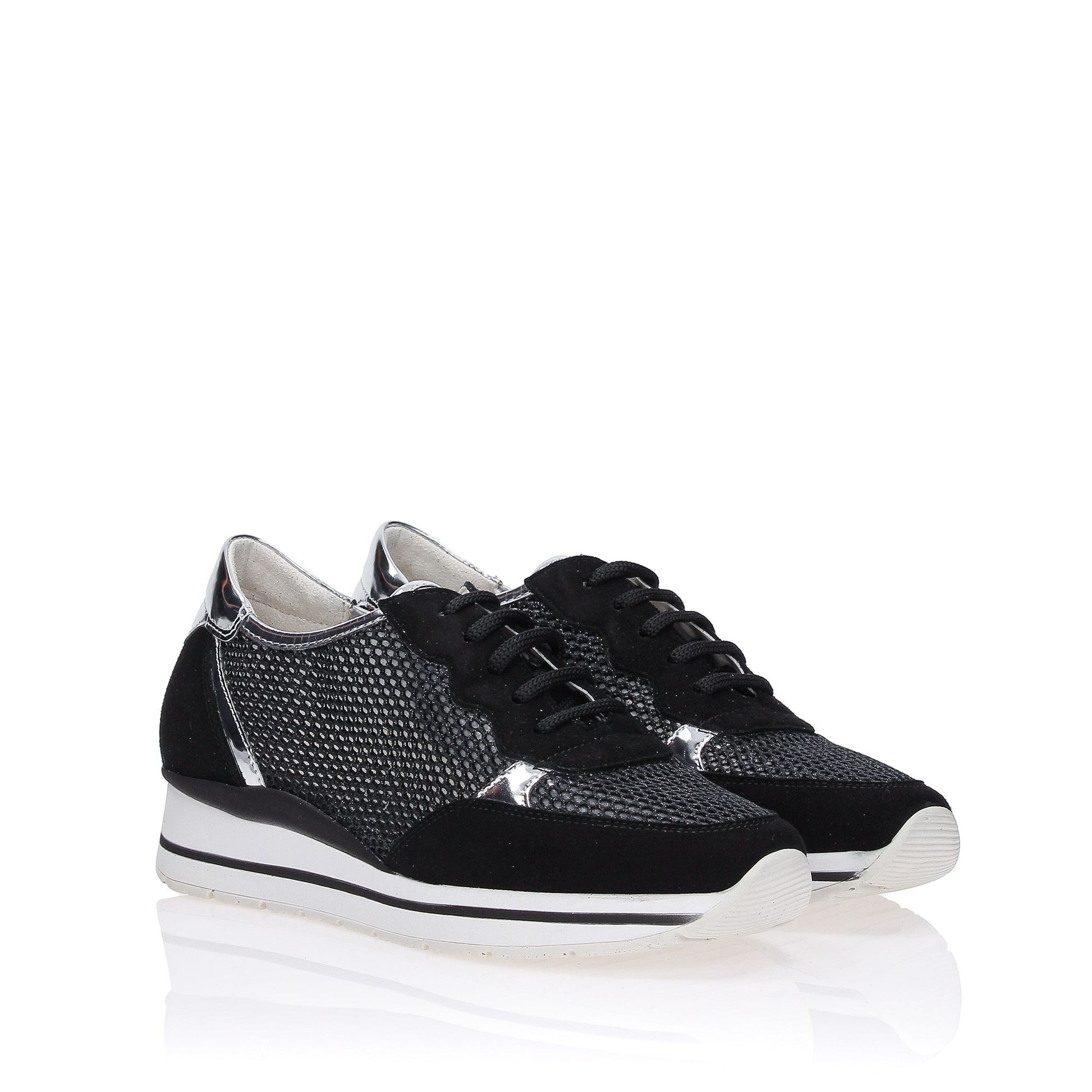 Schwarze Mesh-Sneaker mit Einsätzen aus schwarzem Wildleder, 40 mm Keilabsatz, Gummisohle.