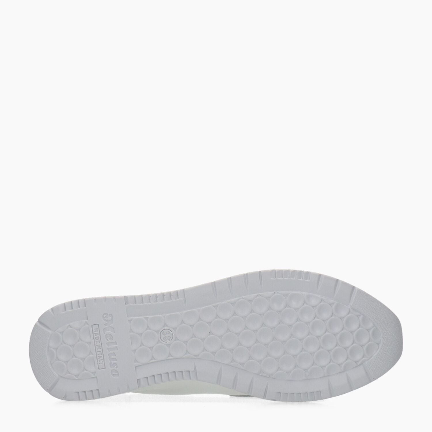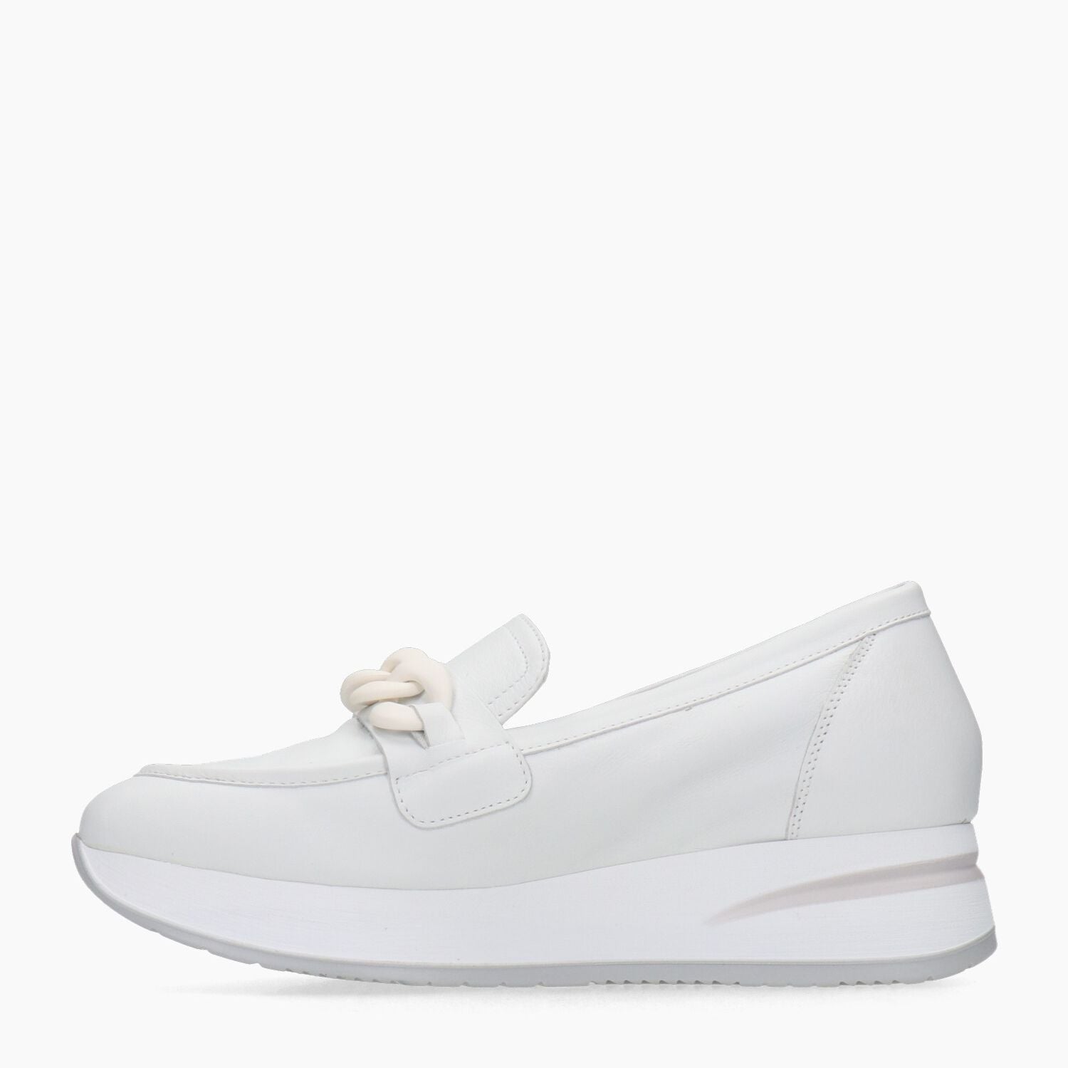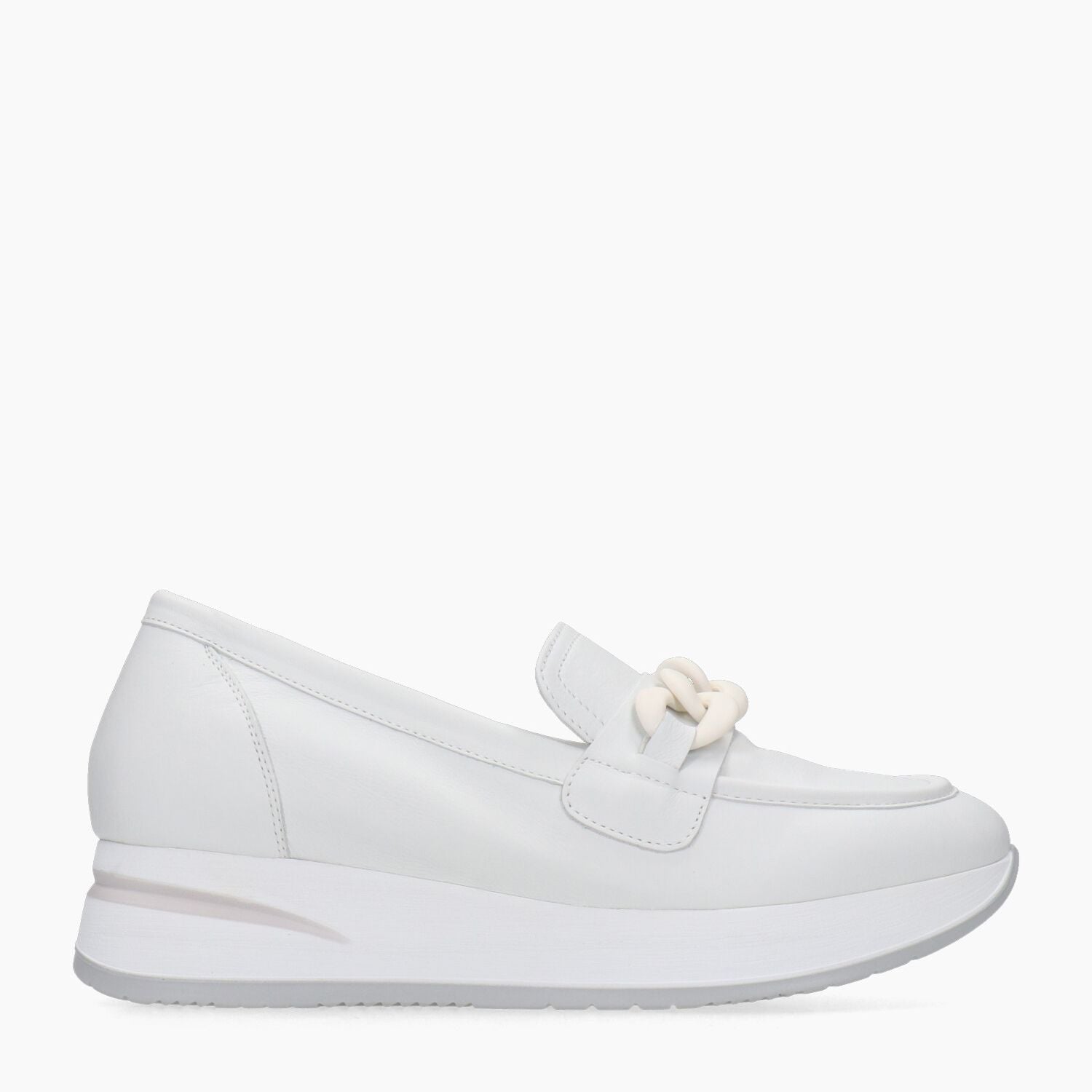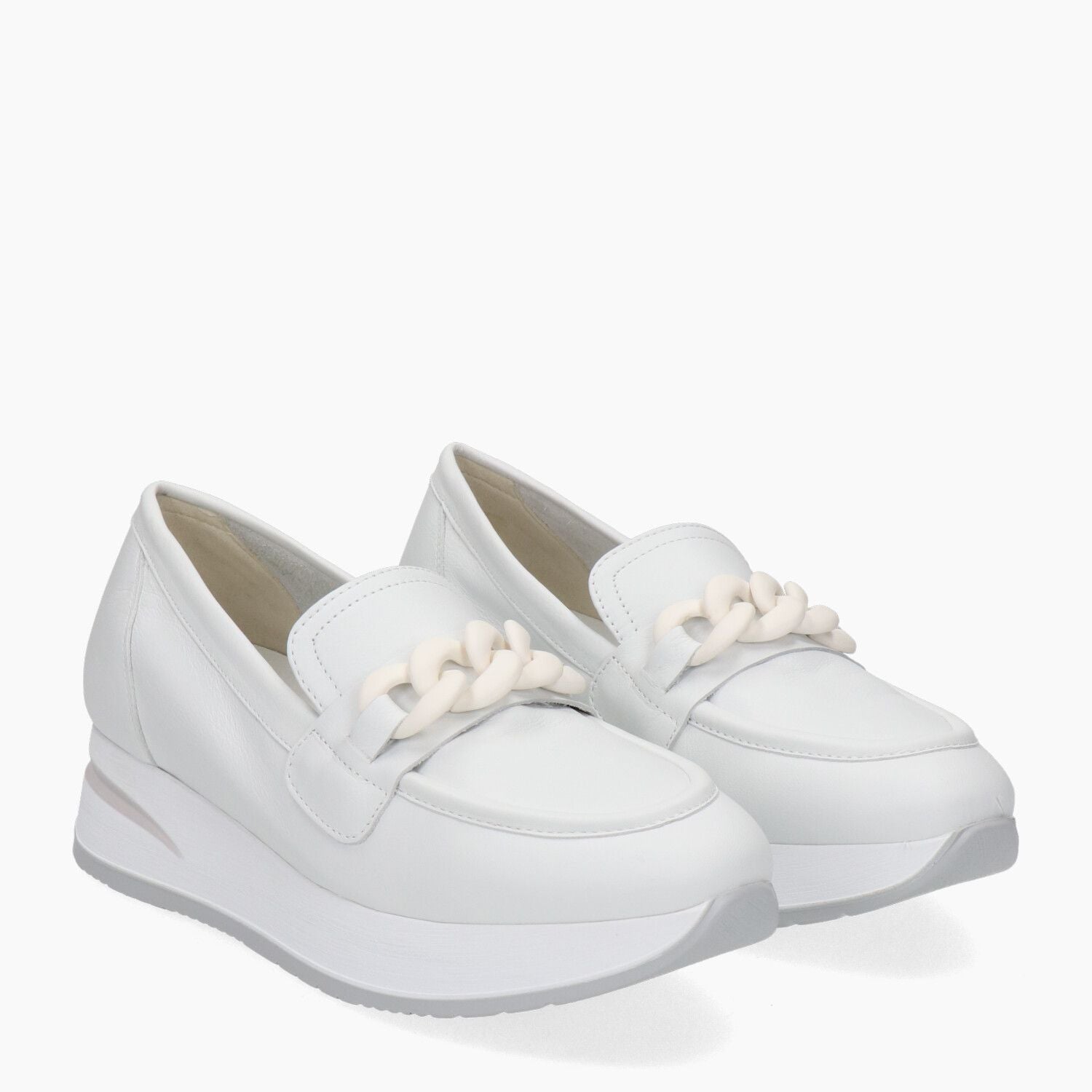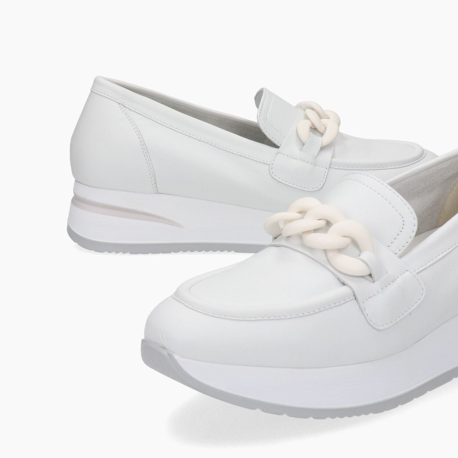 Weiße Lederslipper mit passendem Kettenverschluss und Gummisohle.