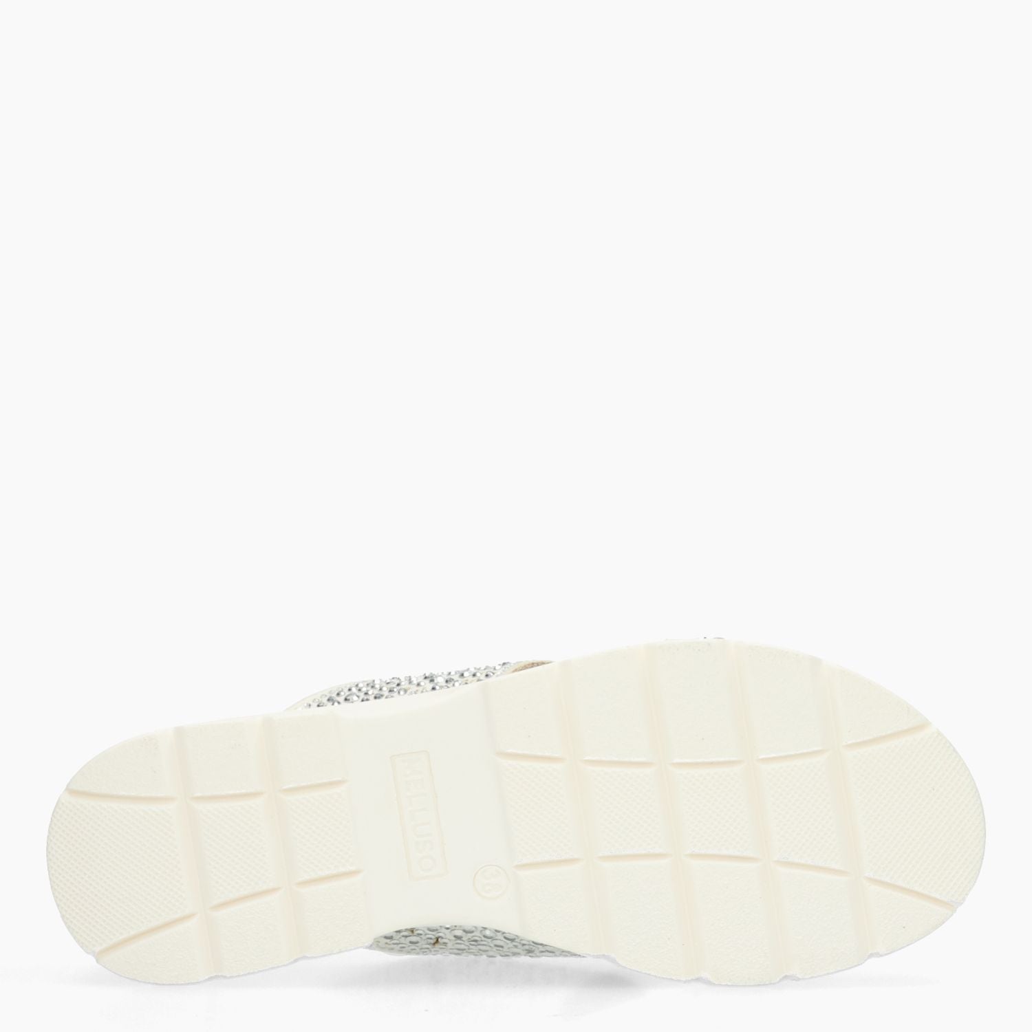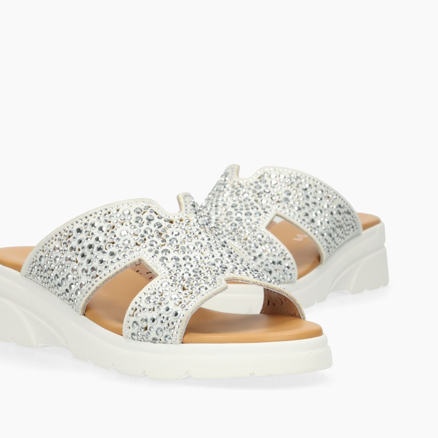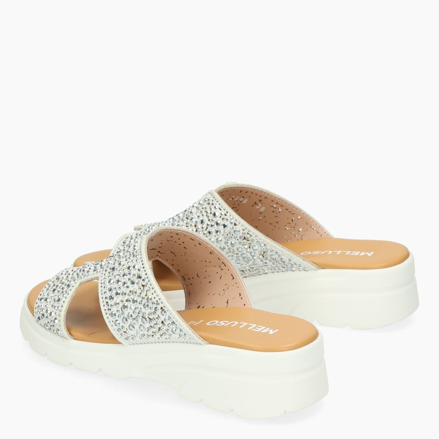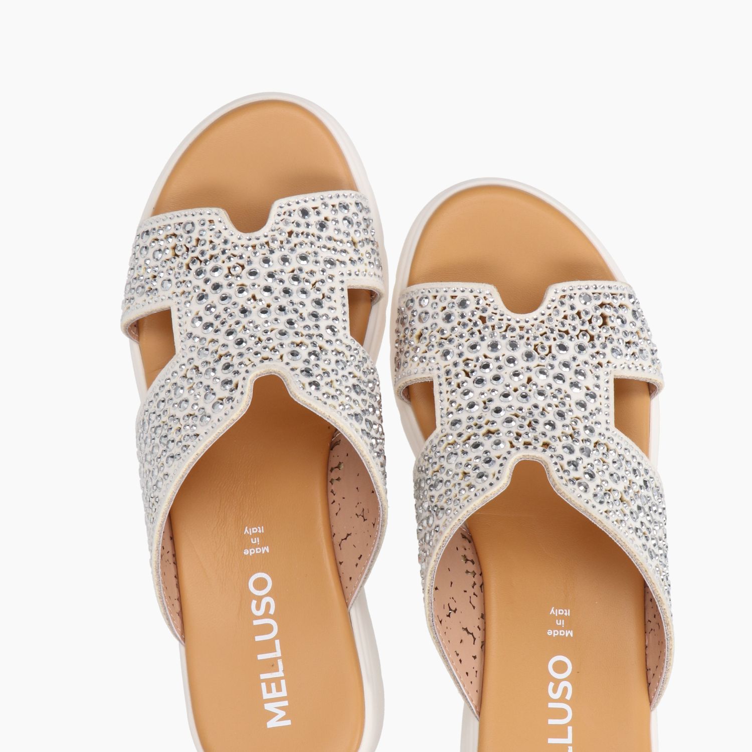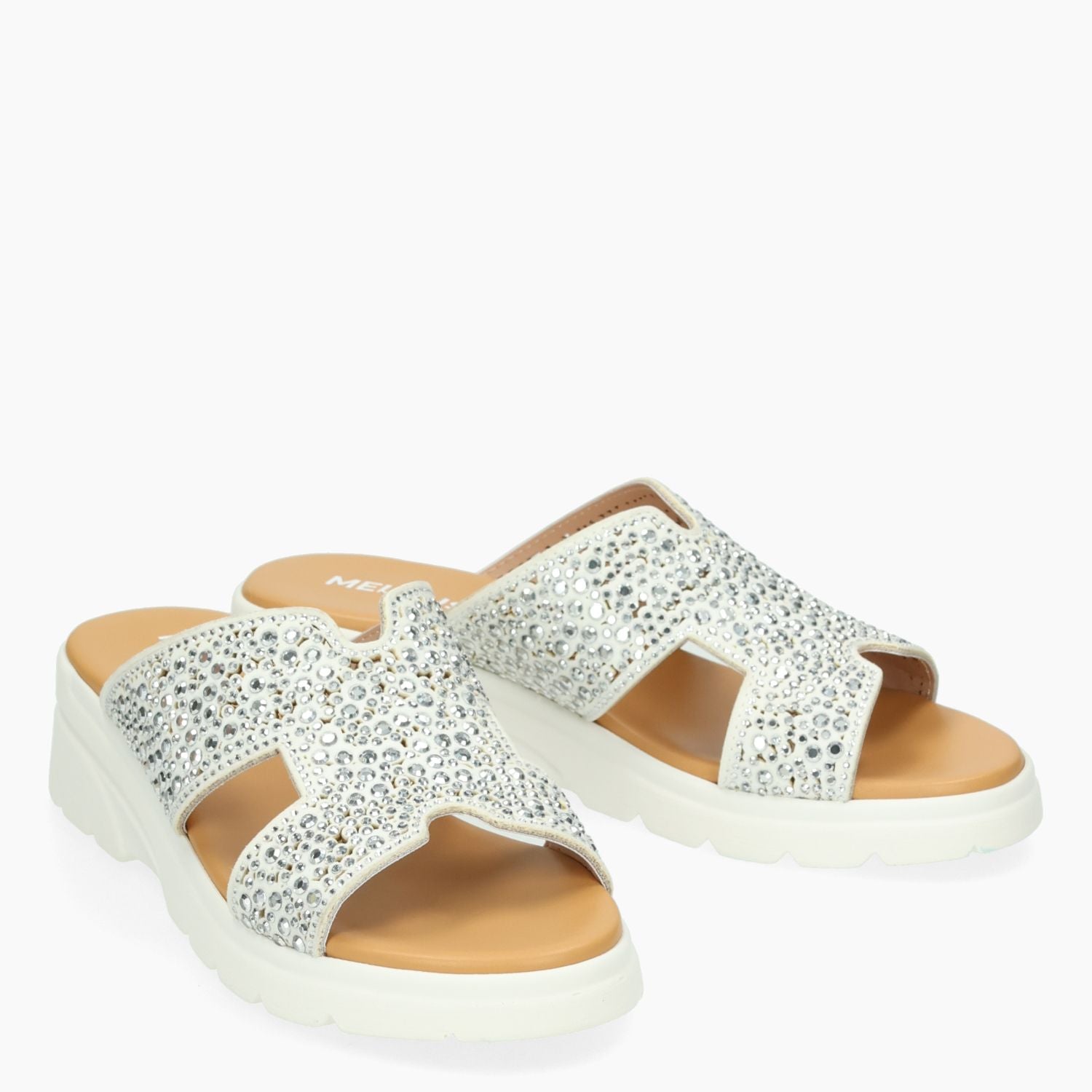 Melluso-Slipper mit lasergeschnittenem Obermaterial aus cremeweißem Kunstleder und silbernen Strasssteinen. Lederfutter. Gummisohle mit 4 cm hohem Keilabsatz. Melluso Damen-Frühjahr/Sommer-Kollektion.