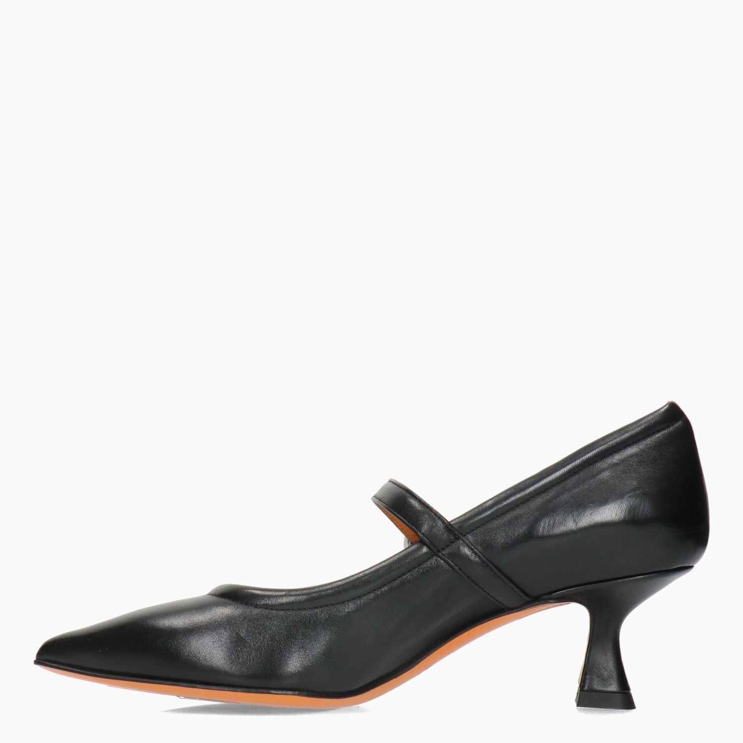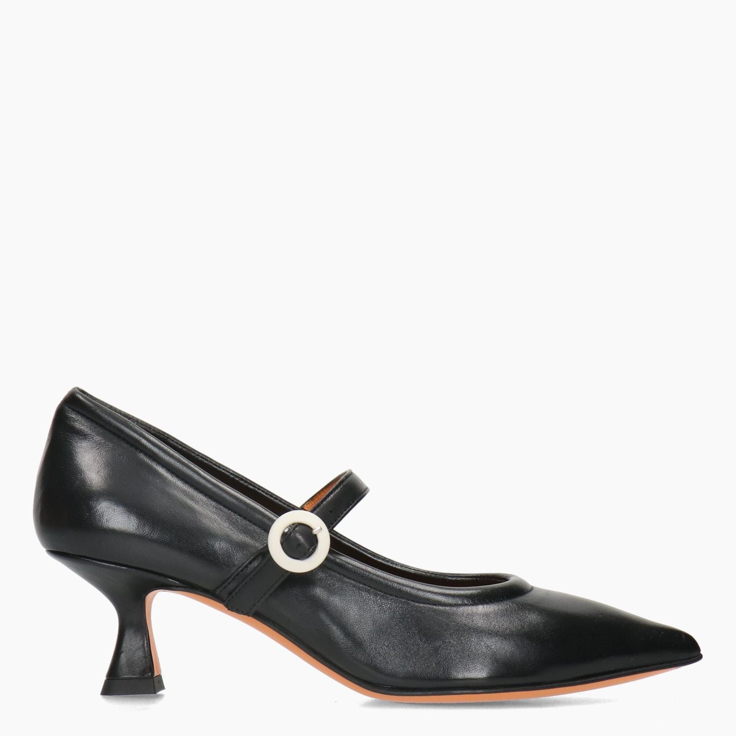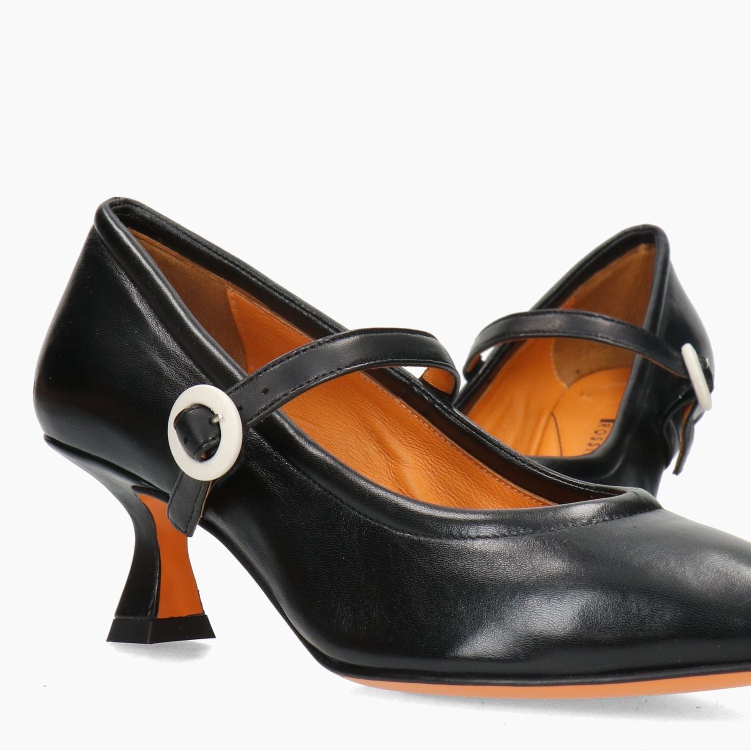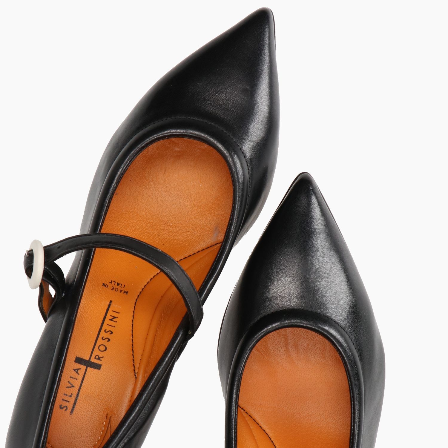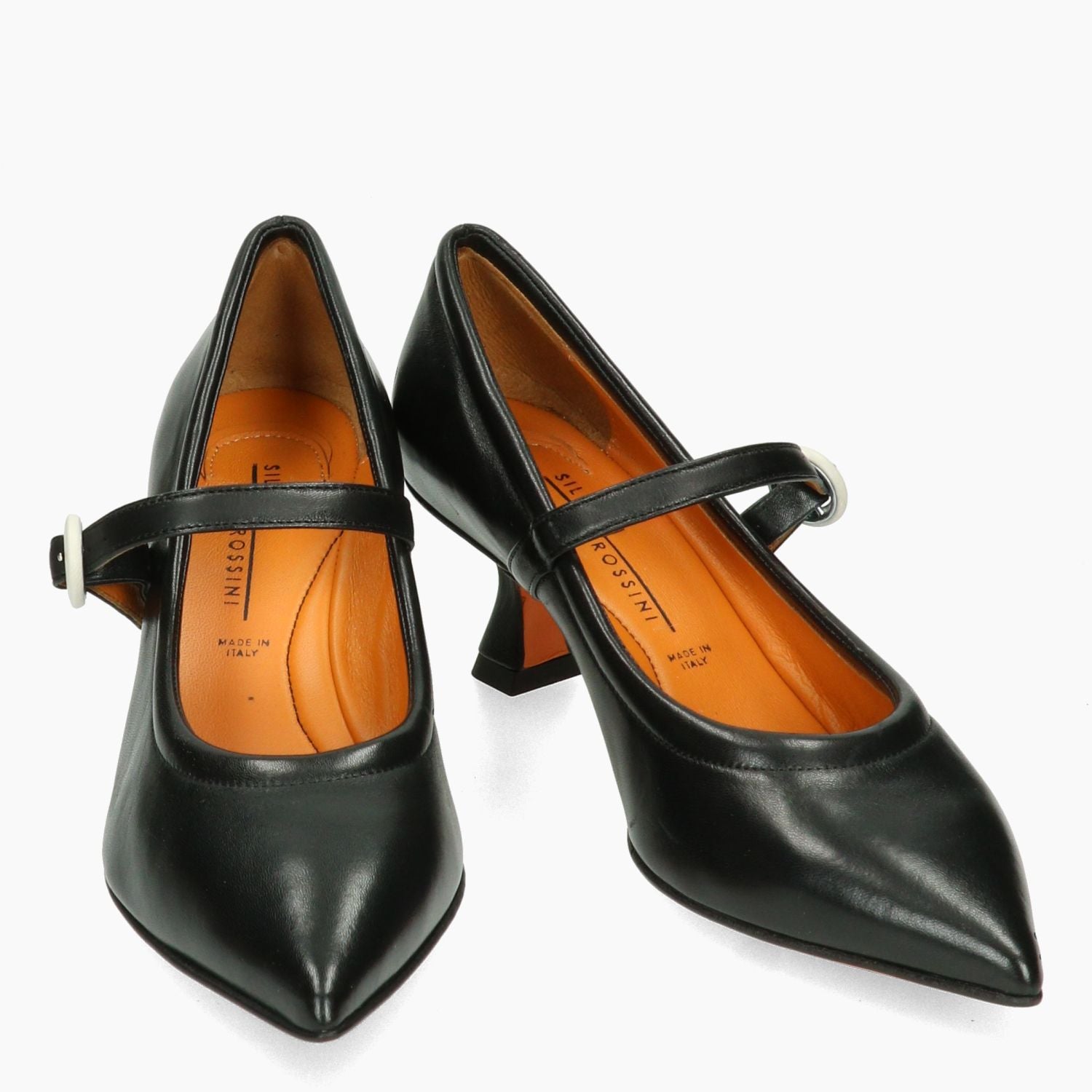 Schwarze Lederpumps mit verstellbarem Riemen. Innenfutter aus Leder im Satchel-Stil. 5 cm hoher, farblich passender, bezogener Absatz. Ledersohle mit rutschfestem Profil. Silvia Rossini Damenkollektion.
