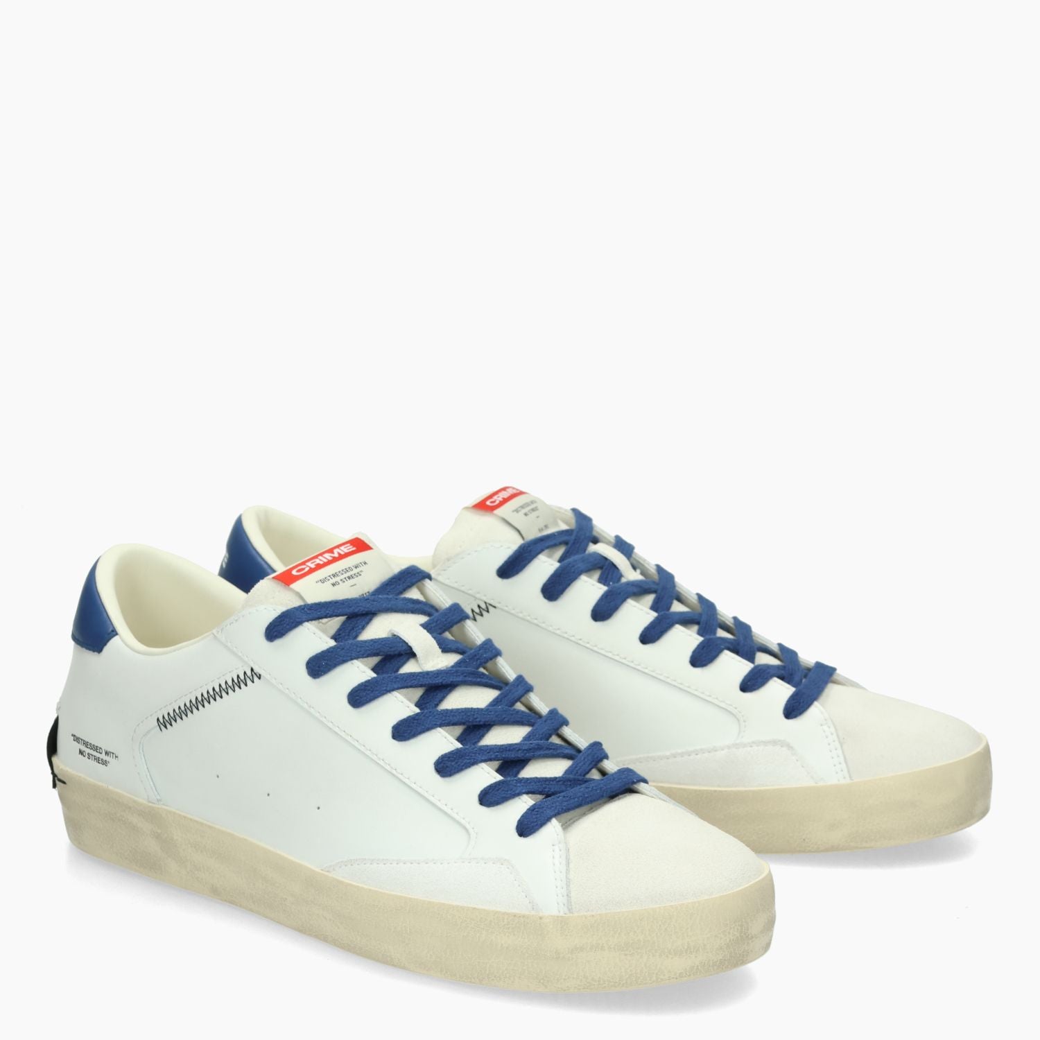 Crime London Sneaker mit weißem Leder-Obermaterial. Blaue Baumwollschnürsenkel mit zusätzlichen weißen Baumwollschnürsenkeln. Logo-Zunge. Blaue Leder-Fersenlasche mit Logo. Futter aus Textil und Leder. Gummisohle. Crime London Herrenkollektion.
