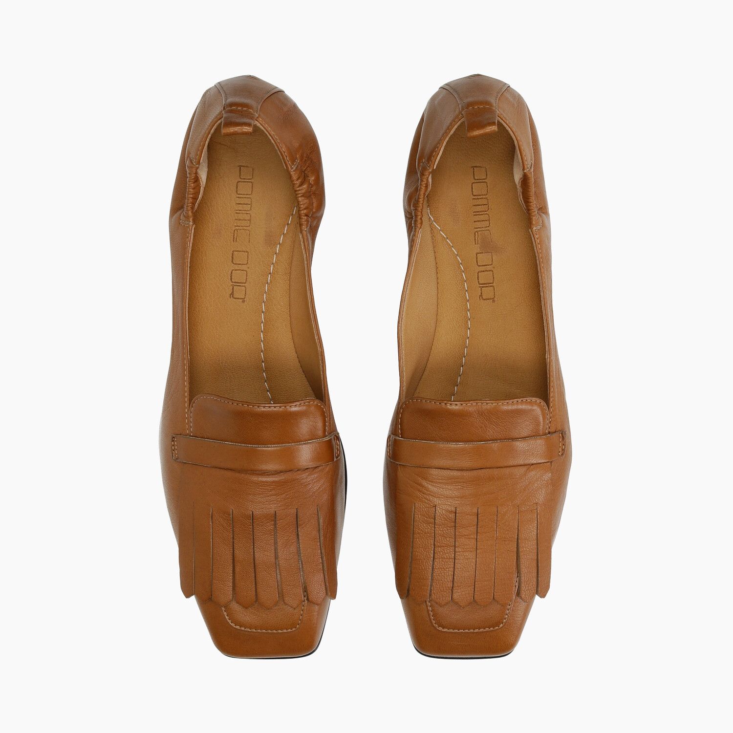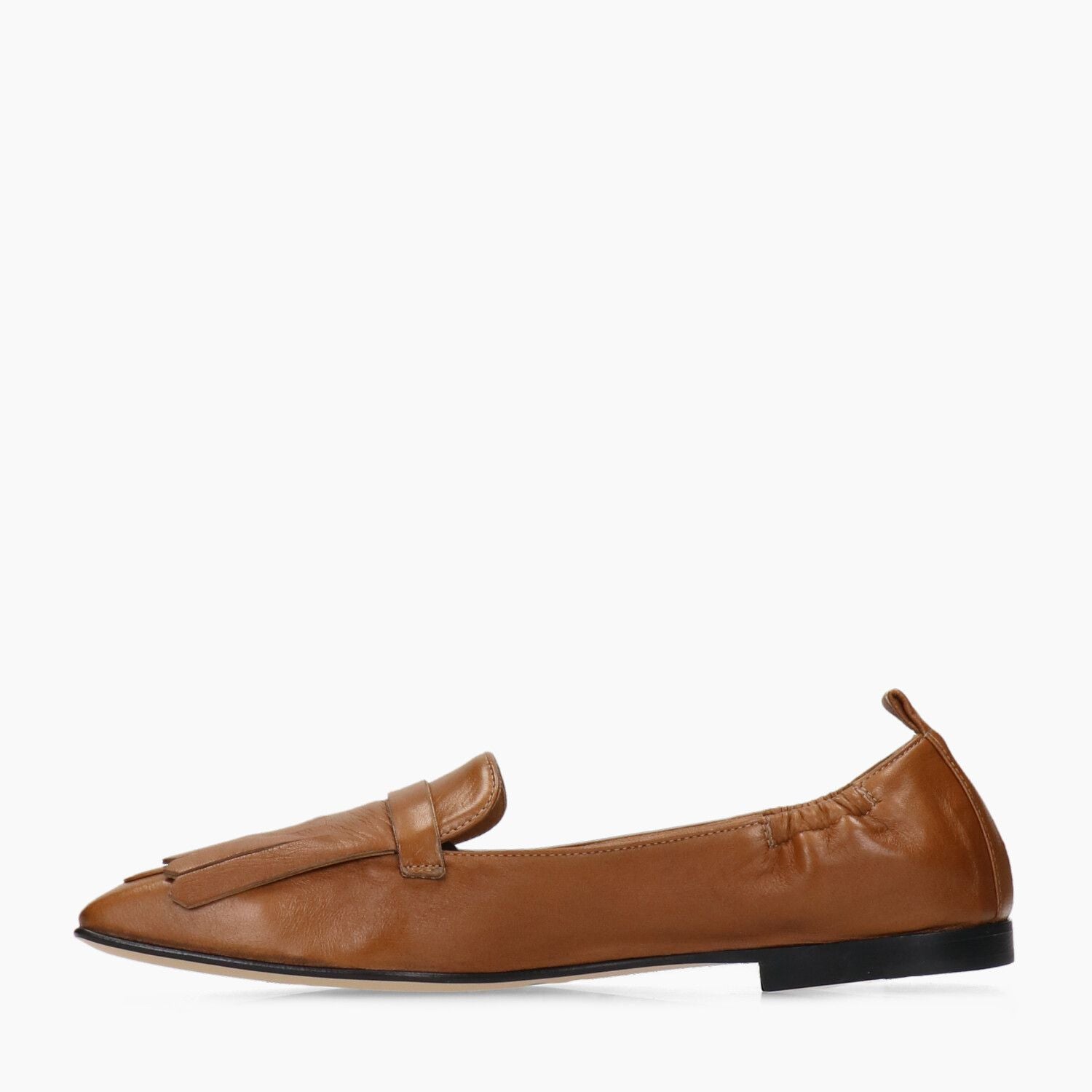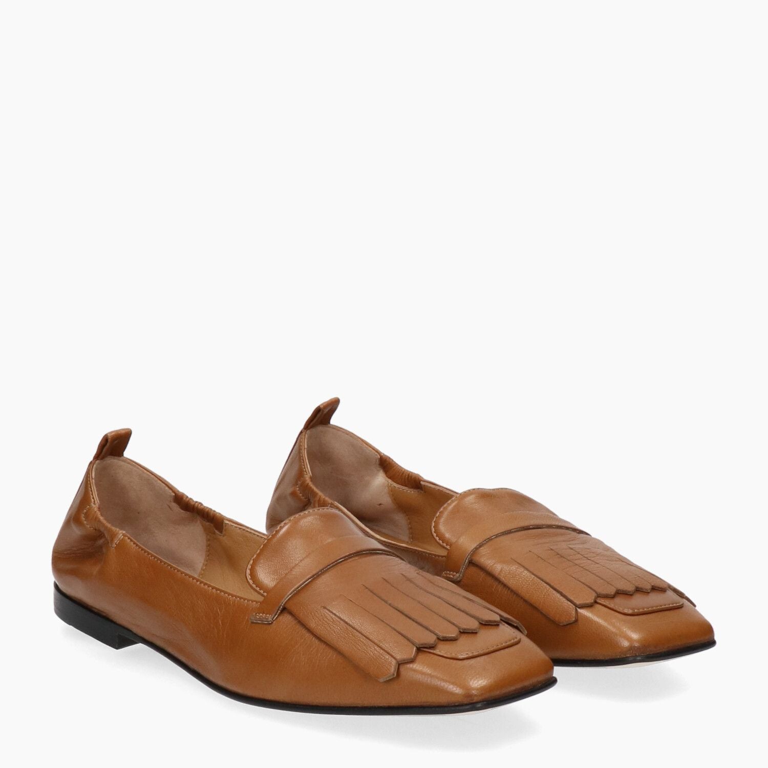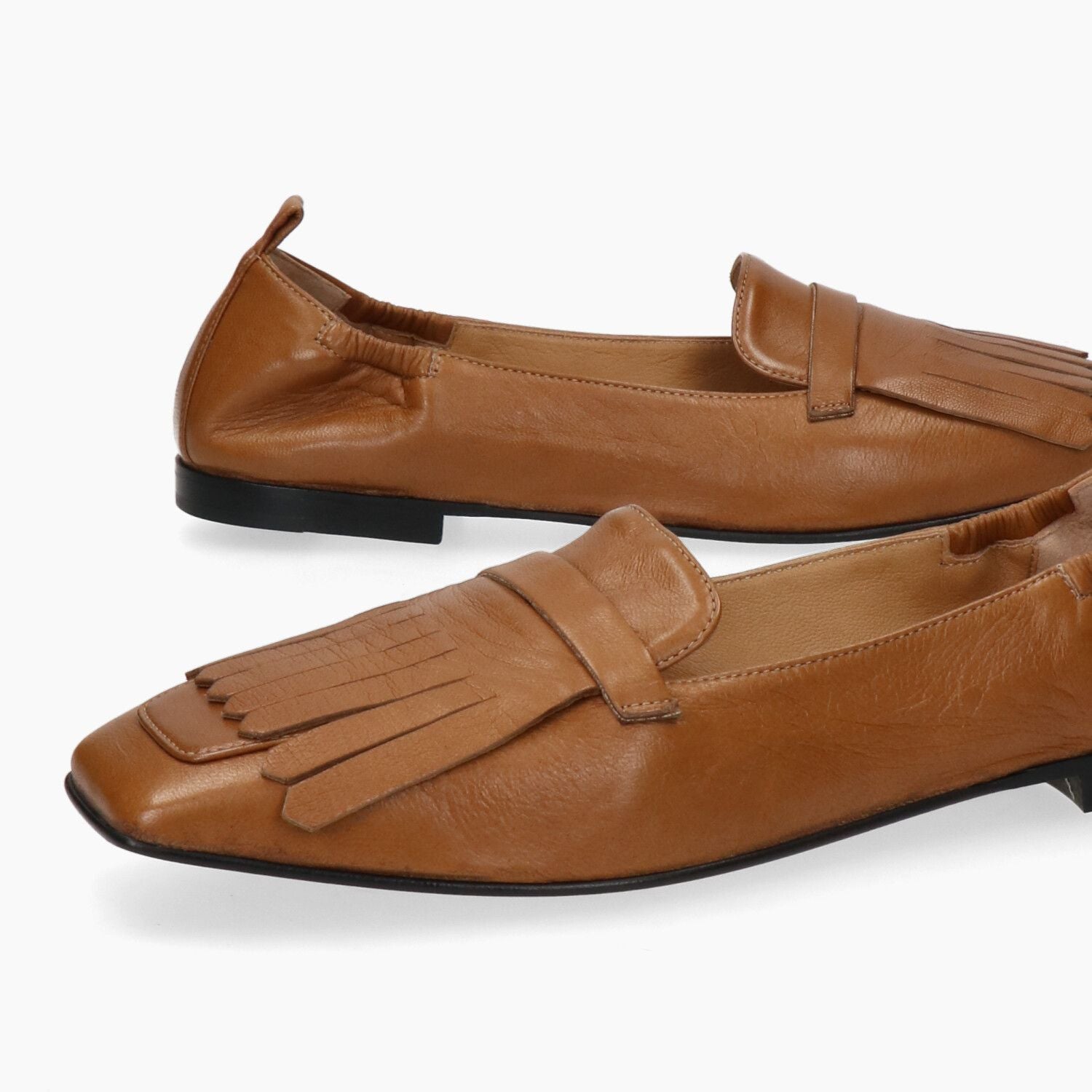 Mokassins aus hellbraunem Leder mit Fransen am Riemen, hochwertige Verarbeitung, Ledersohle mit Gummieinsatz.