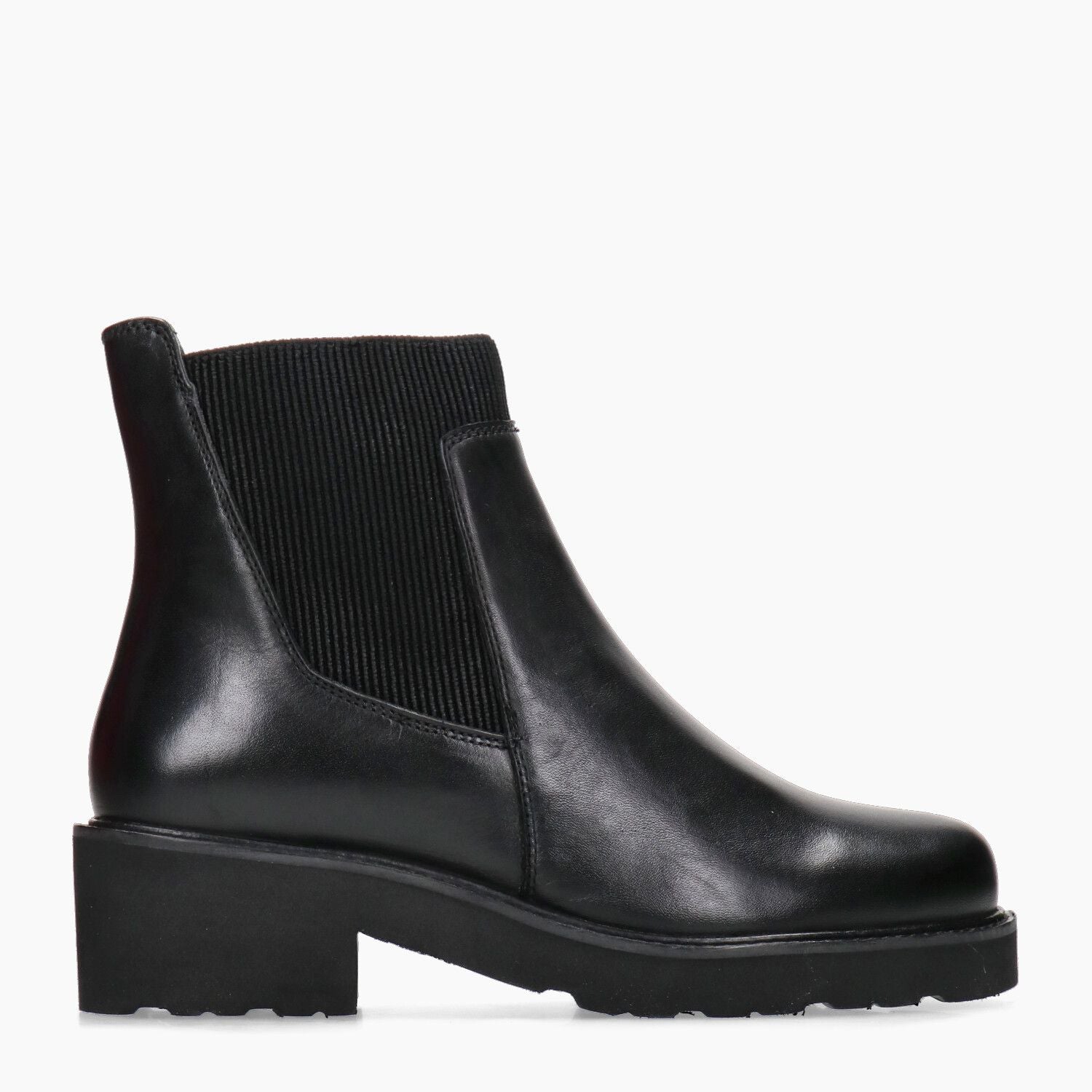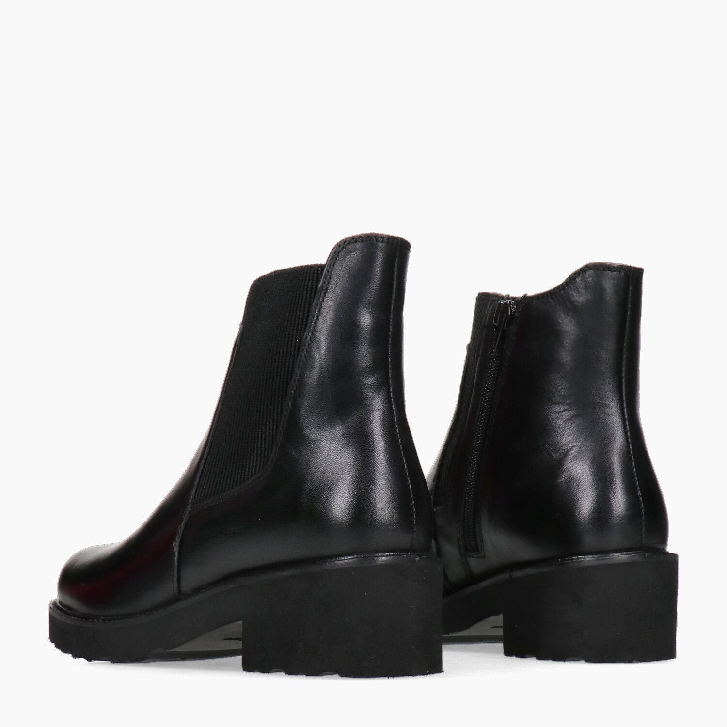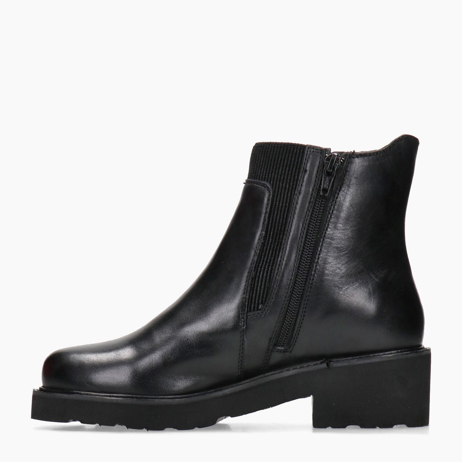 Schwarze Stiefeletten aus Leder und Textil. Innenfutter aus Leder und Textil. Feste Lederinnensohle. Gerippter Gummizug an der Seite und innenliegender Reißverschluss. Mikroporöse Gummisohle mit 4 cm Absatz. Melluso Damen Herbst/Winter Kollektion.