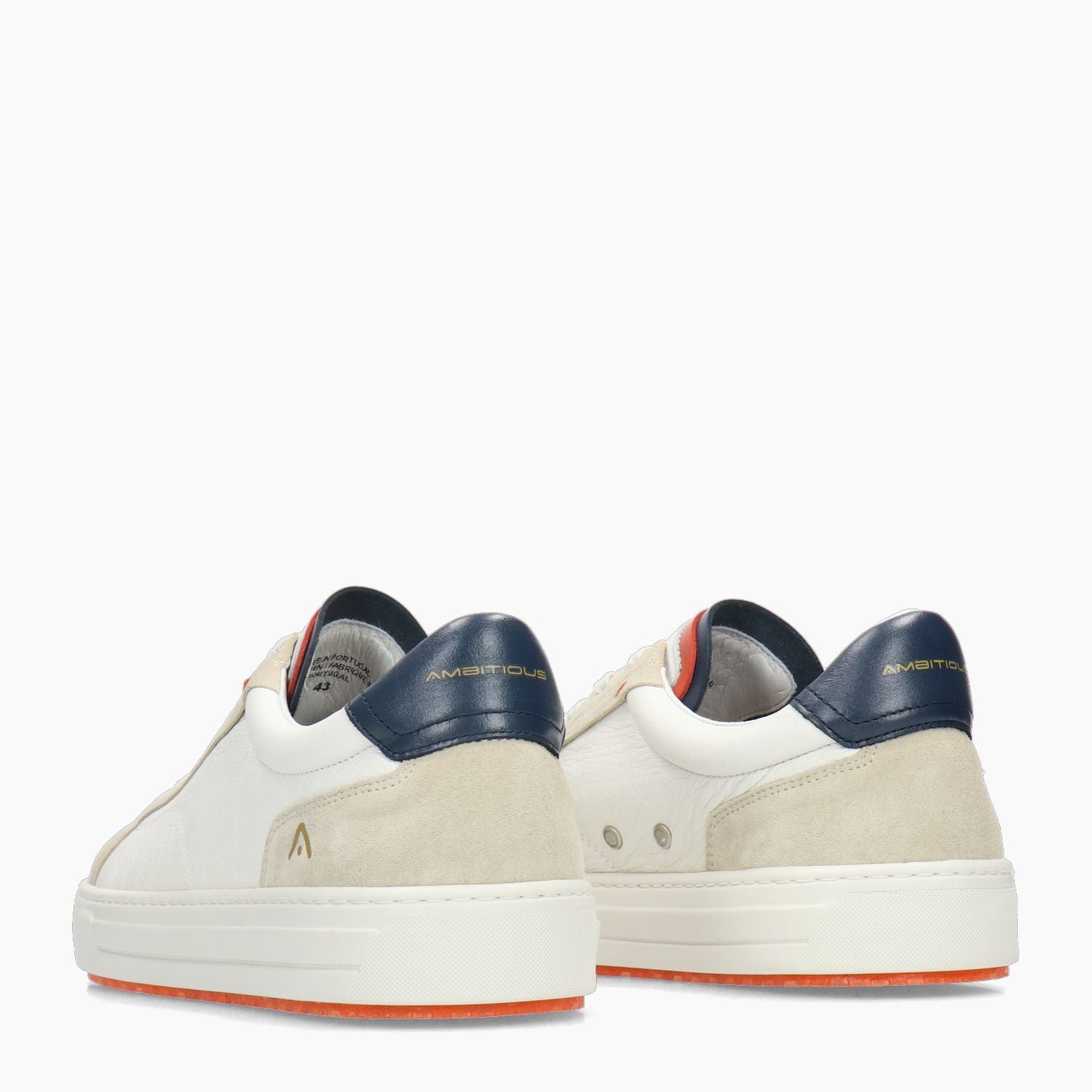 Weiße Ledersneaker mit beigen Wildledereinsätzen. Leder- und Textilfutter mit herausnehmbarer Innensohle. Beige Baumwollschnürsenkel als Ersatz. 3 cm hohe Gummisohle. Herrenkollektion Ambitious Frühjahr/Sommer.