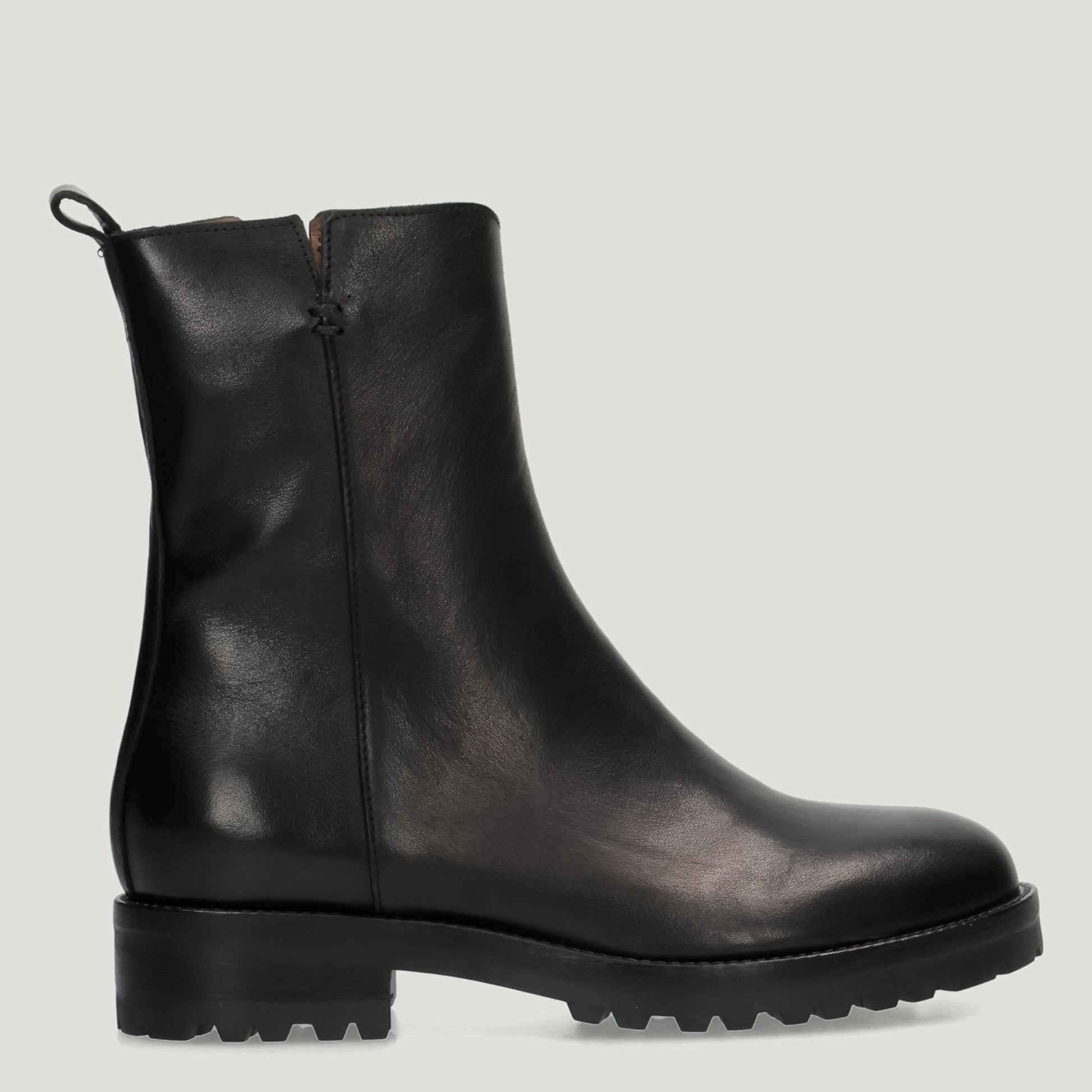 Schwarze Leder-Ankle-Boots mit kleinem Schlitz am Schaft. Seitlicher Reißverschluss. Lederfutter mit fester Innensohle. 3,5 cm hohe Gummisohle. Duccio Del Duca Damen-Herbst-/Winterkollektion.