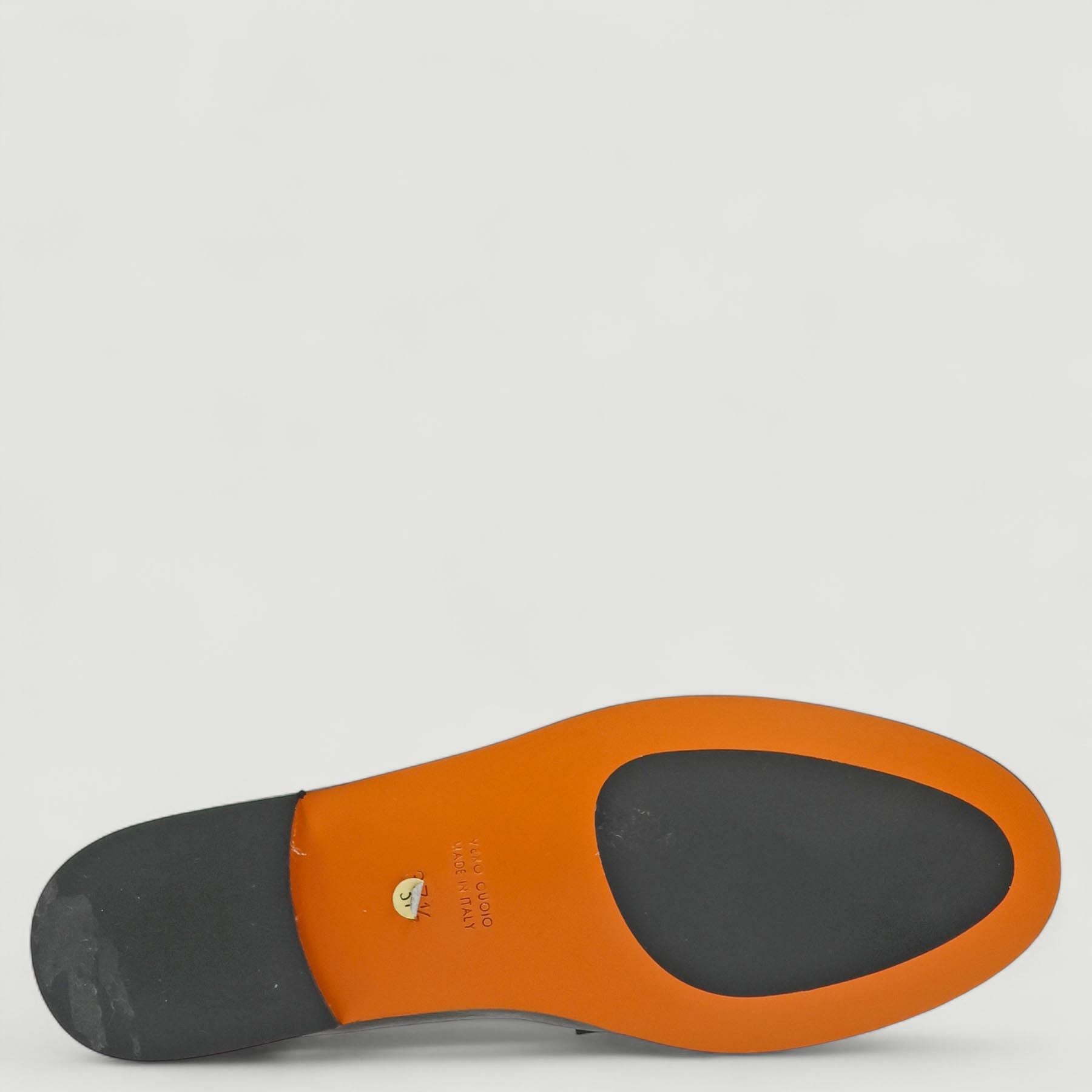 Schwarzer Lederslipper mit Riemen. Lederfutter. Ledersohle mit rutschfester Gummieinlage. Zum Hineinschlüpfen. 1,5 cm Absatz. Silvia Rossini Damenkollektion.