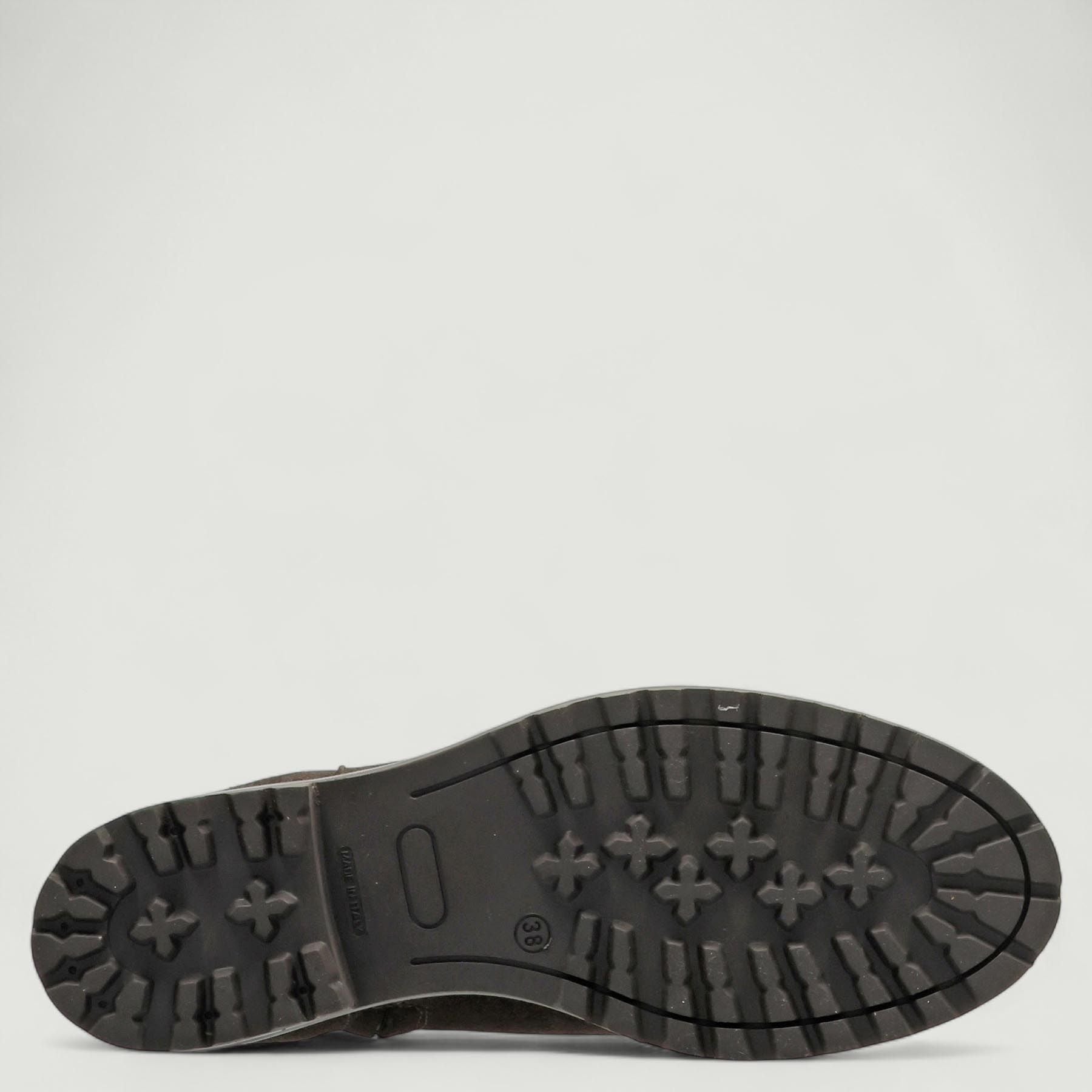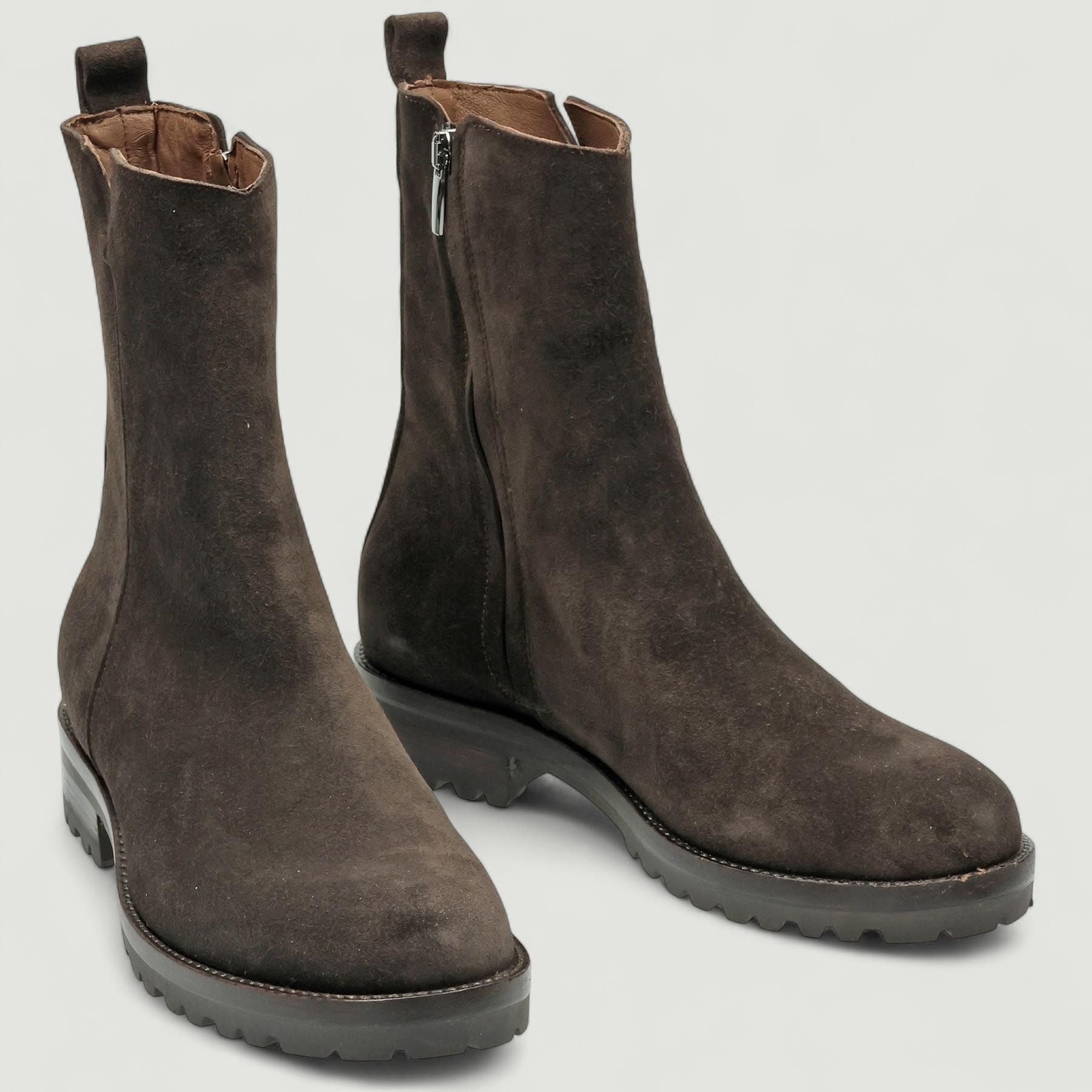Dunkelbraune Wildleder-Ankle-Boots mit kleinem Schlitz am Schaft. Seitlicher Reißverschluss. Lederfutter mit fester Innensohle. 3,5 cm hohe Gummisohle. Duccio Del Duca Damen-Herbst-/Winterkollektion.